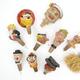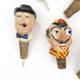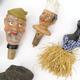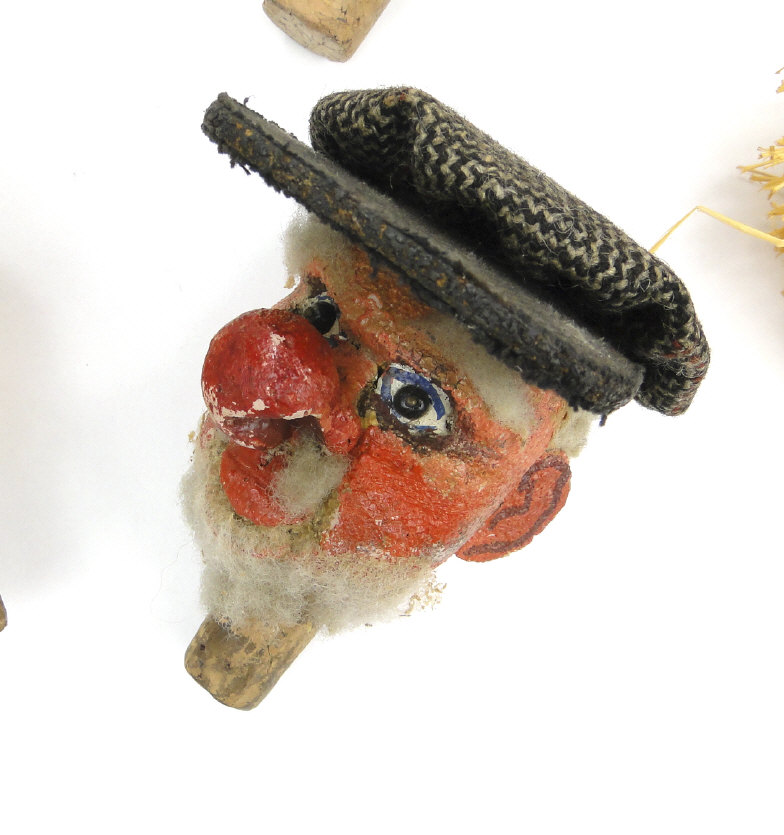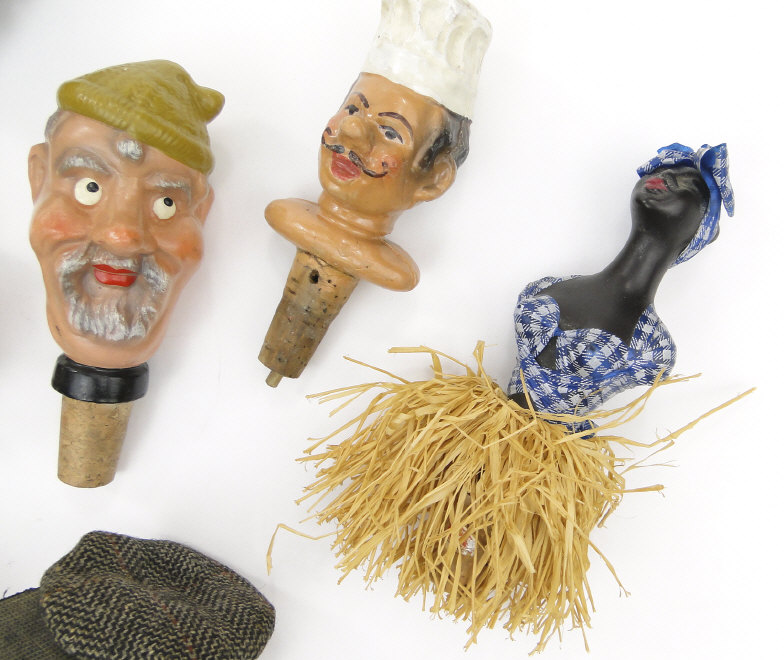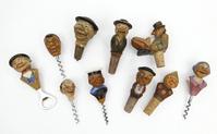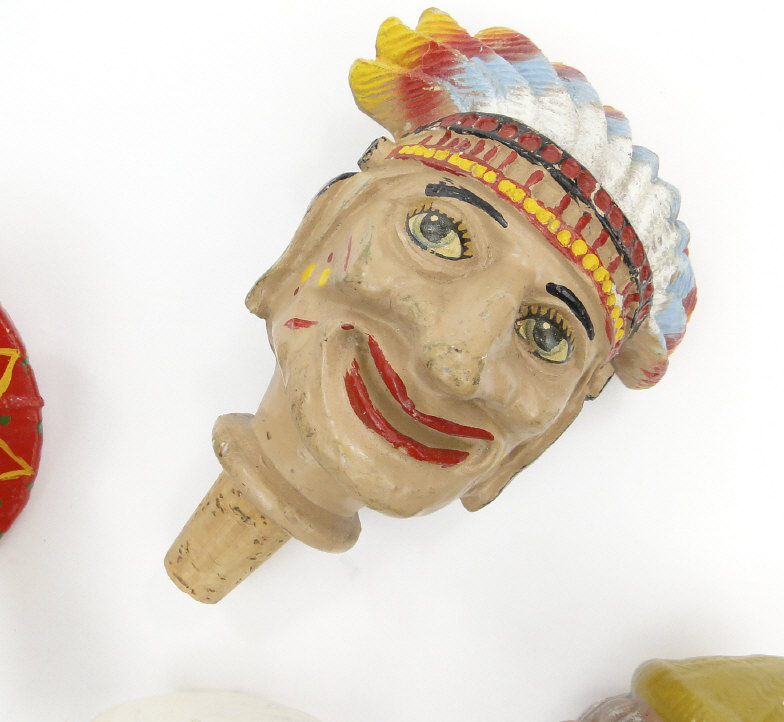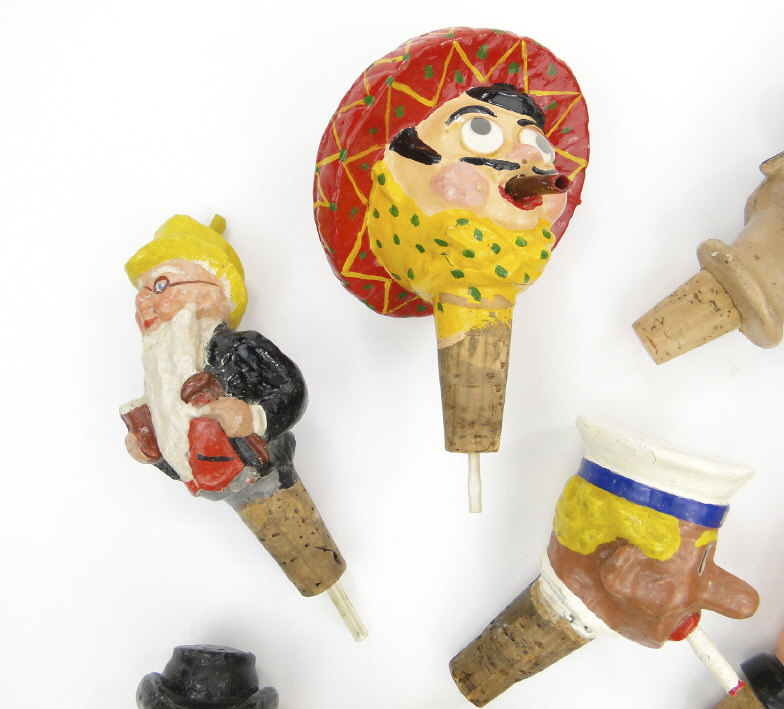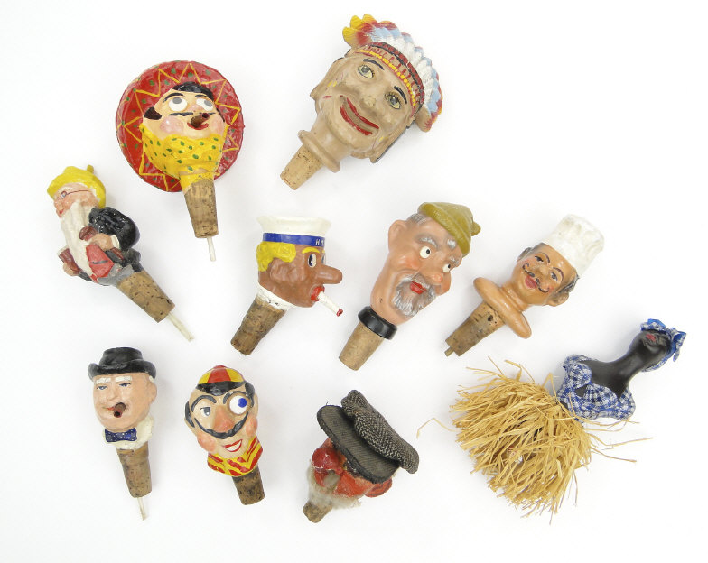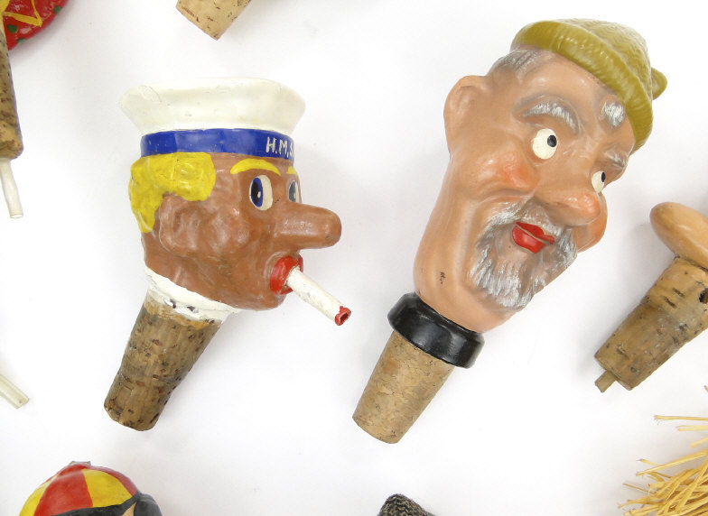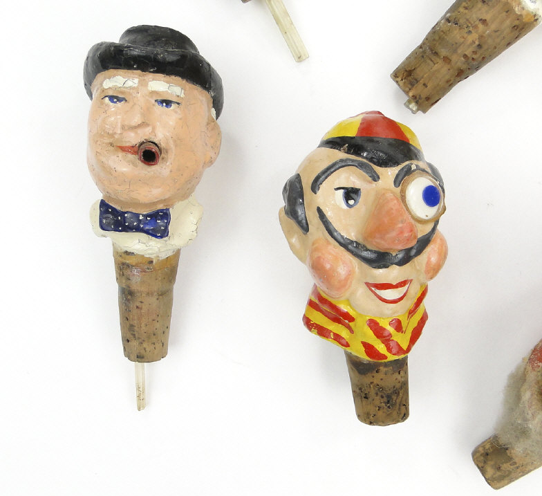 Collection of painted carved wood and papier maché bottle stoppers of figural form, the largest 14cm high