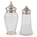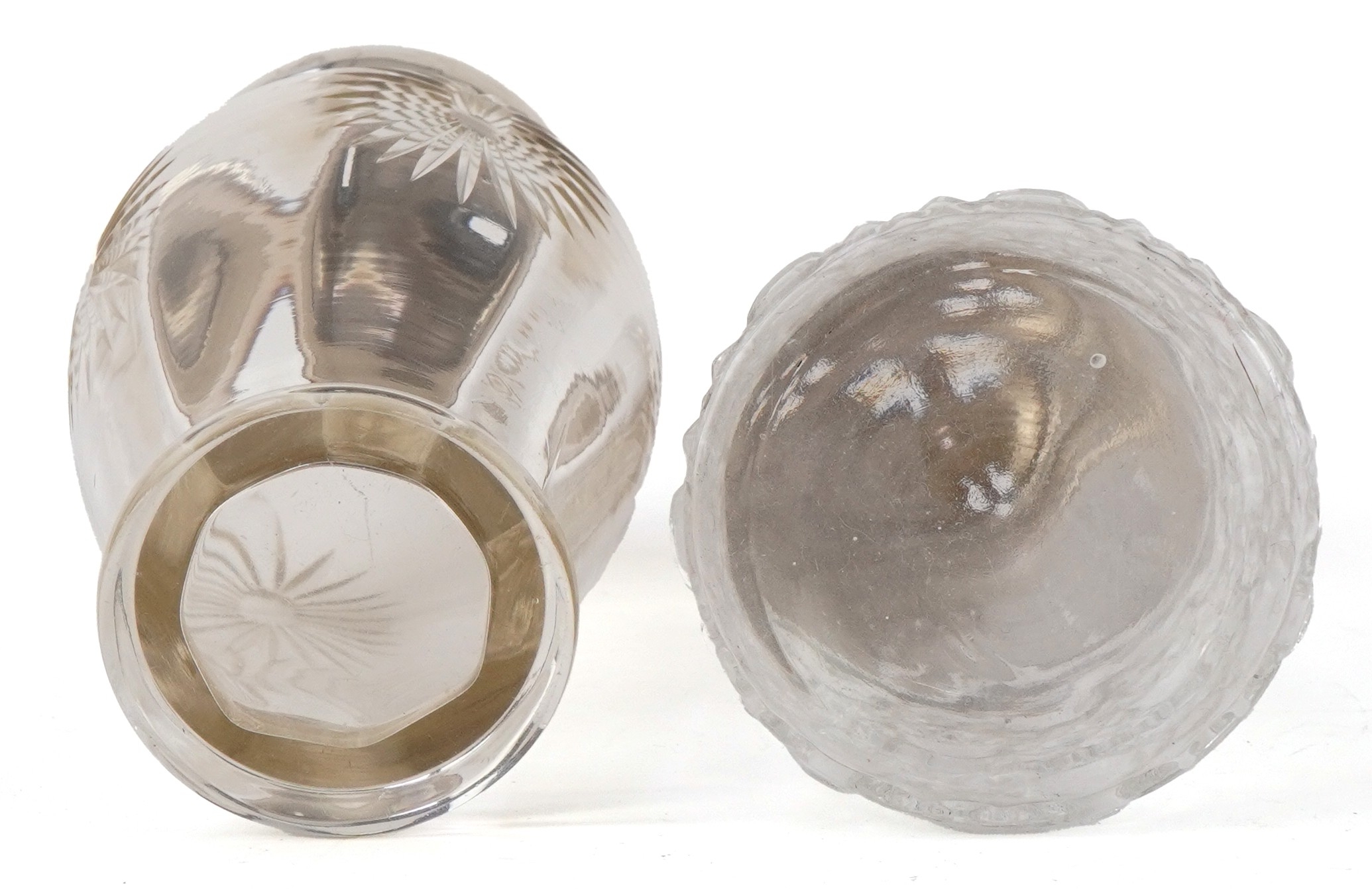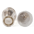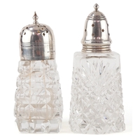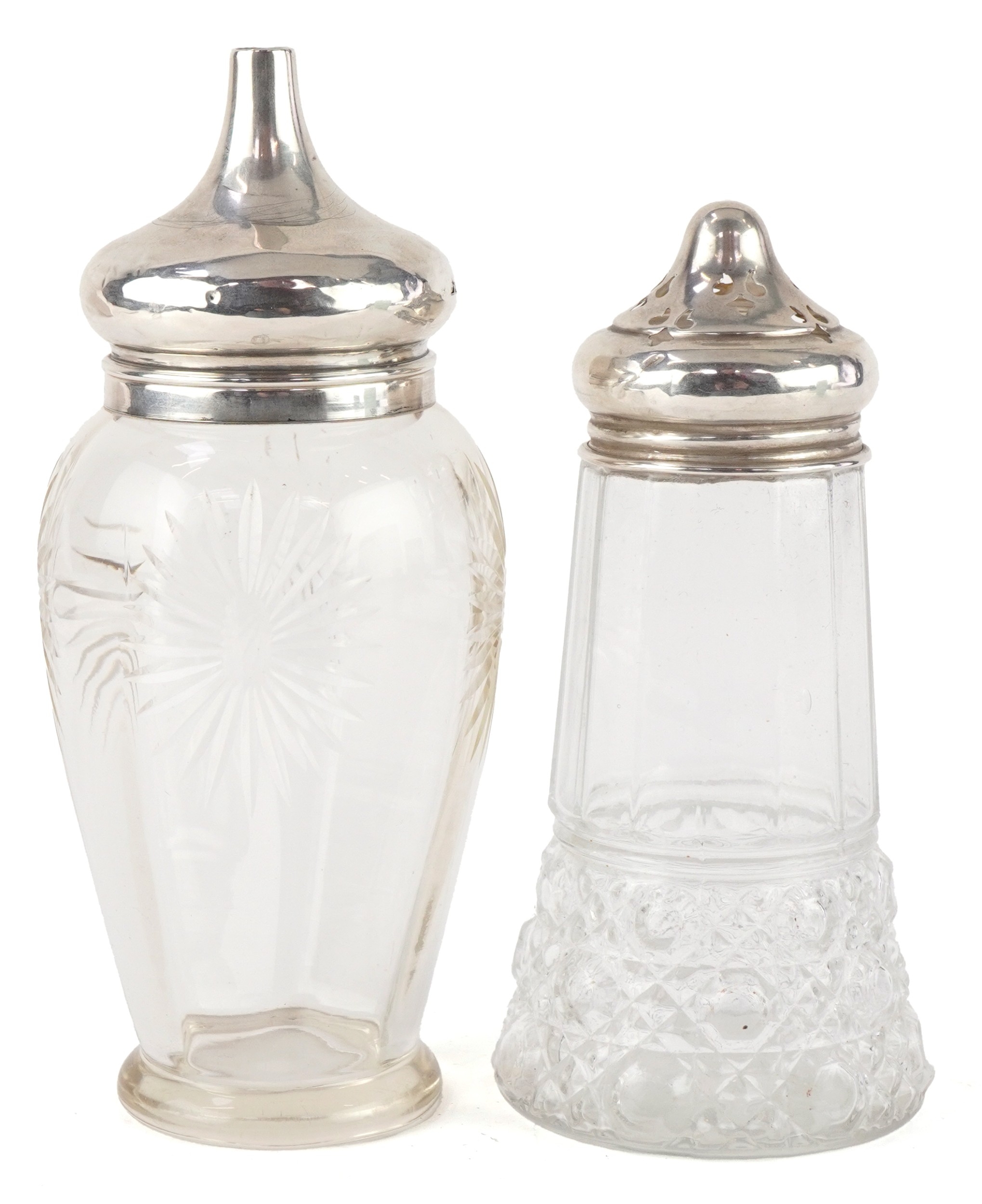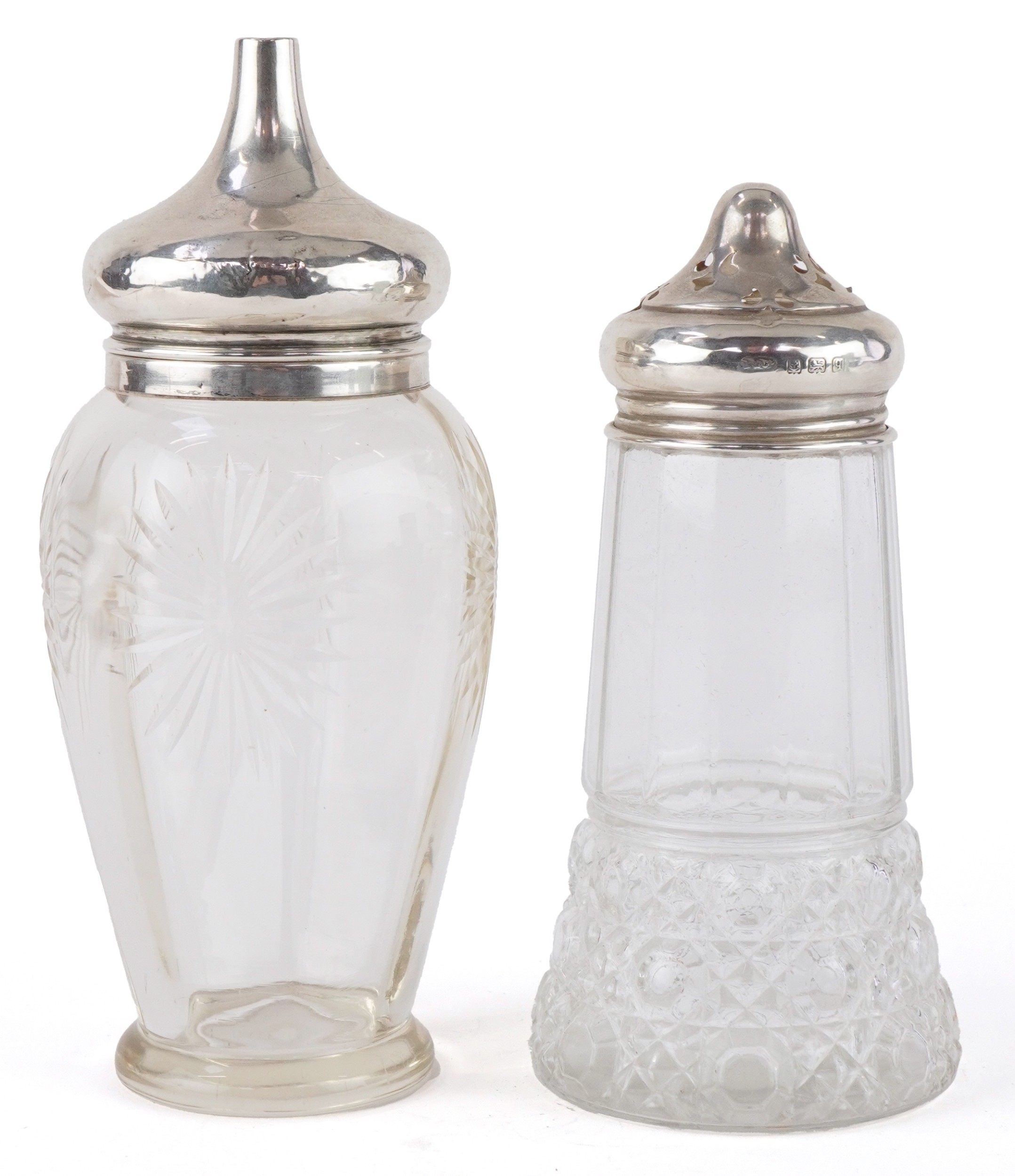 Two antique cut glass casters with silver lids, Birmingham 1915, the largest 17cm high, total weighable silver 18.2g.