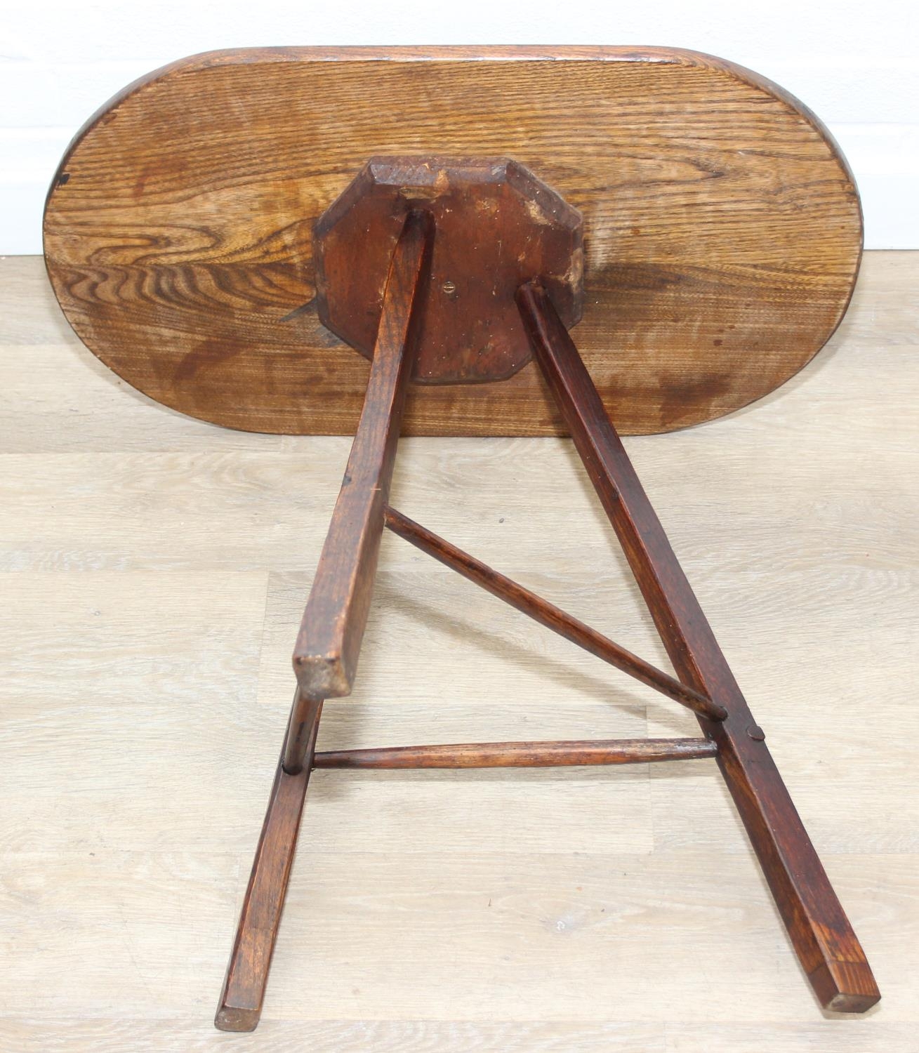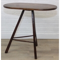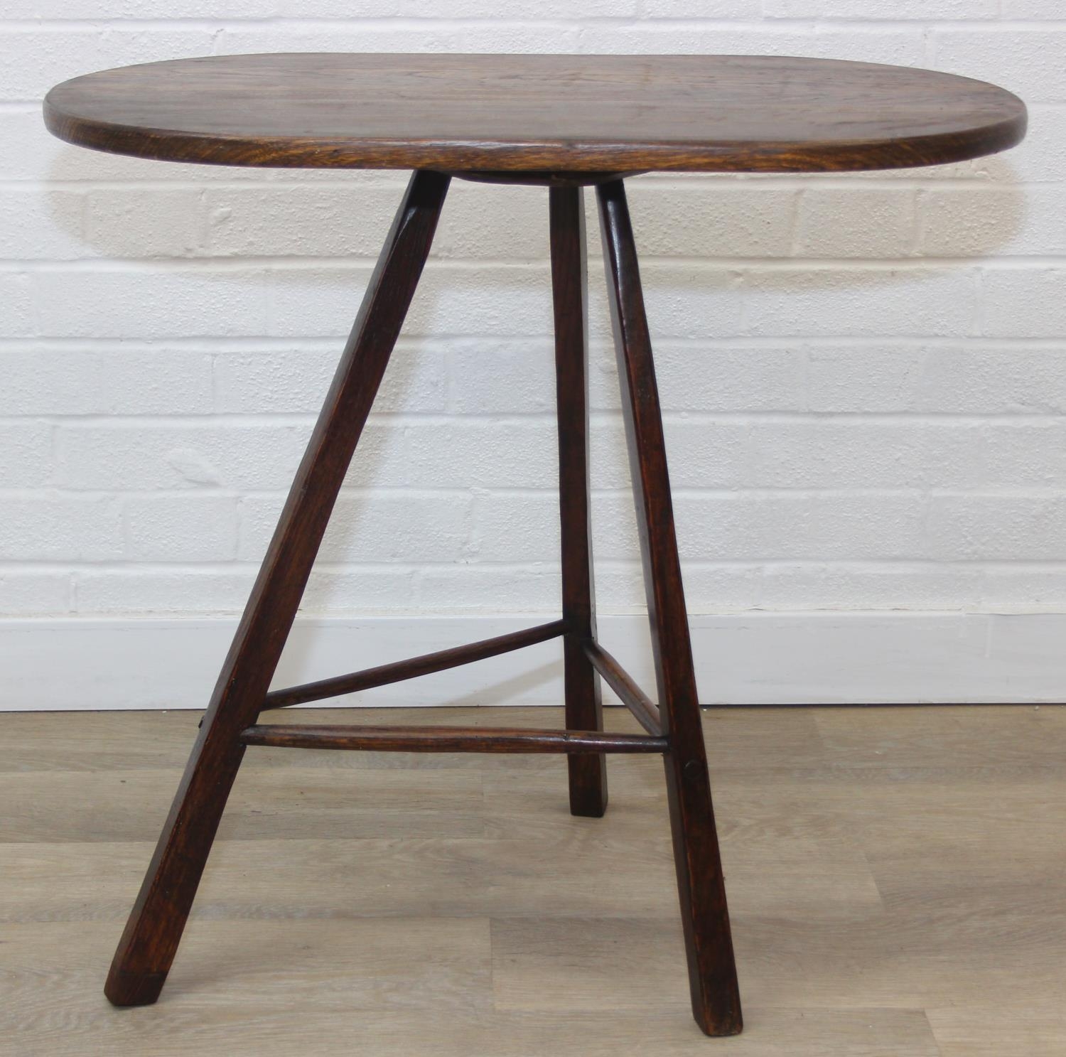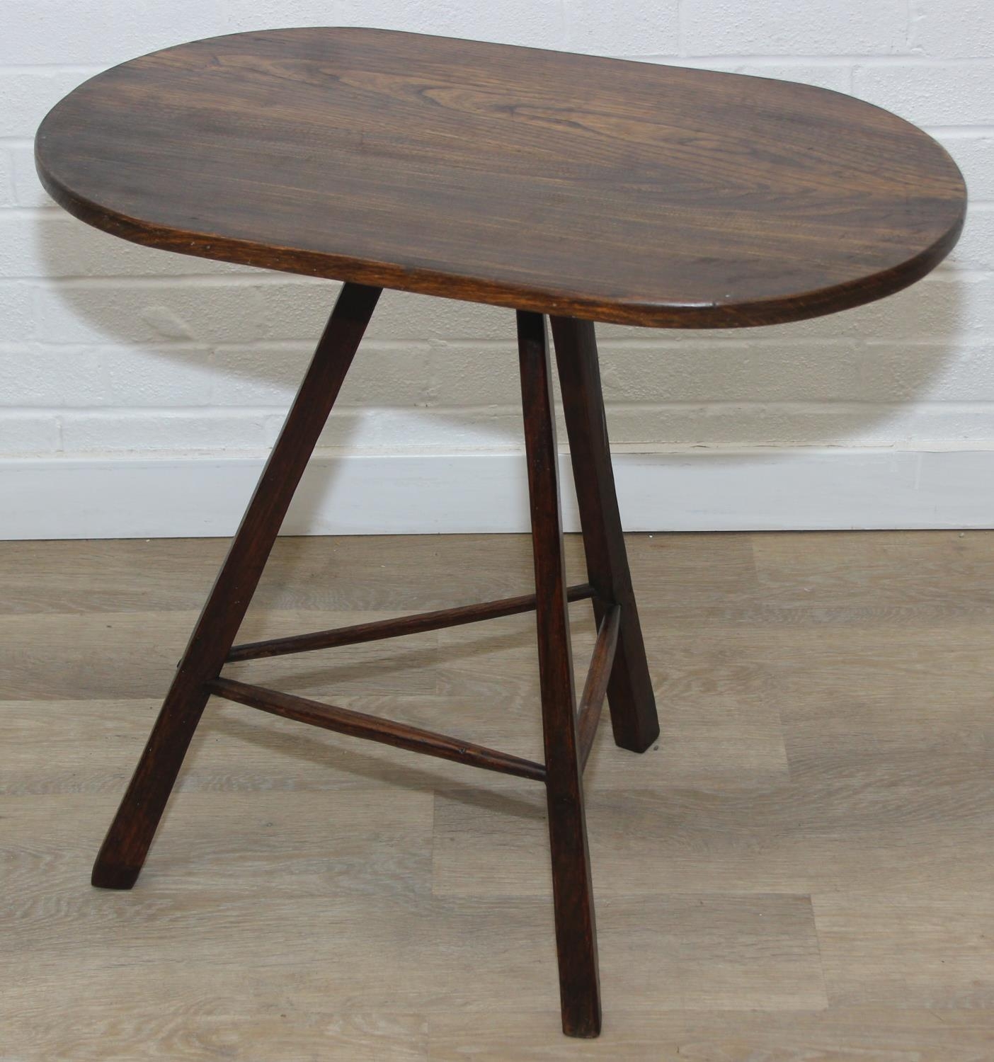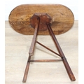 An unusual oak topped table with three legged base, possibly a cricket table, 71cm x 42cm x 67cm