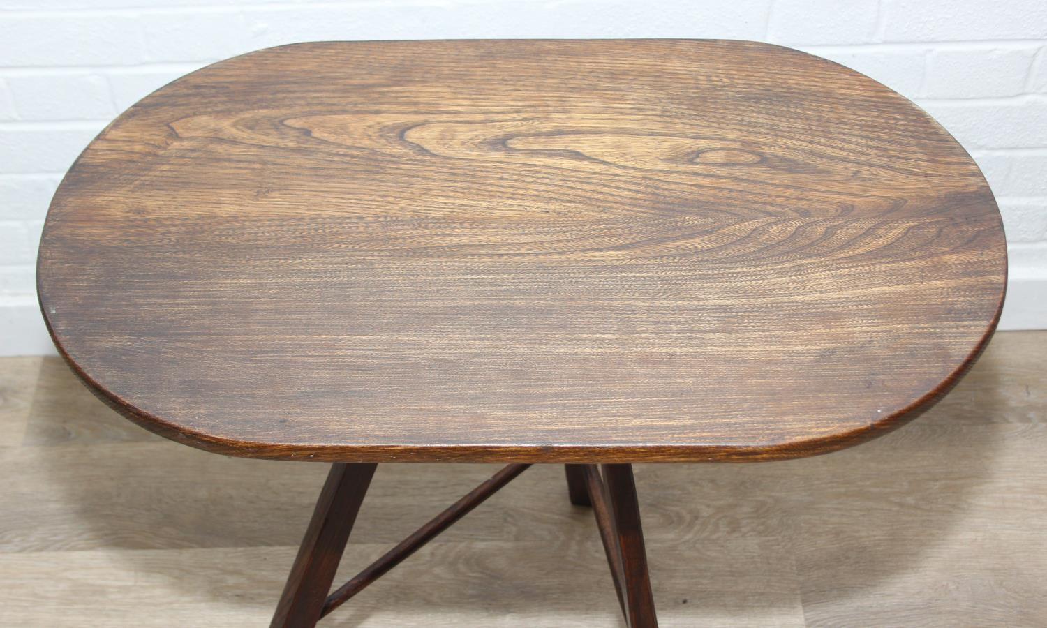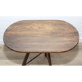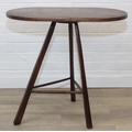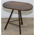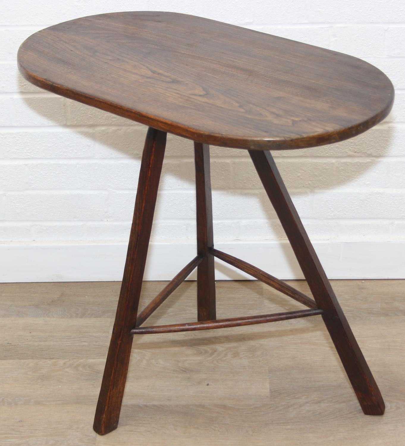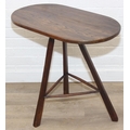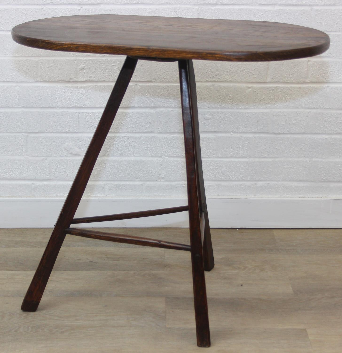 An unusual oak topped table with three legged base, possibly a cricket table, 71cm x 42cm x 67cm