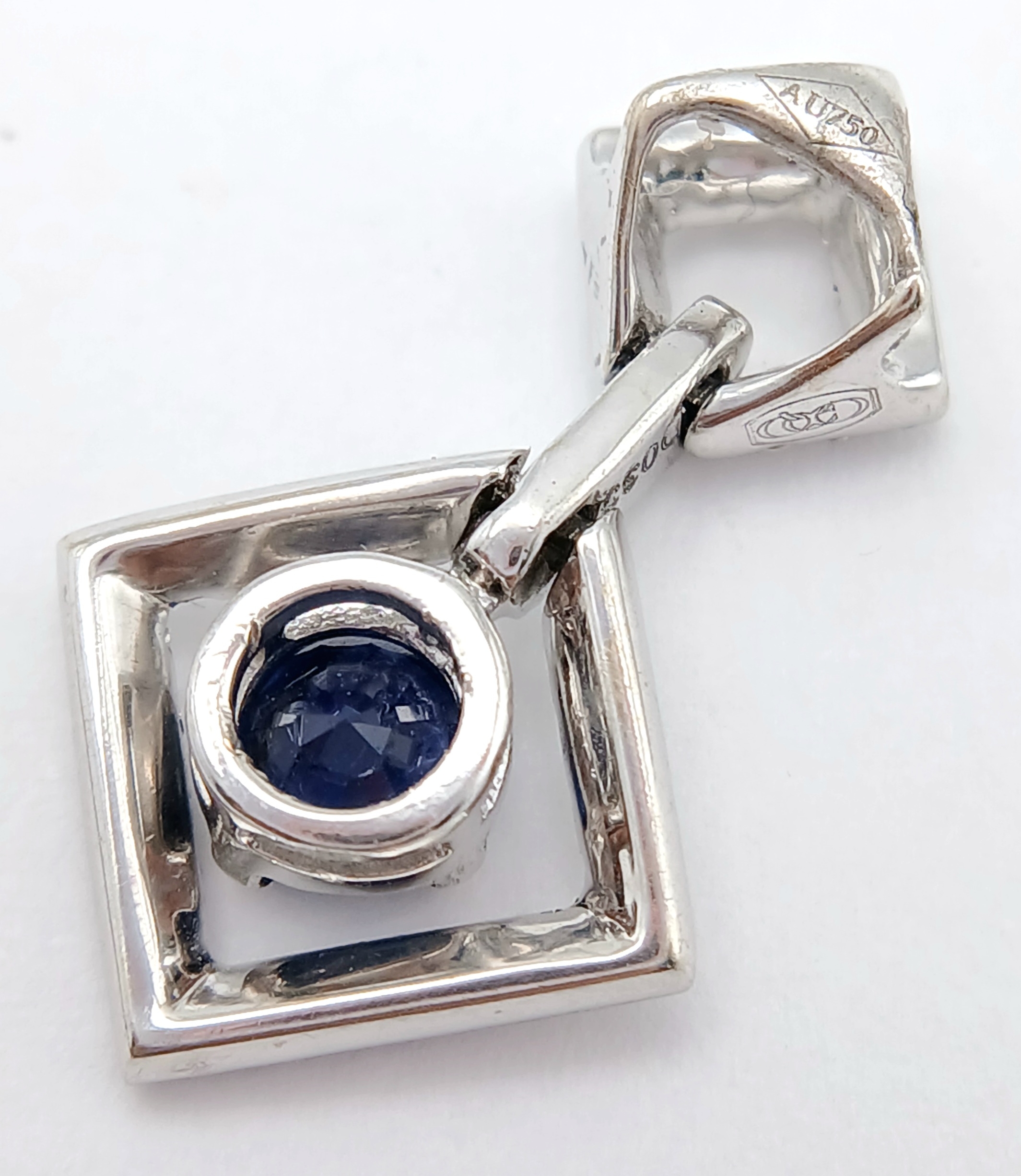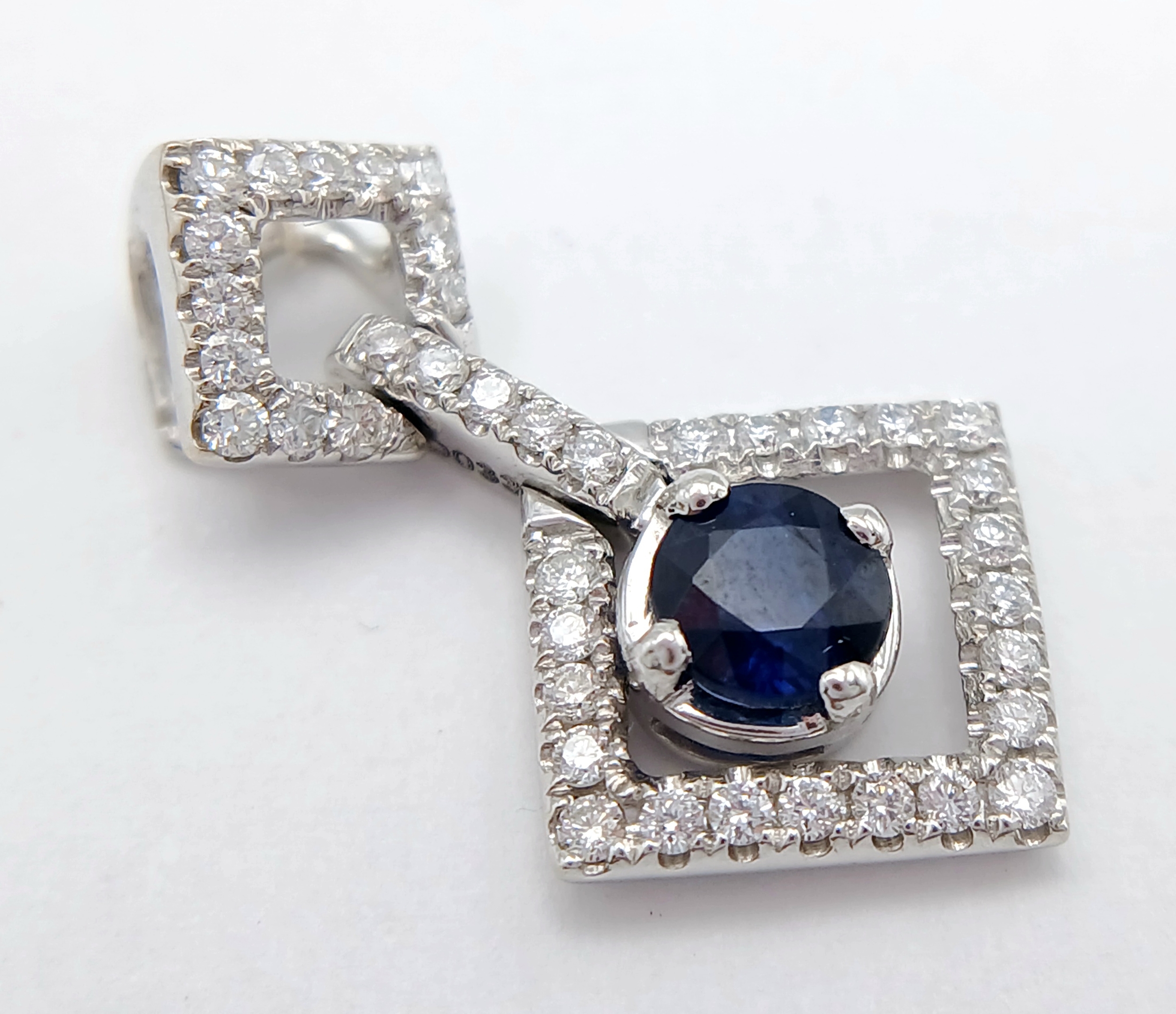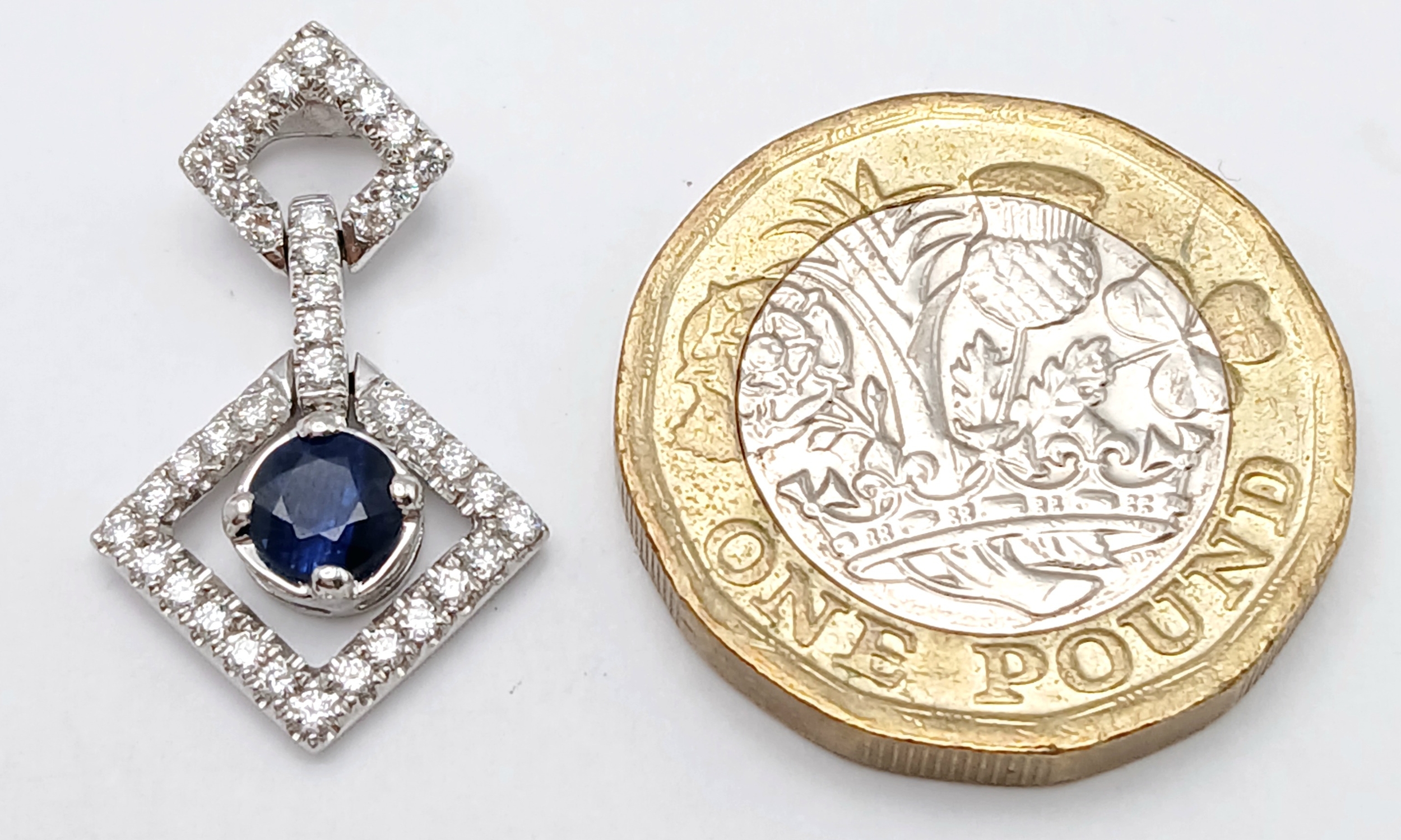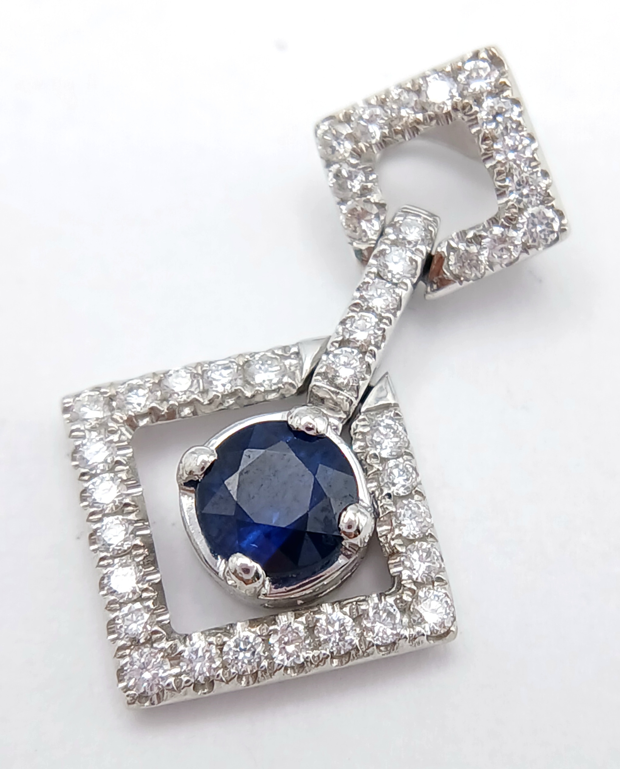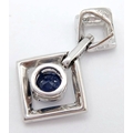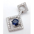 AN 18K WHITE GOLD DIAMOND AND SAPPHIRE DROP PENDANT. 0.33CTW DIAMONDS AND 0.60CT SAPPHIRE. 2.5G.