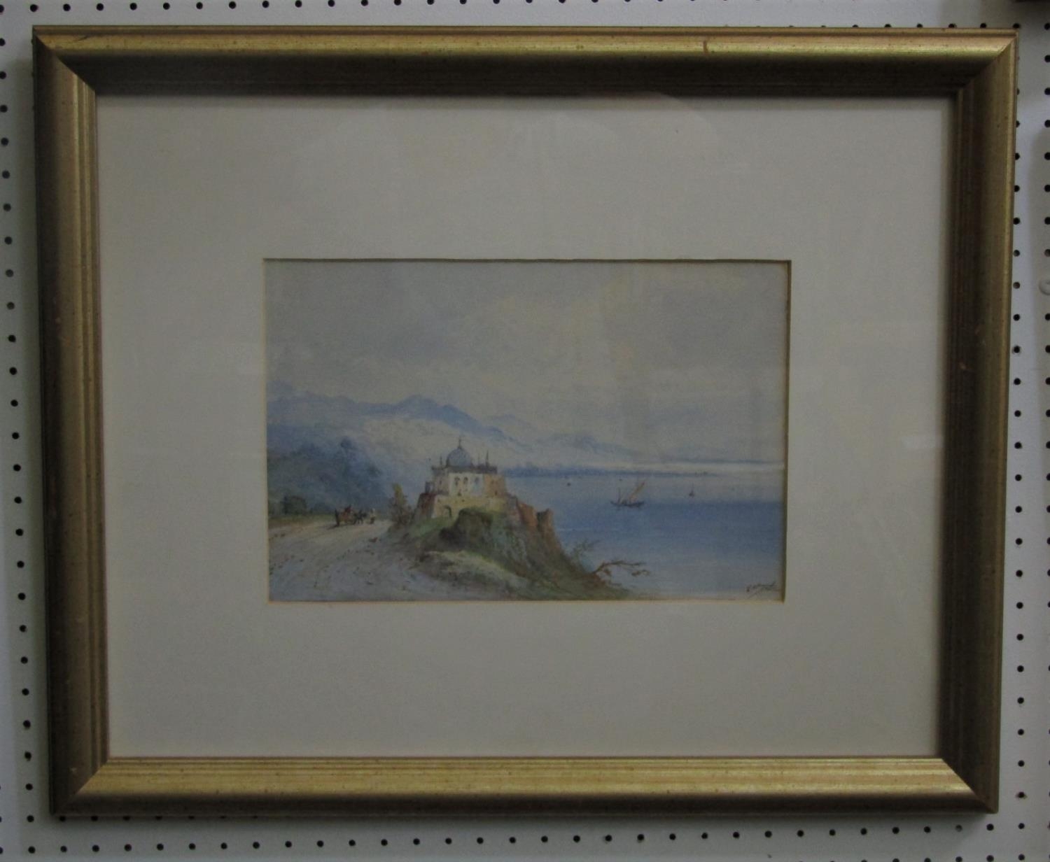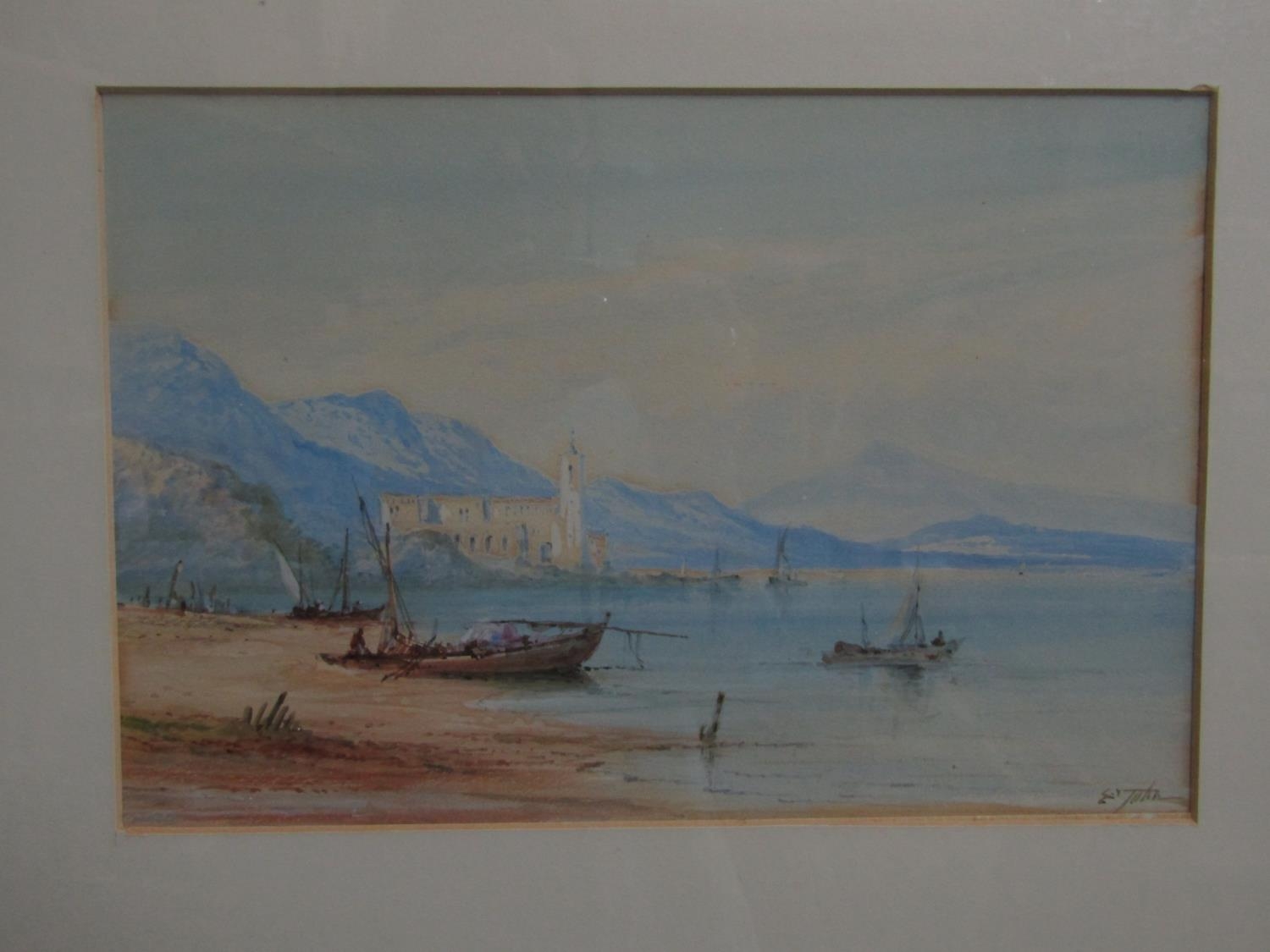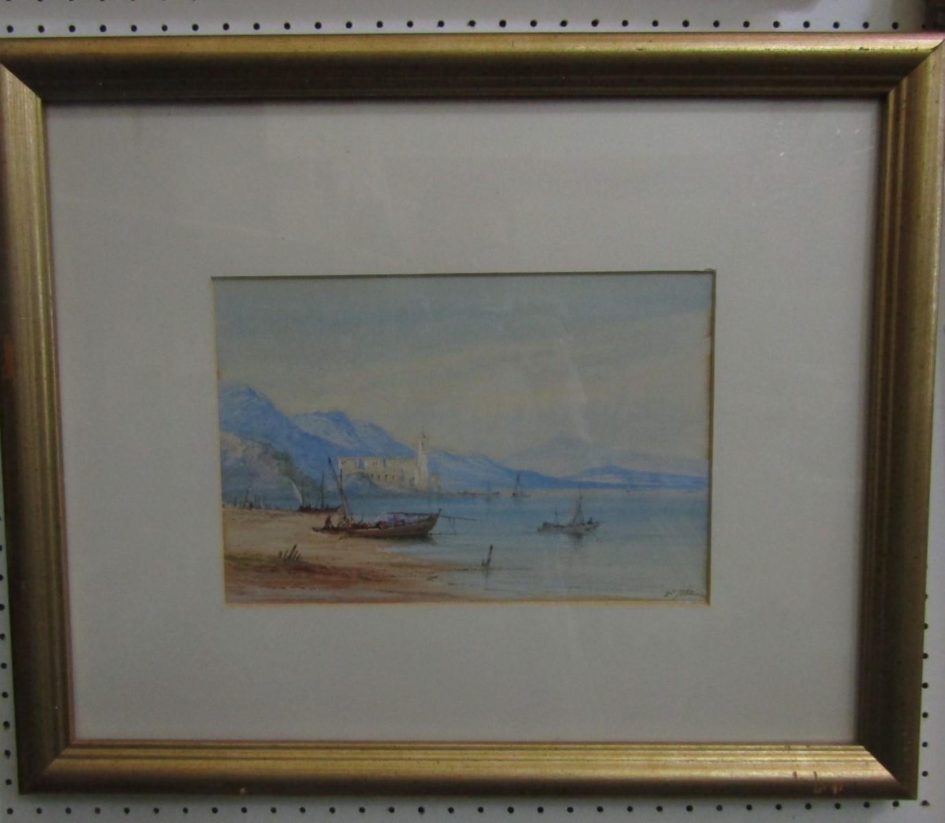 Edwin St John (British active 1880-1890) - A pair of continental lake scenes with fishing boats, figures, etc, gouache on paper, both signed, 20 x 30cm, in gilt frames