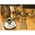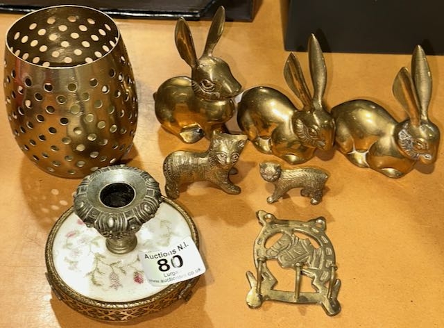 Collection of Brass Incl Rabbit Trio & Vintage Embroidered Candle Holder