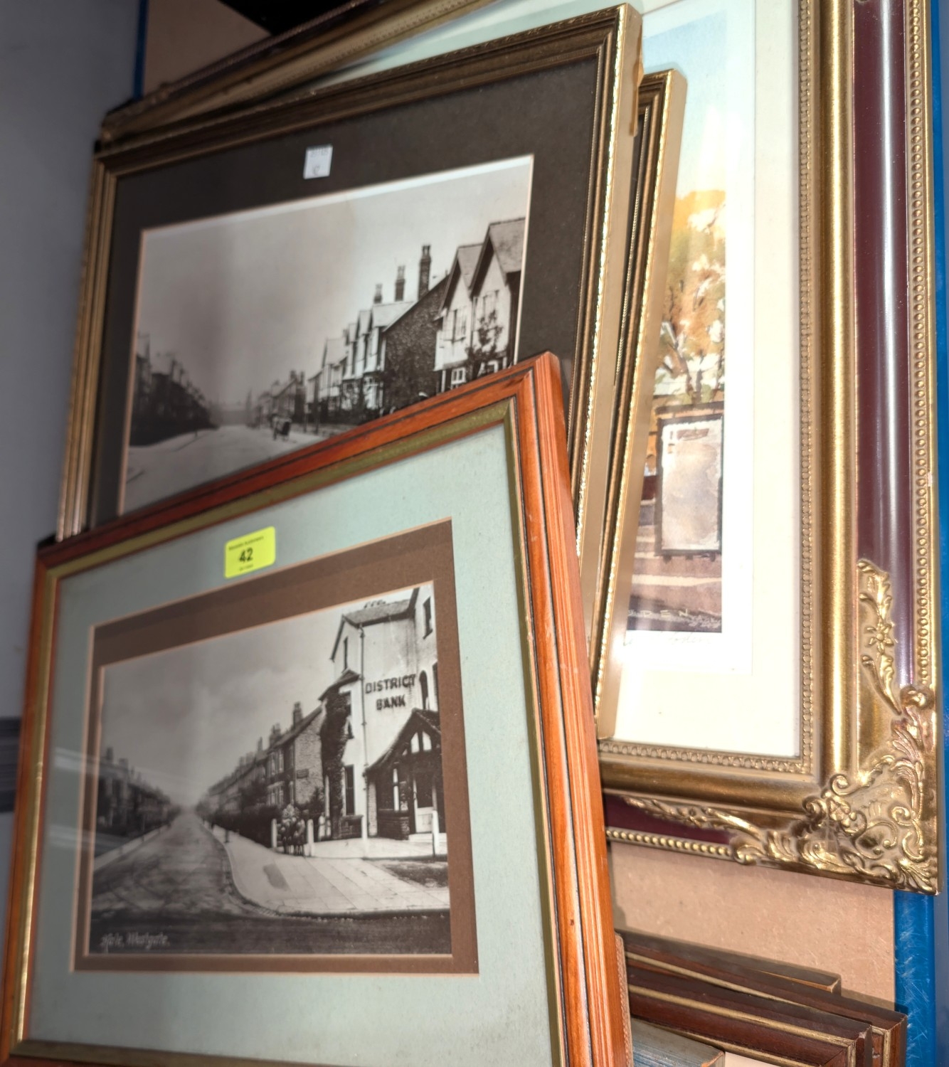 4 reproduced photos of old Altrincham and Hale, 16 x 25cm framed and glazed and a large limited 'Edit Print', "Hale Station".