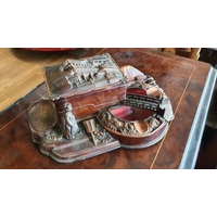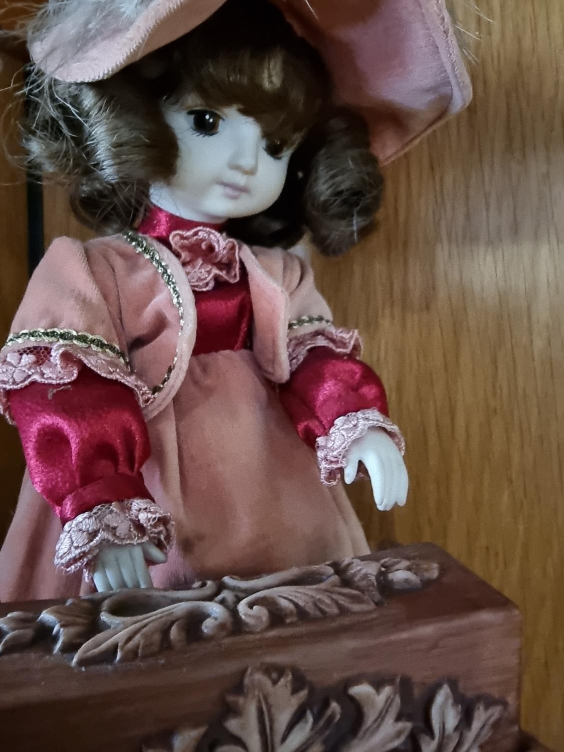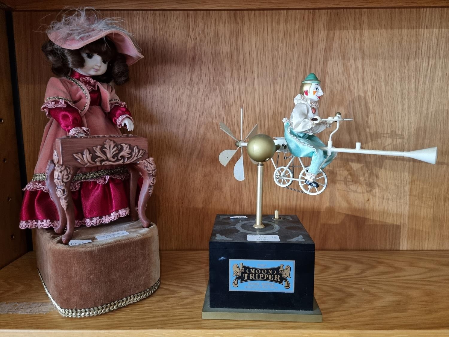 A mid-20th century antique style musical automaton in the form of a young girl playing the piano, clothed in Victorian style dress and bonnet, raised on a velvet covered base with fringe trim together with, a musical box 'Moon Tripper' flying bicycle (2)
