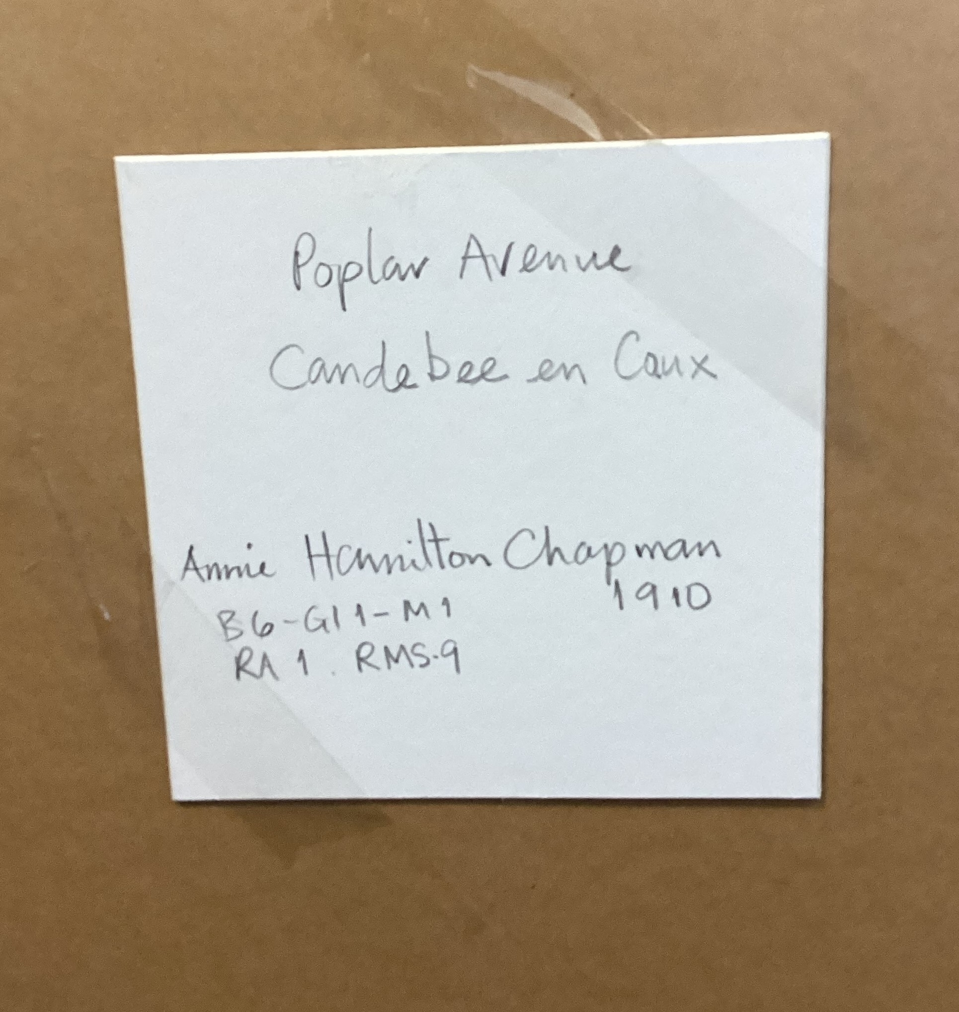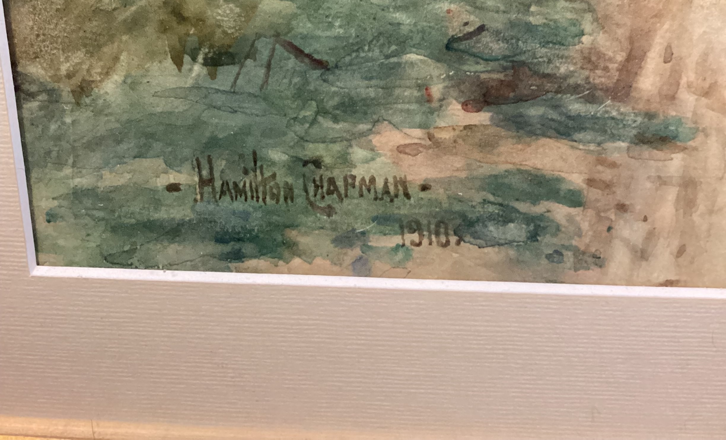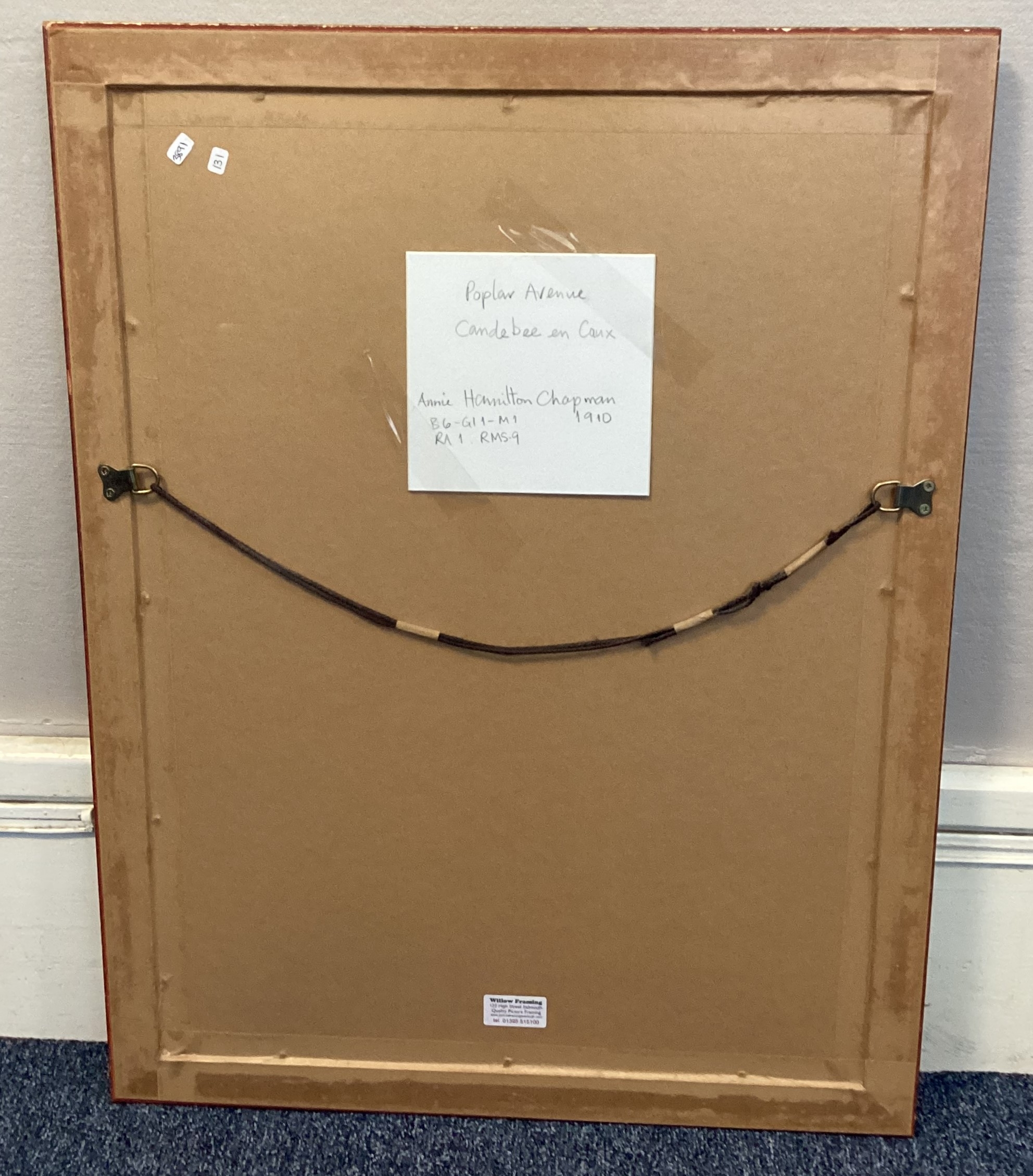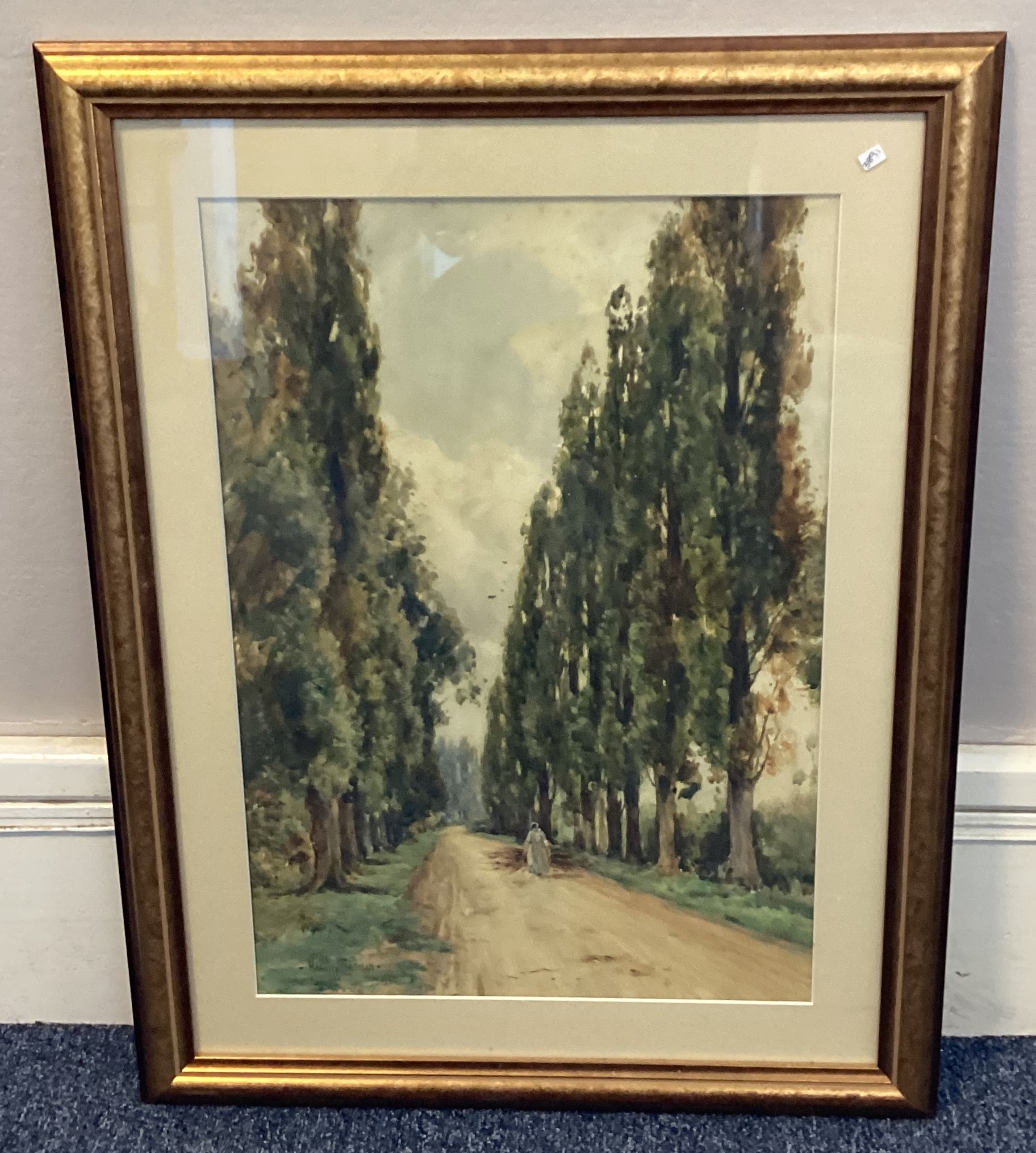 ANNIE HAMILTON CHAPMAN: (British, 1881 - 1923): A gilt framed and glazed watercolour entitled "Poplar Avenue" depicting a tree lined lane with figure of lady carrying sticks. Signed to bottom left and dated 1910. Labelled verso. Approx. 33.5 cm x 48.5 cm (ss). Est. £40 - £60.