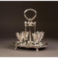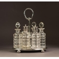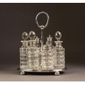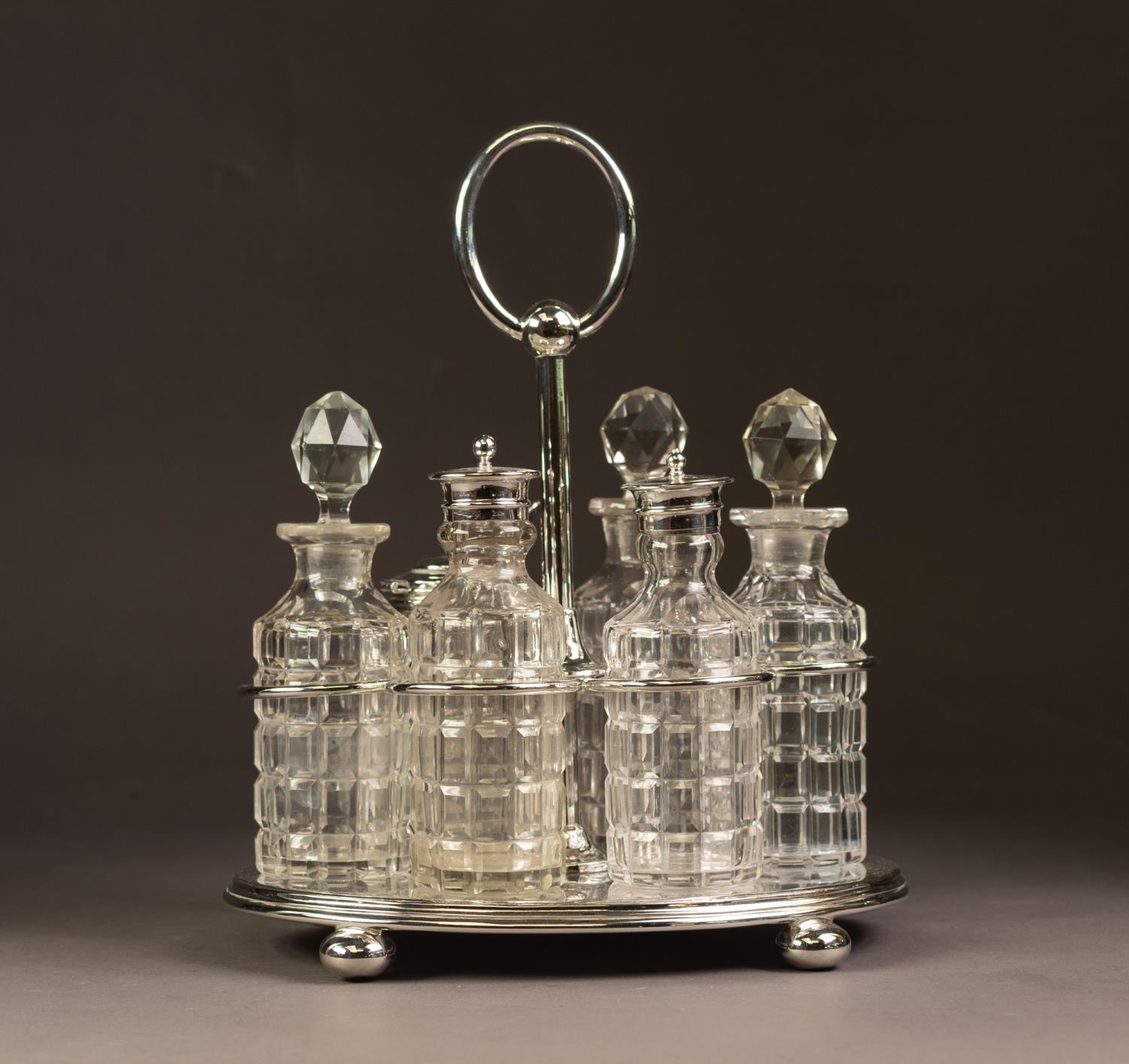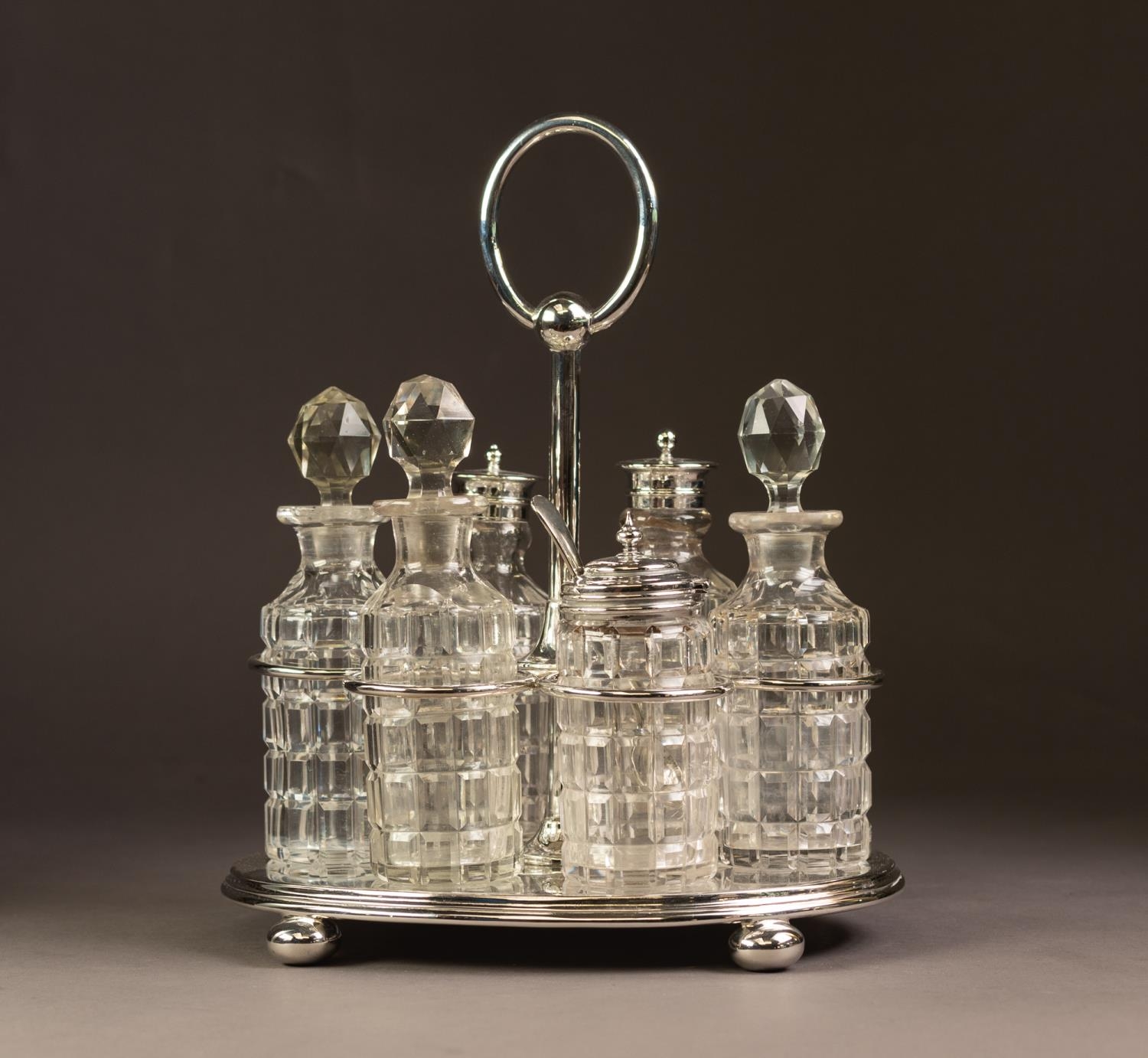 ELECTROPLATED SIX BOTTLE CRUET STAND, of oval form with moulded border, compressed ball feet and loop handle, housing a set of six cut glass bottles, three with stoppers and three with electroplated lids