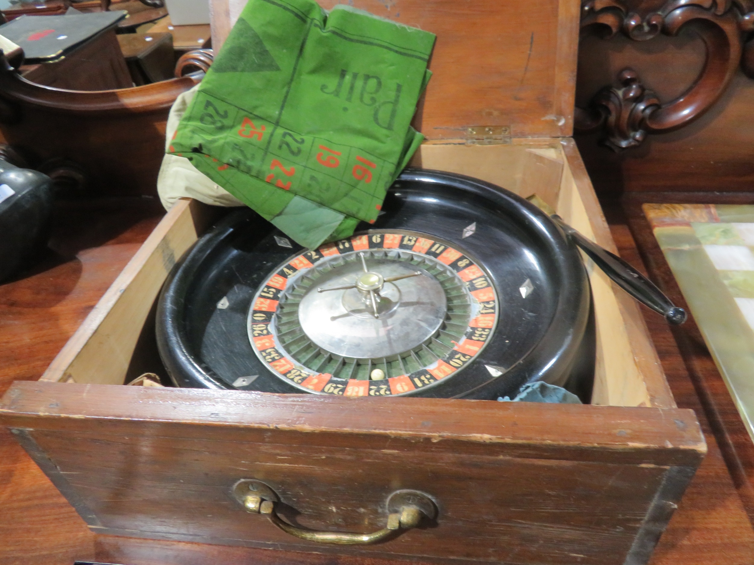 Wooden cased roulette wheel together with mat, bag of pennies, etc