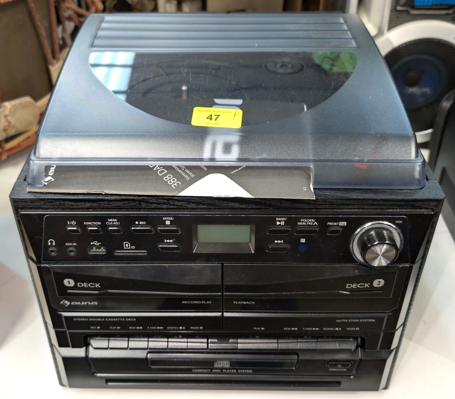 An Auna stacking system with deck, tuner, CD player and twin speakers.