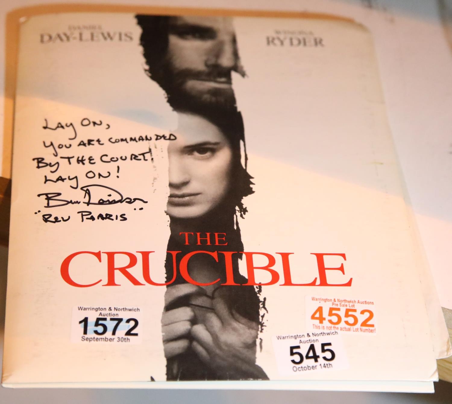 Press pack for The Crucible starring Daniel Day Lewis signed by Bruce Davidson with twenty photographic prints. P&P Group 1 (£14+VAT for the first lot and £1+VAT for subsequent lots)