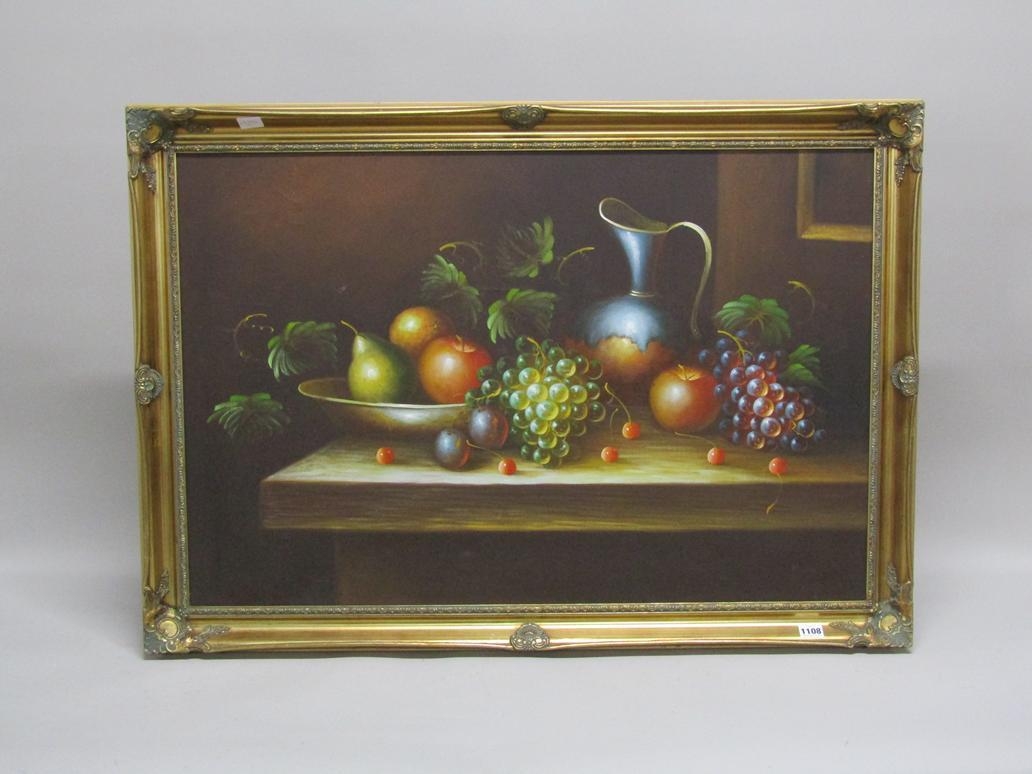 P VAINES - STILL LIFE FRUIT AND PITCHER, OIL ON CANVAS, FRAMED