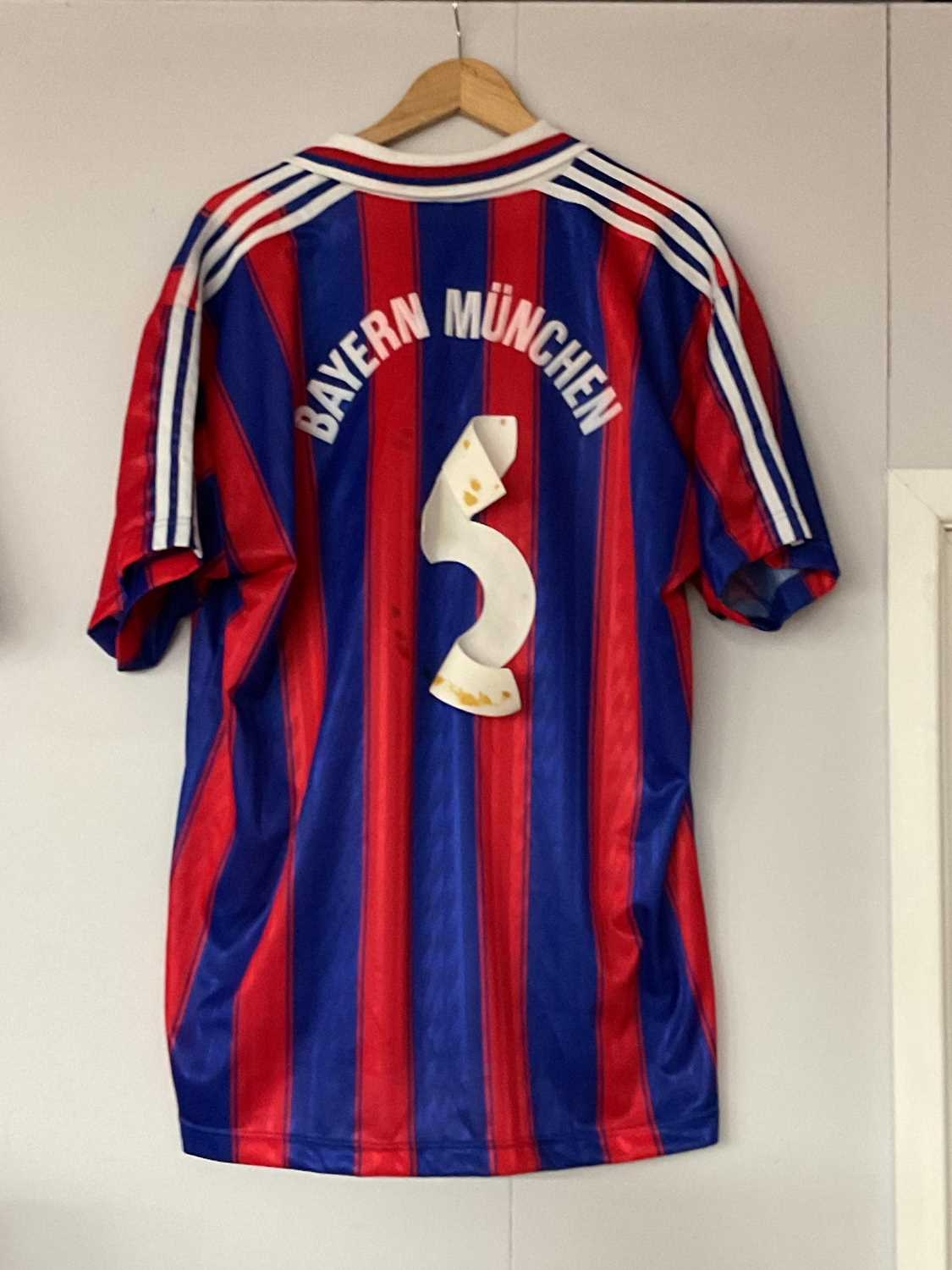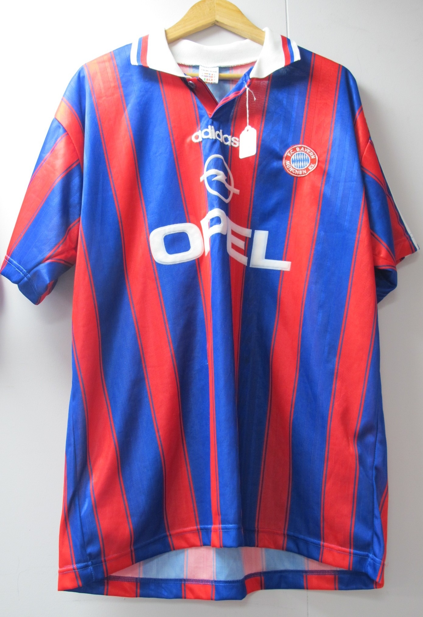 Bayern Munich 'Adidas' Red & Blue Striped Home Shirt, circa 1995-97 numbered '3' (loose), bearing 'Opel' logo, made in England size 46/48