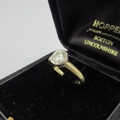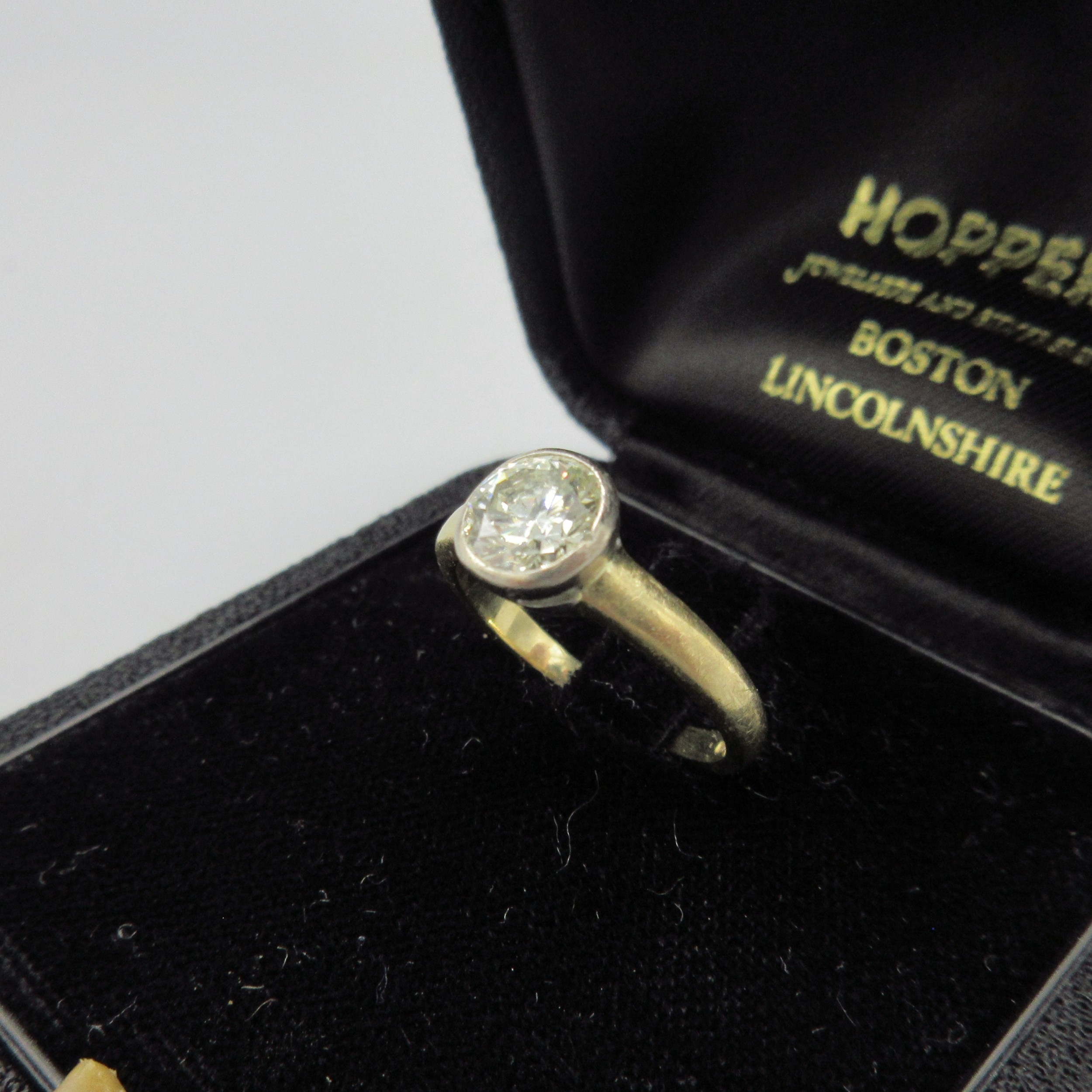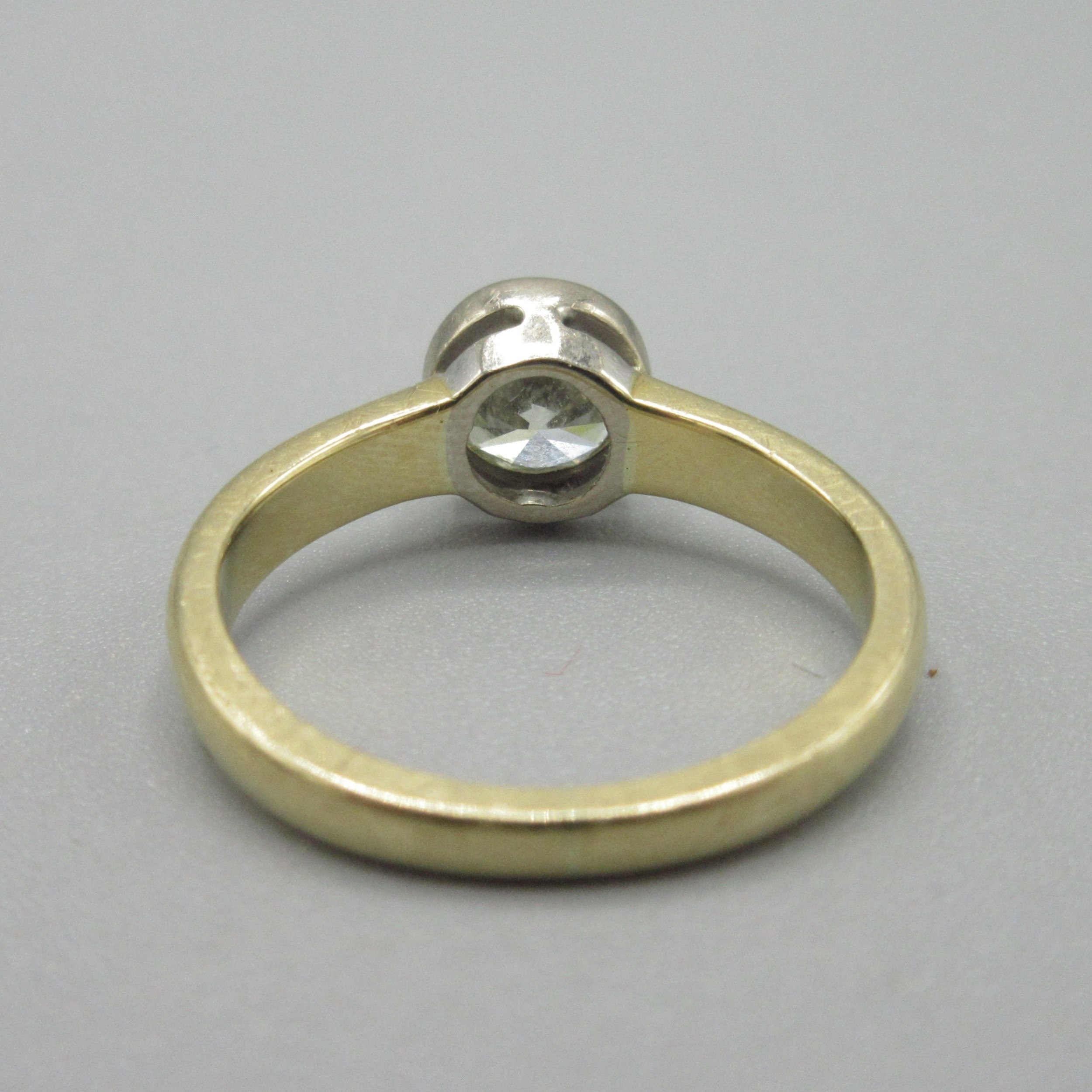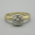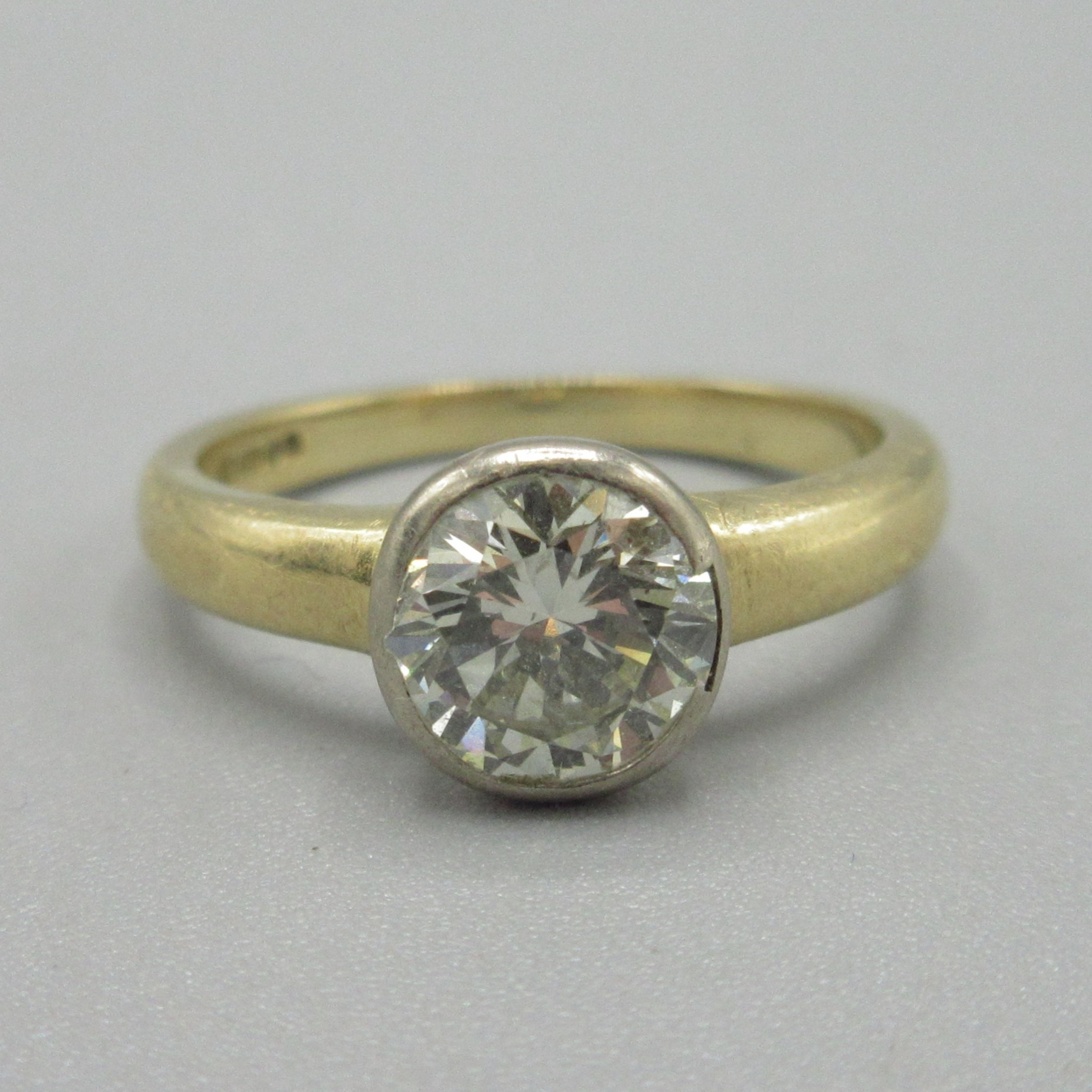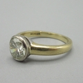 18ct yellow gold diamond ring, approximately one carat diamond in bezel setting, stamped 750, size J, 3.5g