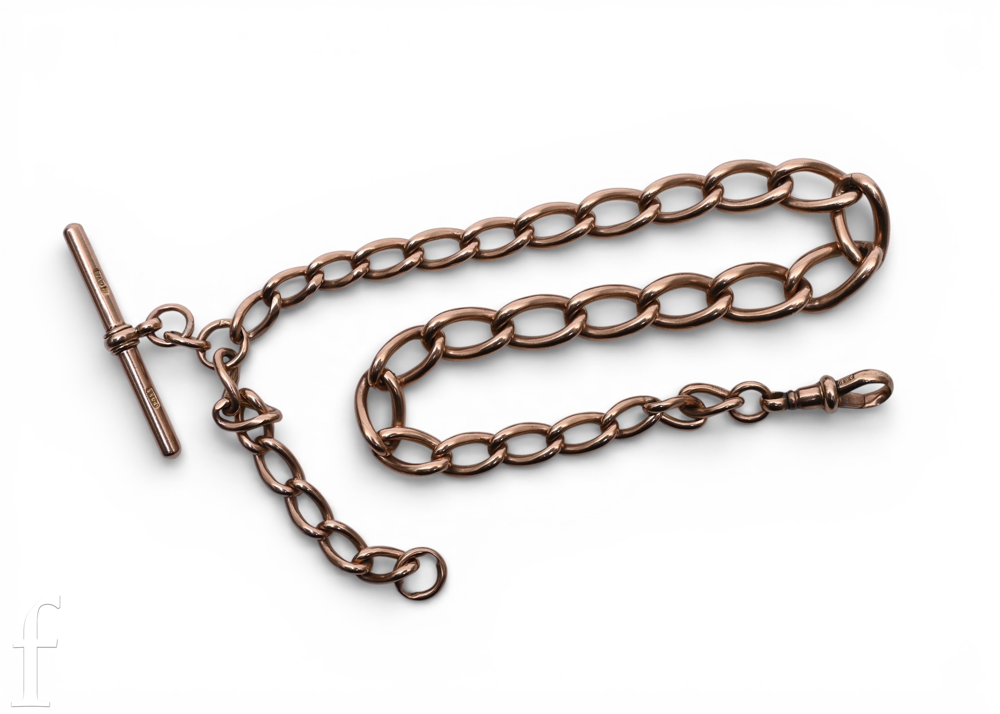 A 20th Century 9ct rose gold graduated curb link Albert chain, with graduated links, T bar and lobster claw clasp, stamped '9 .375', length 36.5cm, weight 45.9g.