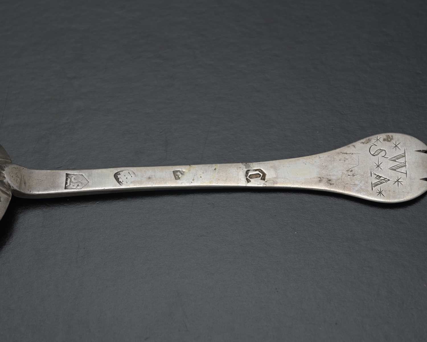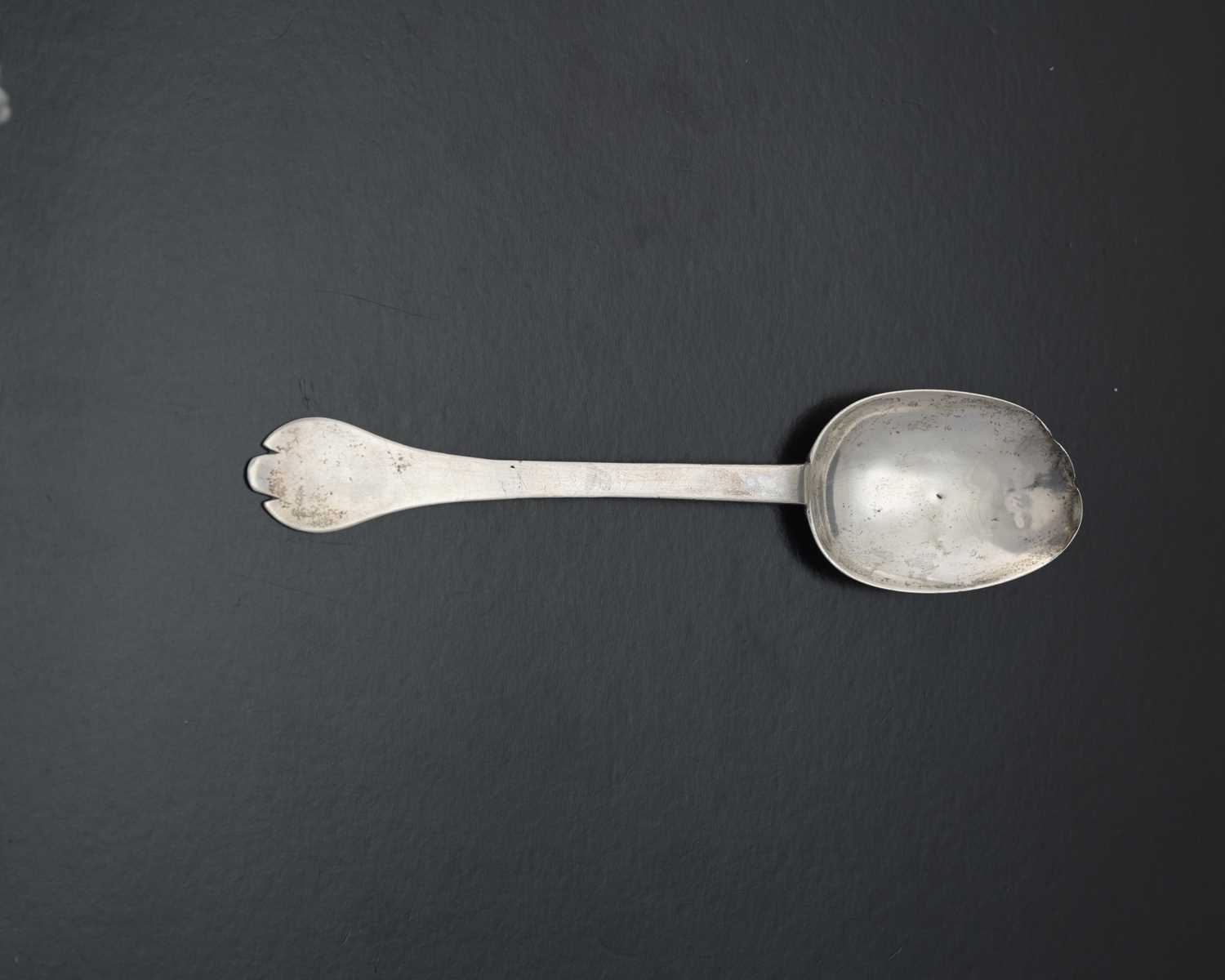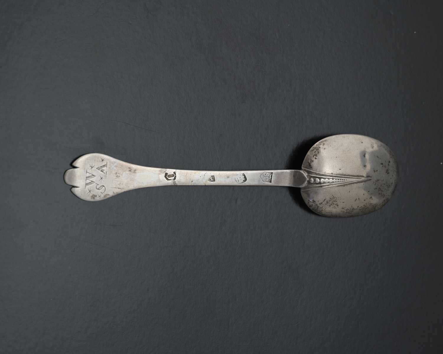 A William and Mary silver trefid spoon, by Stephen Coleman, London 1691, with beaded rat tail, the terminal initialled 'W / S.A', length 19.4cm, weight 48g/1.54ozt approx (a/f)