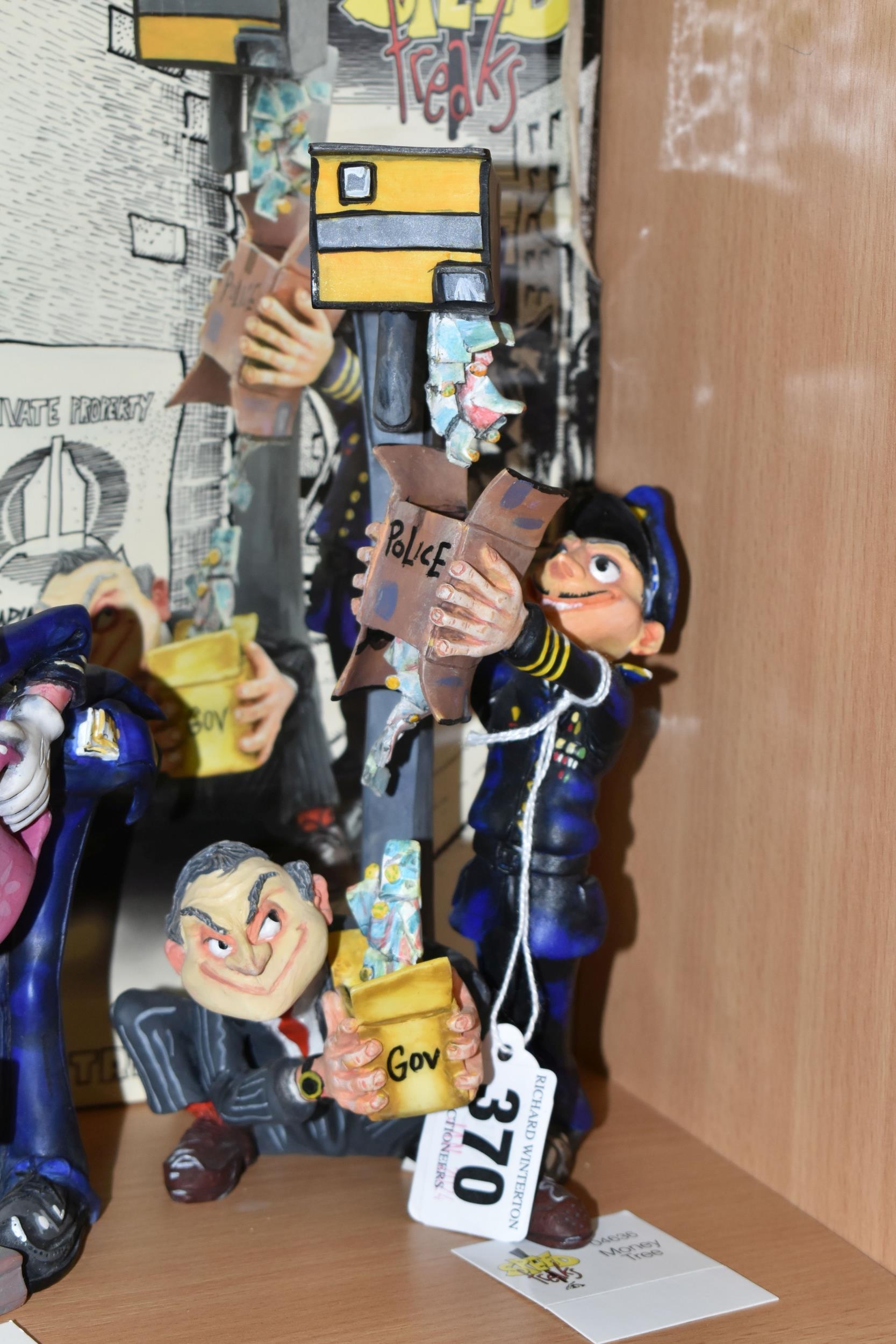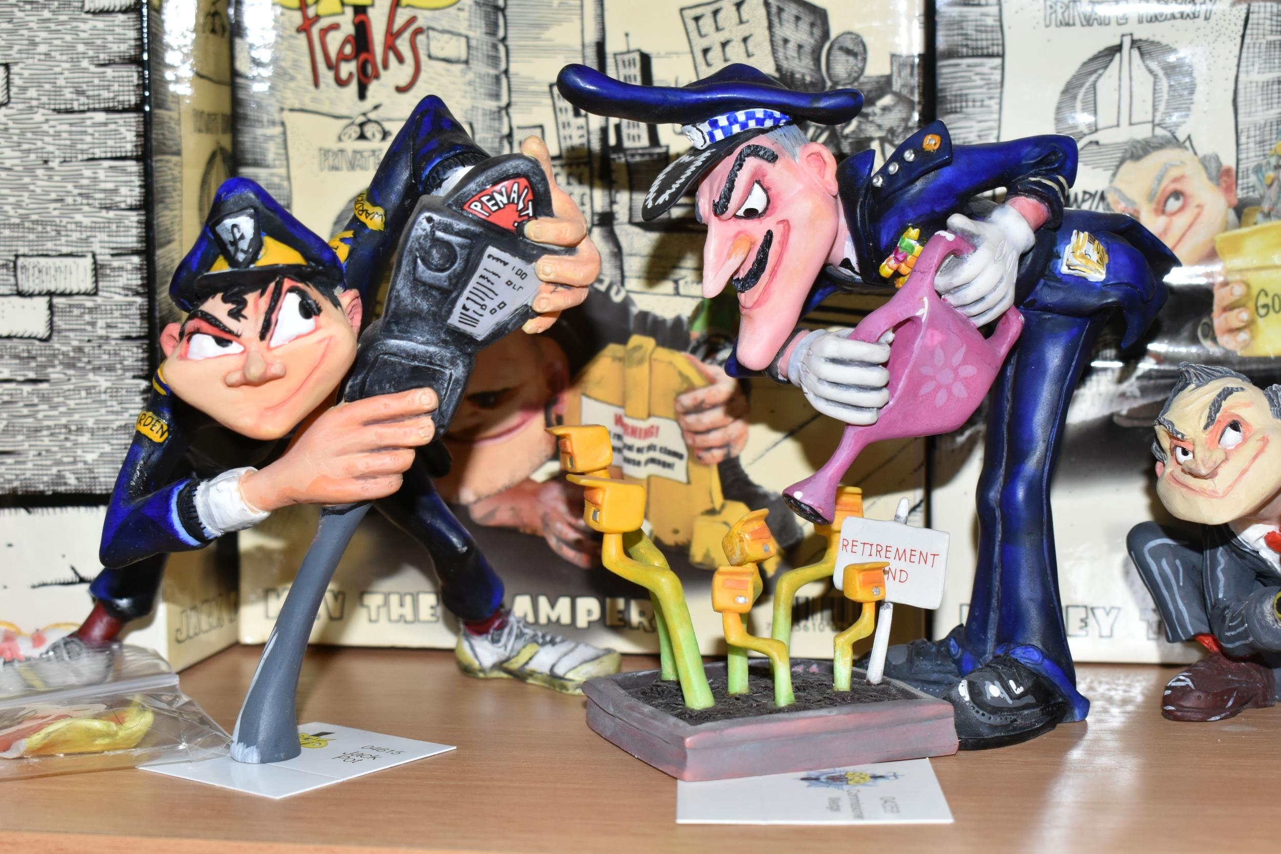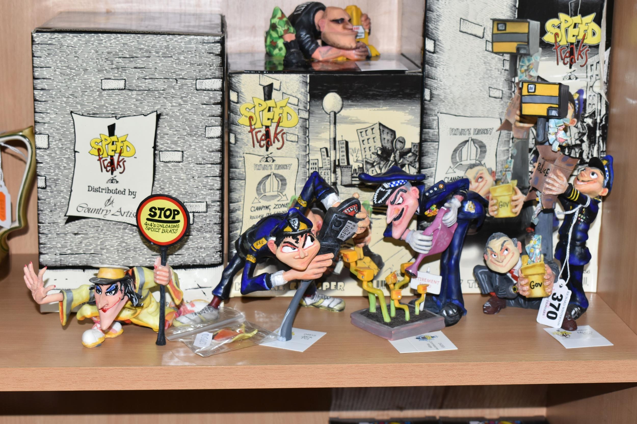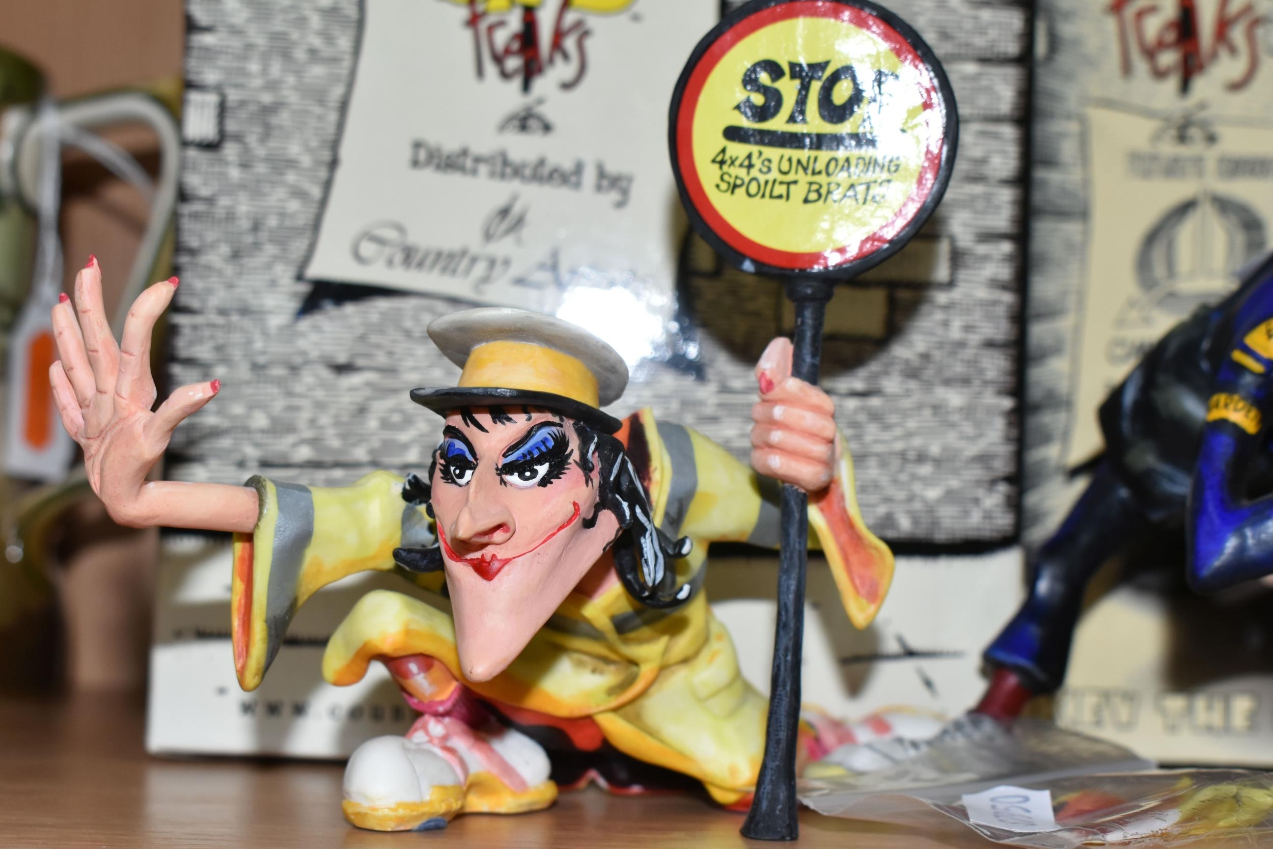A COLLECTION OF COUNTRY ARTISTS 'SPEED FREAKS' FIGURES, comprising a boxed 'Jack Pot' 04615, a boxed 'Kev the Camper' 04356, a boxed 'Money Tree', together with 'Commissioner Wedge' 04358, and 04354 'Looney Linda The Lollipop Lady' (5 + 3 boxes) (Condition Report: Linda has a broken jacket collar, others appear in fair condition, a little dusty, with cardboard labels, boxes have scuffs and scratches)