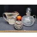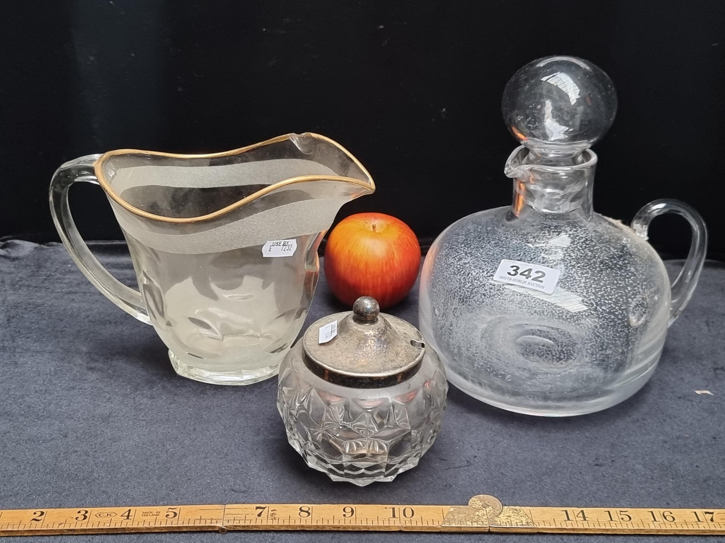 Three pretty vintage and antique glassware items including a jam pot with EPNS lid, a creamer jug with frosted glass detail and a large handblown decanter