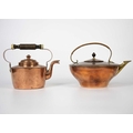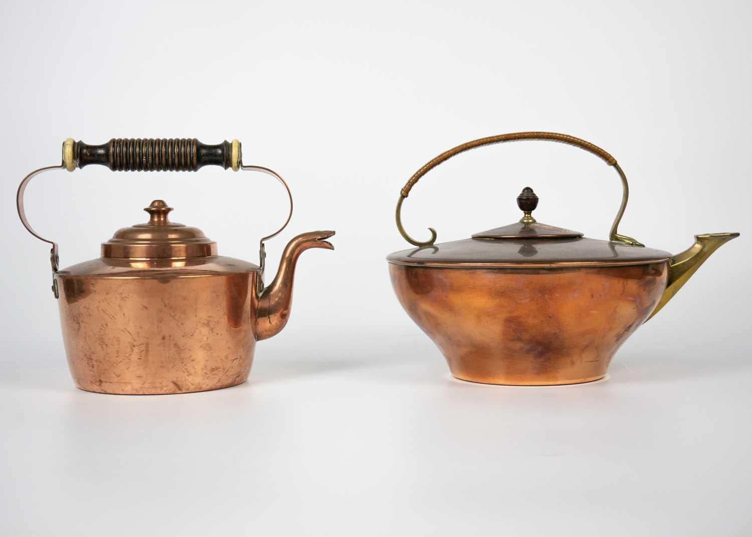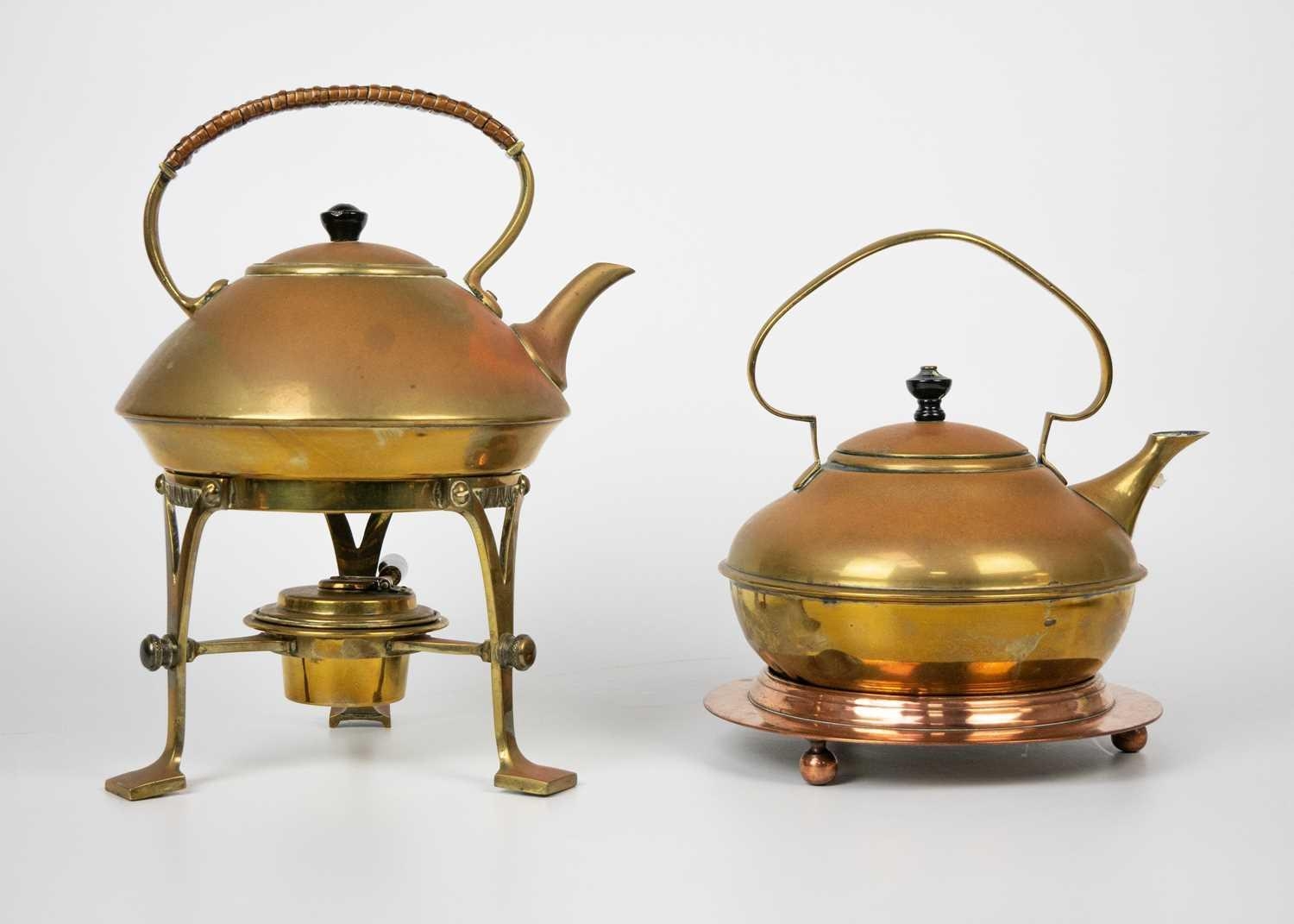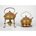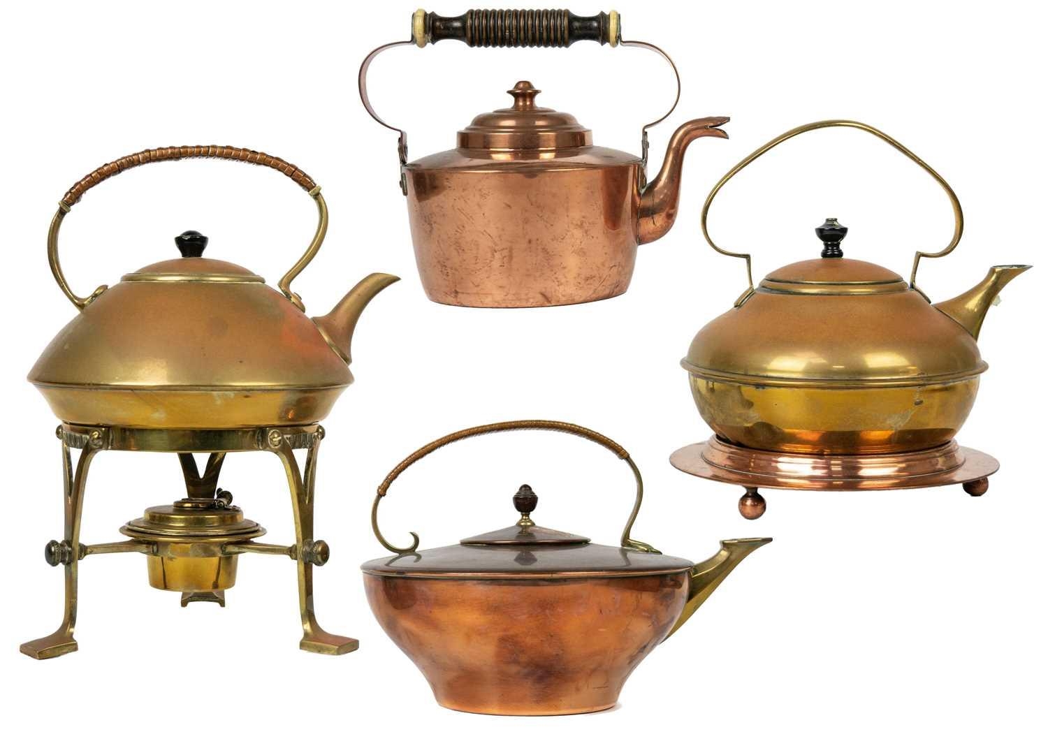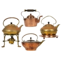 A W A S Benson copper and brass kettle. With a rattan bound handle, together with three early 20th century brass and copper kettles, a brass spirit kettle stand and a copper kettle stand. (6)