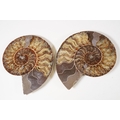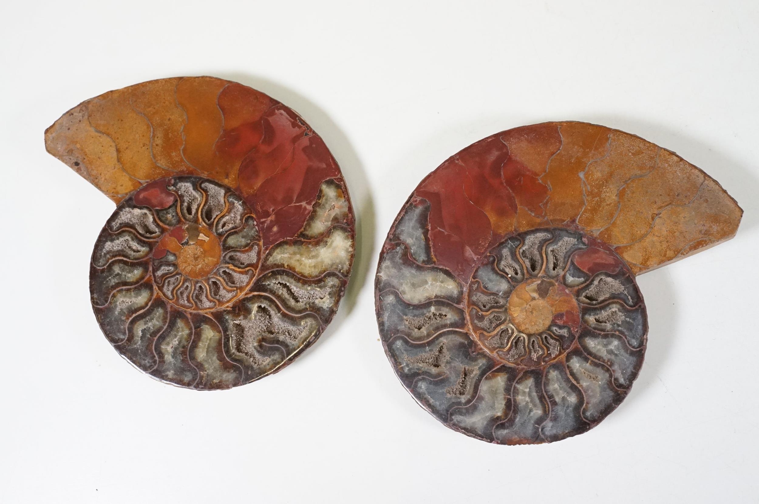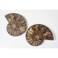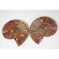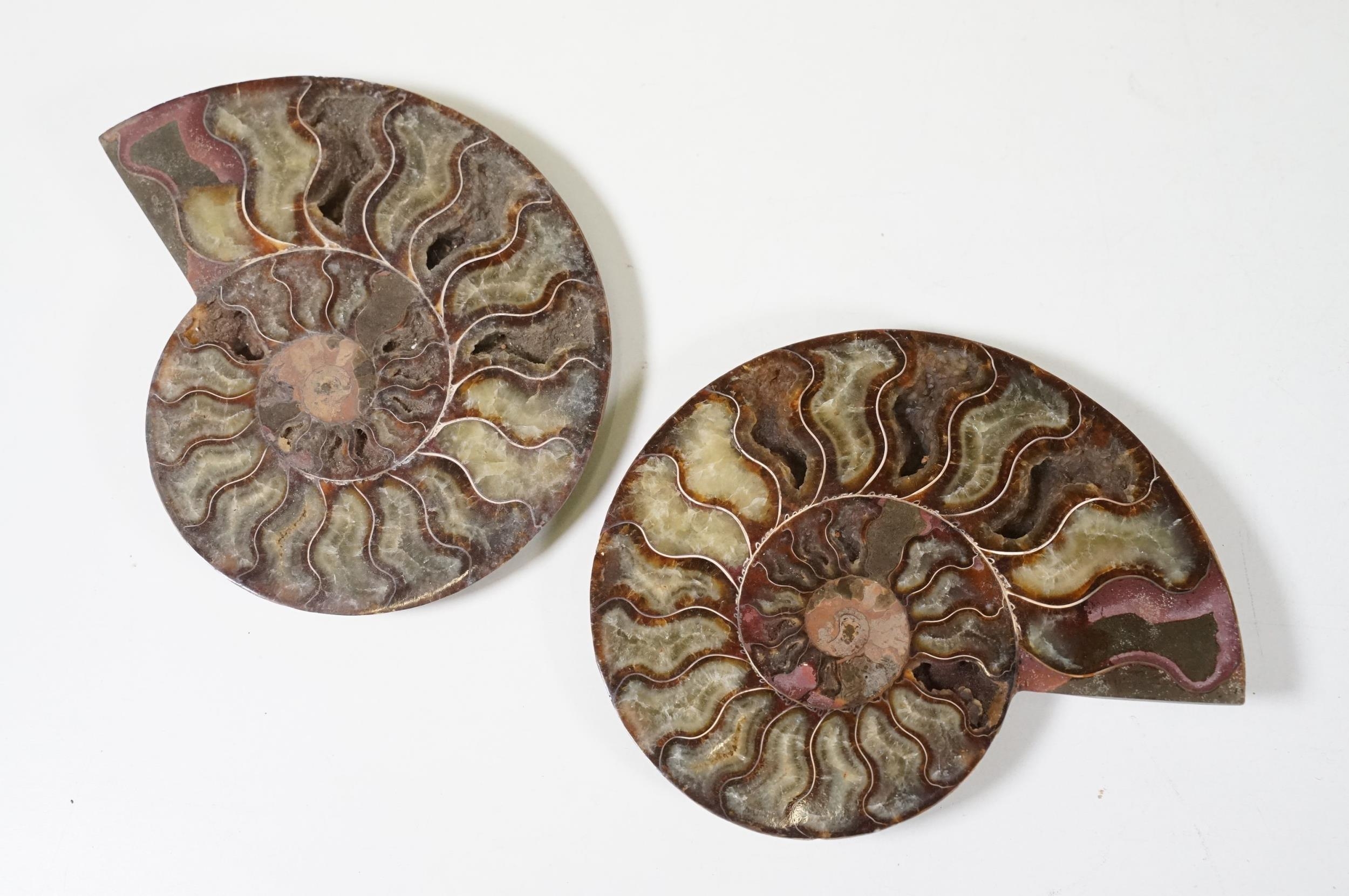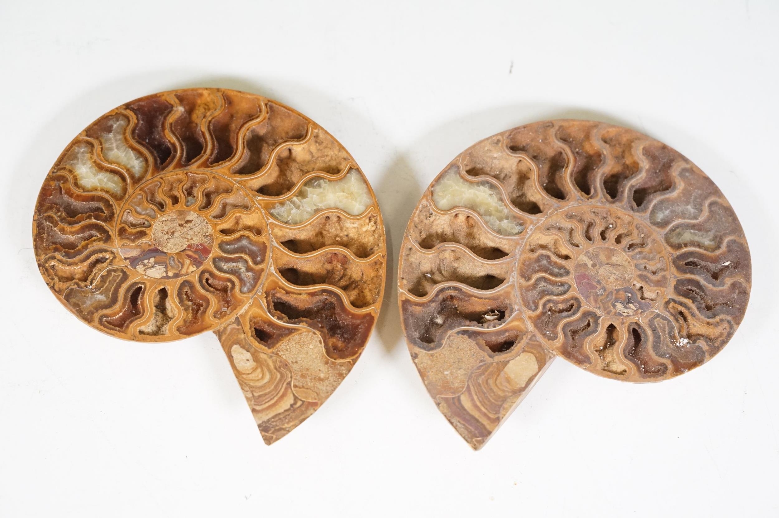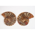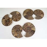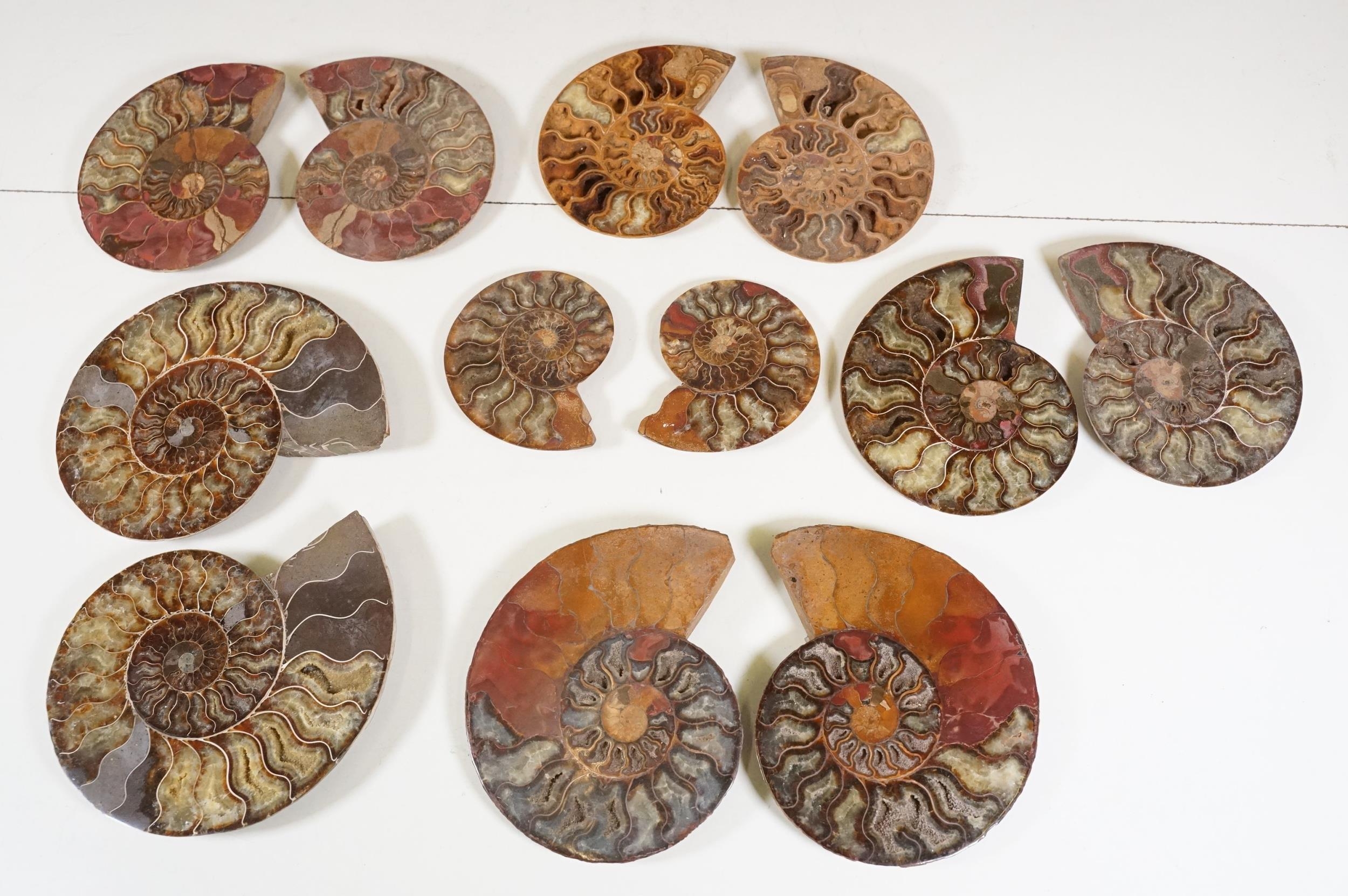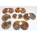 A collection of Cleoniceras ammonite specimens, Cretaceous period, approximately 120 million years old, each pair have been cut through its centre and then polished to reveal the intricate chambers which have been preserved in calcite and limestone.
