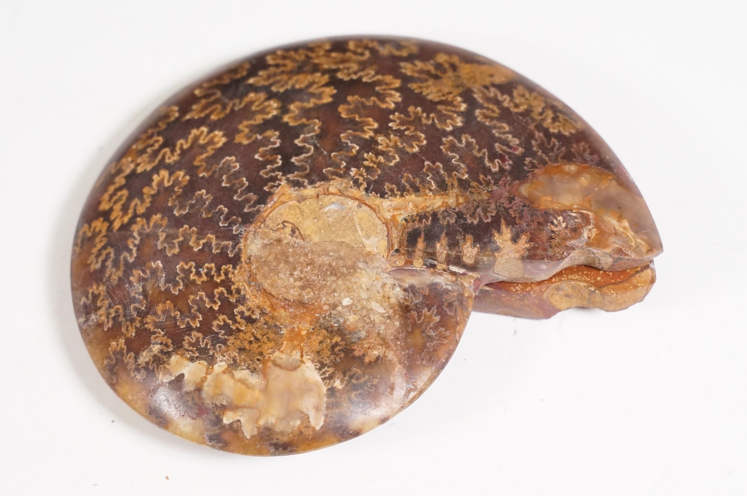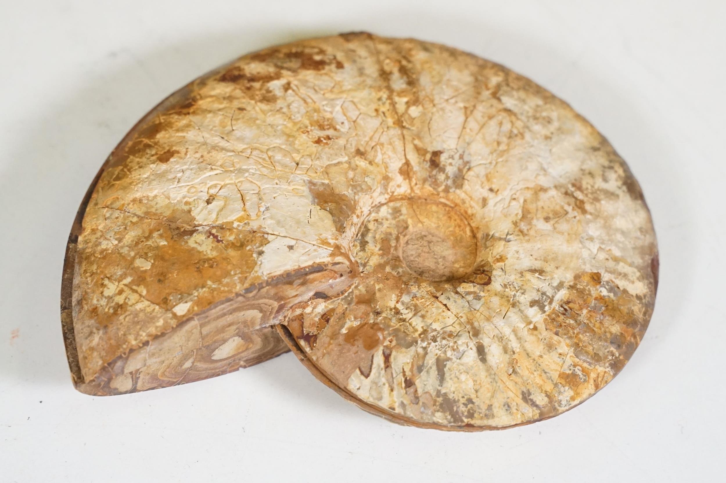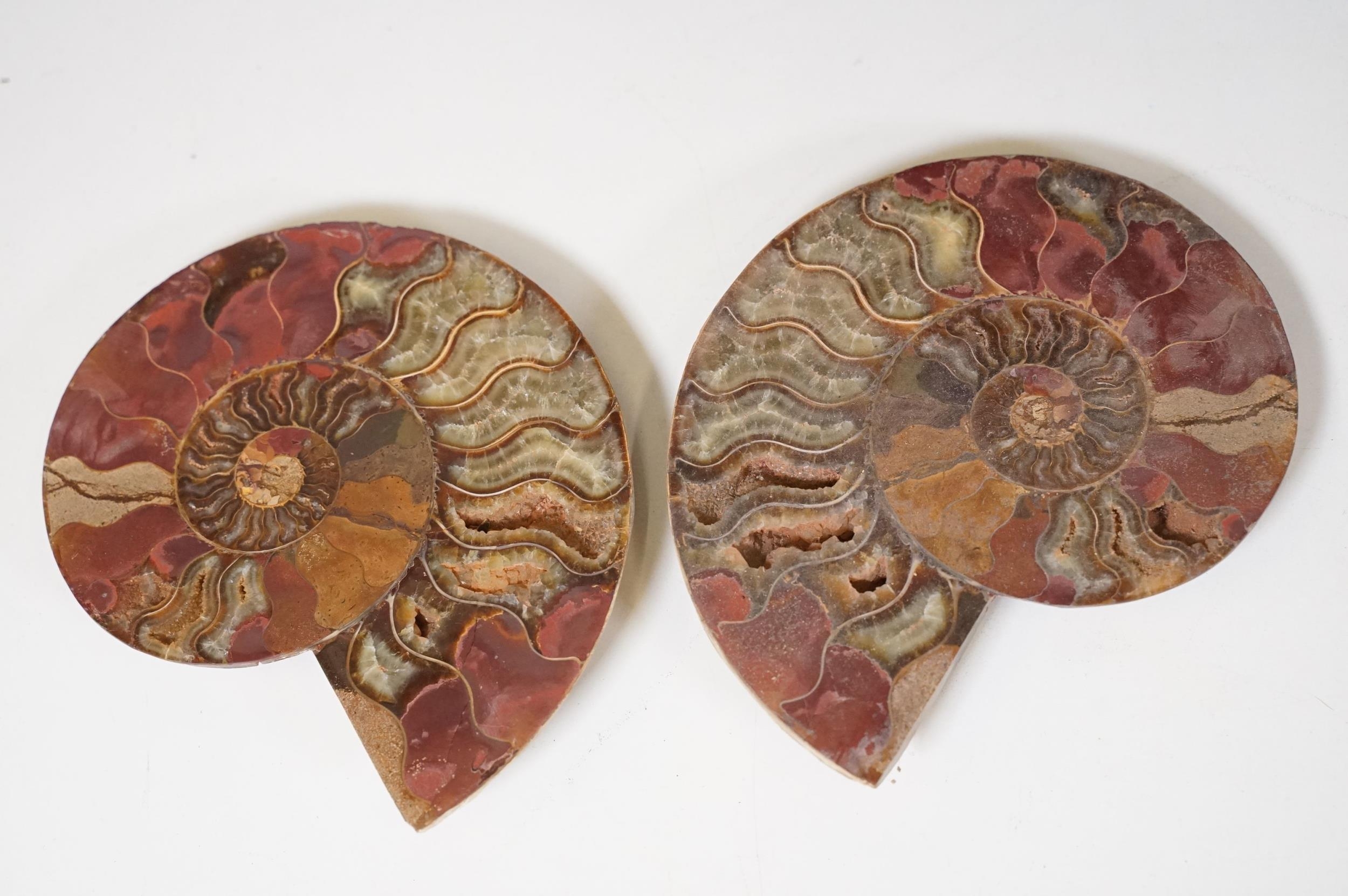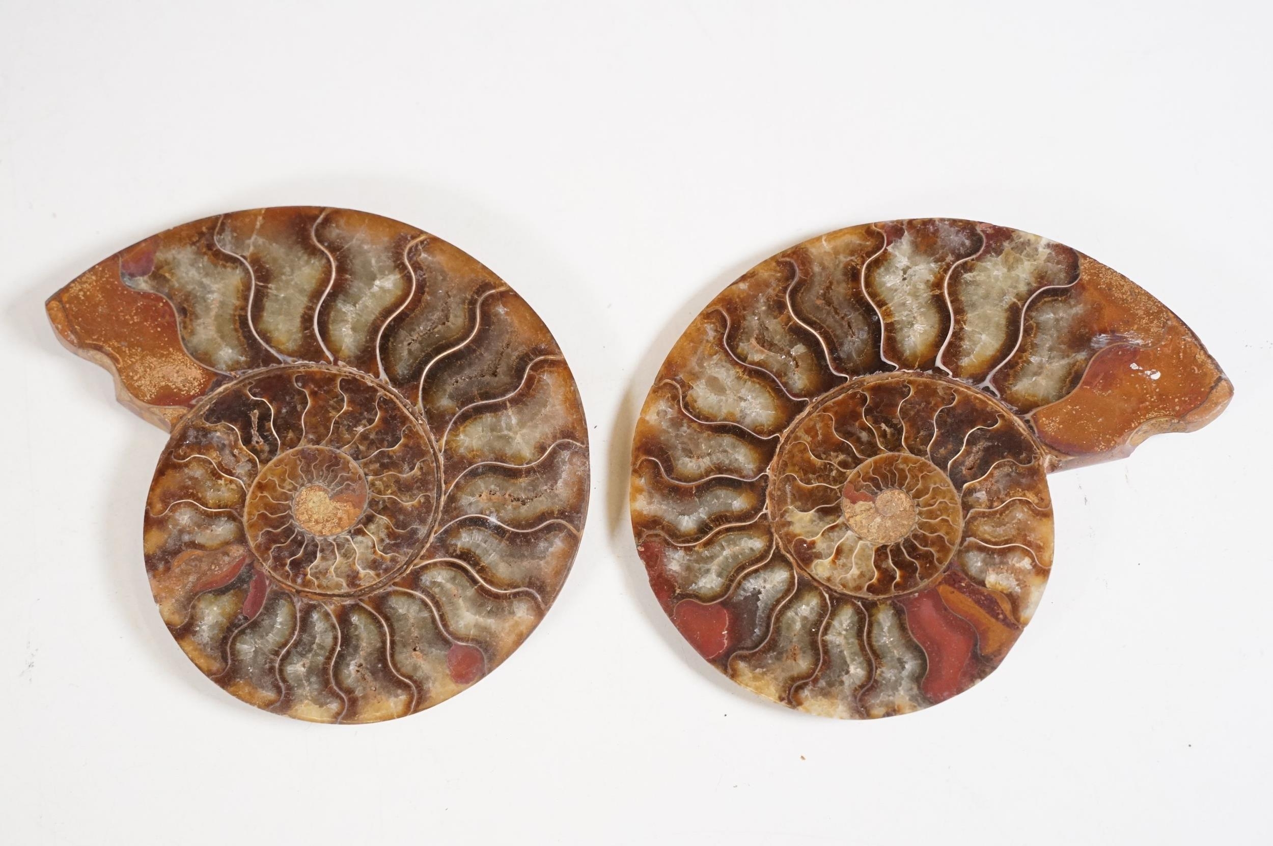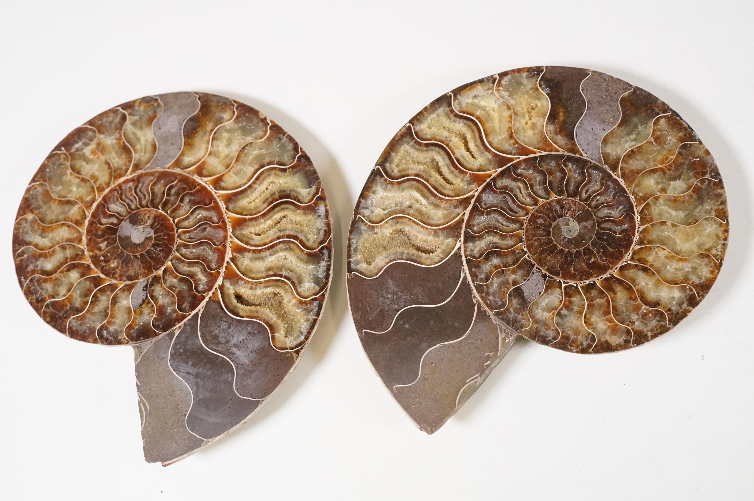A collection of Cleoniceras ammonite specimens, Cretaceous period, approximately 120 million years old, each pair have been cut through its centre and then polished to reveal the intricate chambers which have been preserved in calcite and limestone.