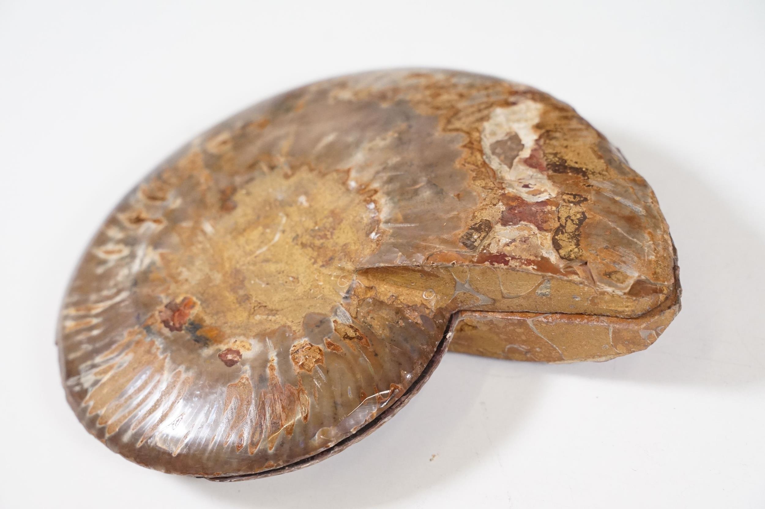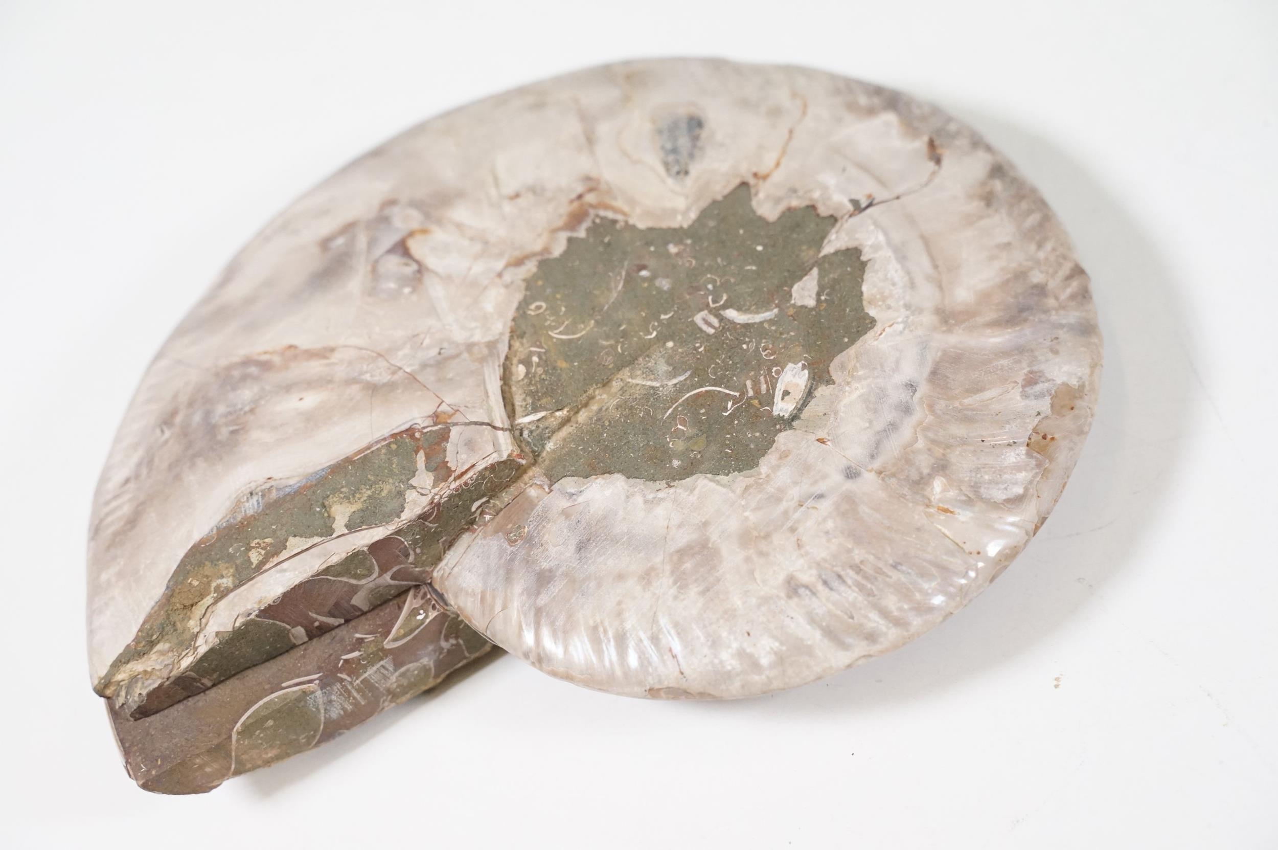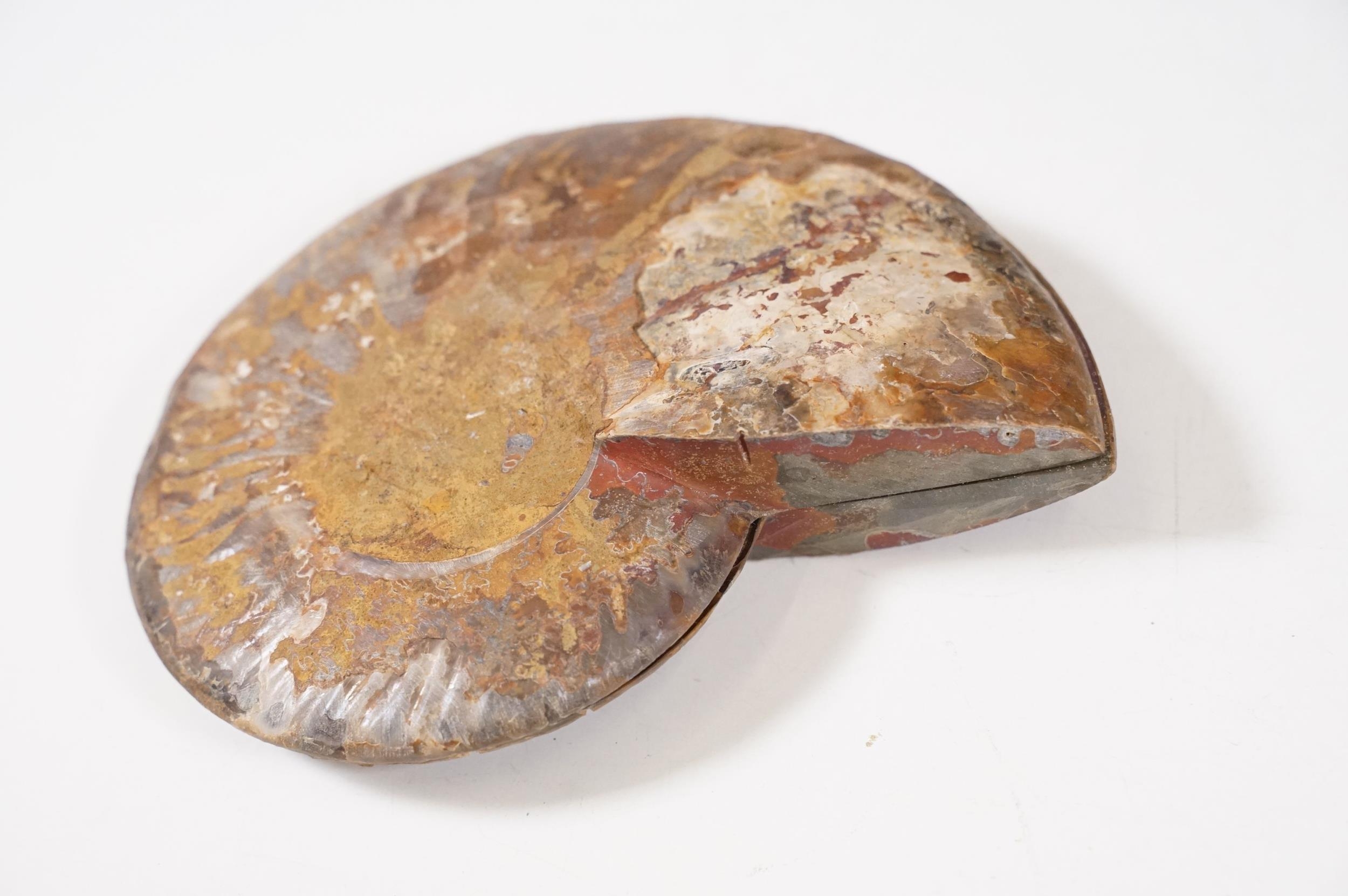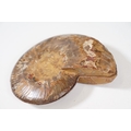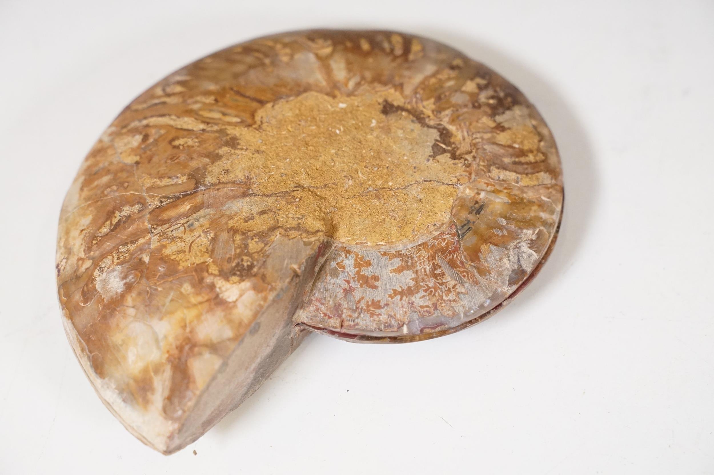 A collection of Cleoniceras ammonite specimens, Cretaceous period, approximately 120 million years old, each pair have been cut through its centre and then polished to reveal the intricate chambers which have been preserved in calcite and limestone.