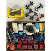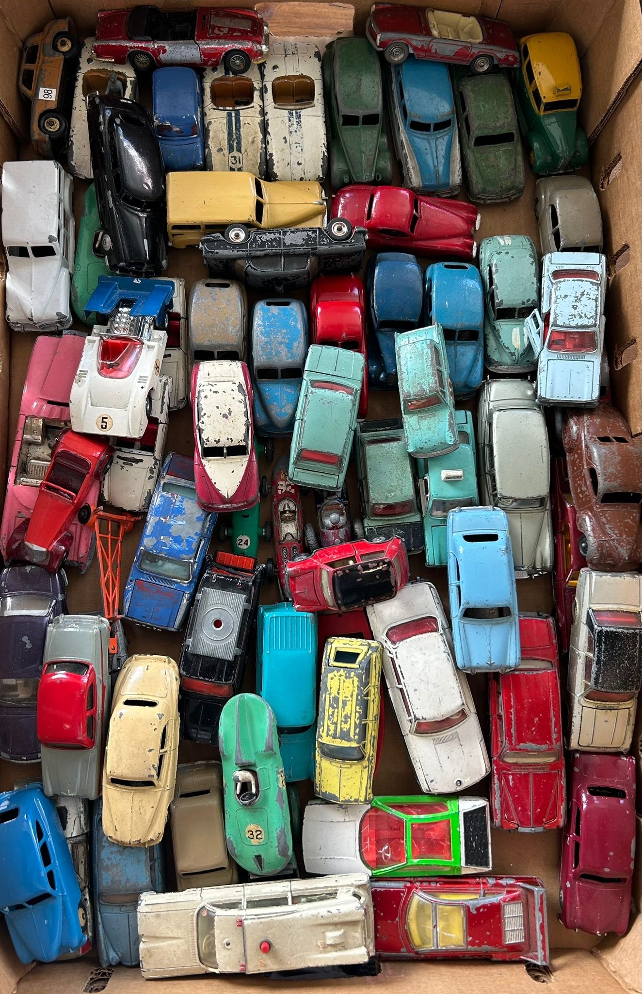 A quantity of Dinky Vehicles for restoration. Over 60 examples including Hillman Imp, Morris Oxford, Mini, Ford Anglia, Jaguar XK120, Austin A105, Ford Corsair, Rover 75, Austin TAXI, Hillman Minx, Rolls Royce Phantom V, Standard Vanguard, Lamborghini Marzal, AC Aceca, Ford Zephyr, Porsche 356, American Estate Car, McLaren M8A, Super Criterion Ambulance, Connaught, Vauxhall Victor Estate, Nash Rambler, Ford Escort POLICE Car, Lincoln Zephyr, Hudson Sedan, Ford Sedan, Cunningham C-5R. Plus a Citroen 2 CV and a Ferrari racing car, both boxed. etc. FC-QGC Decent castings, all ideal for restoration. Some drivers and small parts missing from convertibles.
