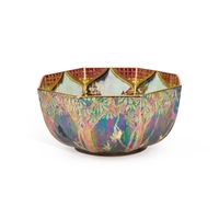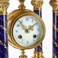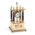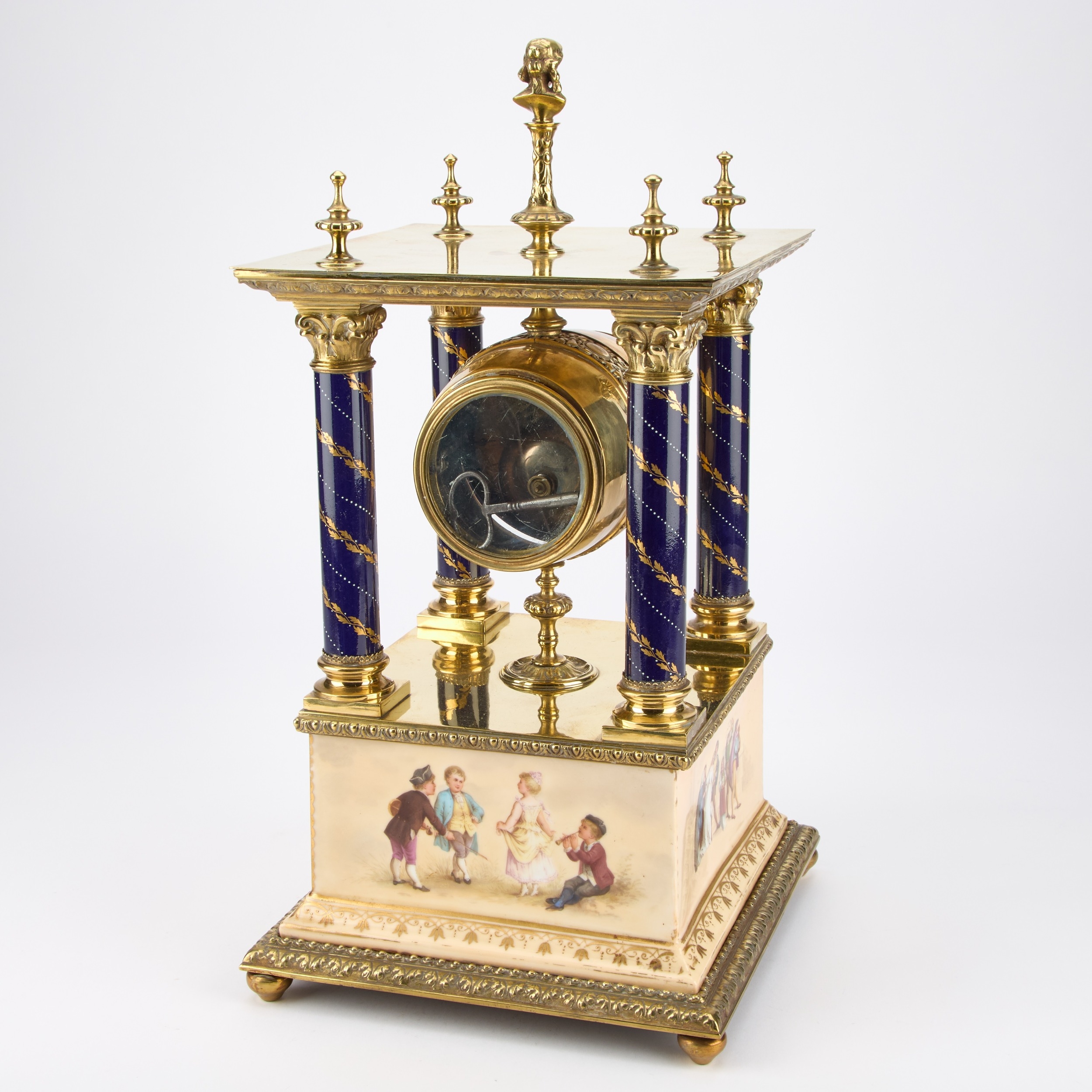 the drum case supported by four gilt-decorated cobalt blue columns, surmounted by a square platform centred by a porcelain bust of a maiden raised on a pedestal, the corners with knopped finials, raised on a square moulded plinth base with painted scenes of putti and 18th Century figures, the 3-inch dial with Arabic numerals. 44.5cm high, 24.5cm wide