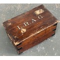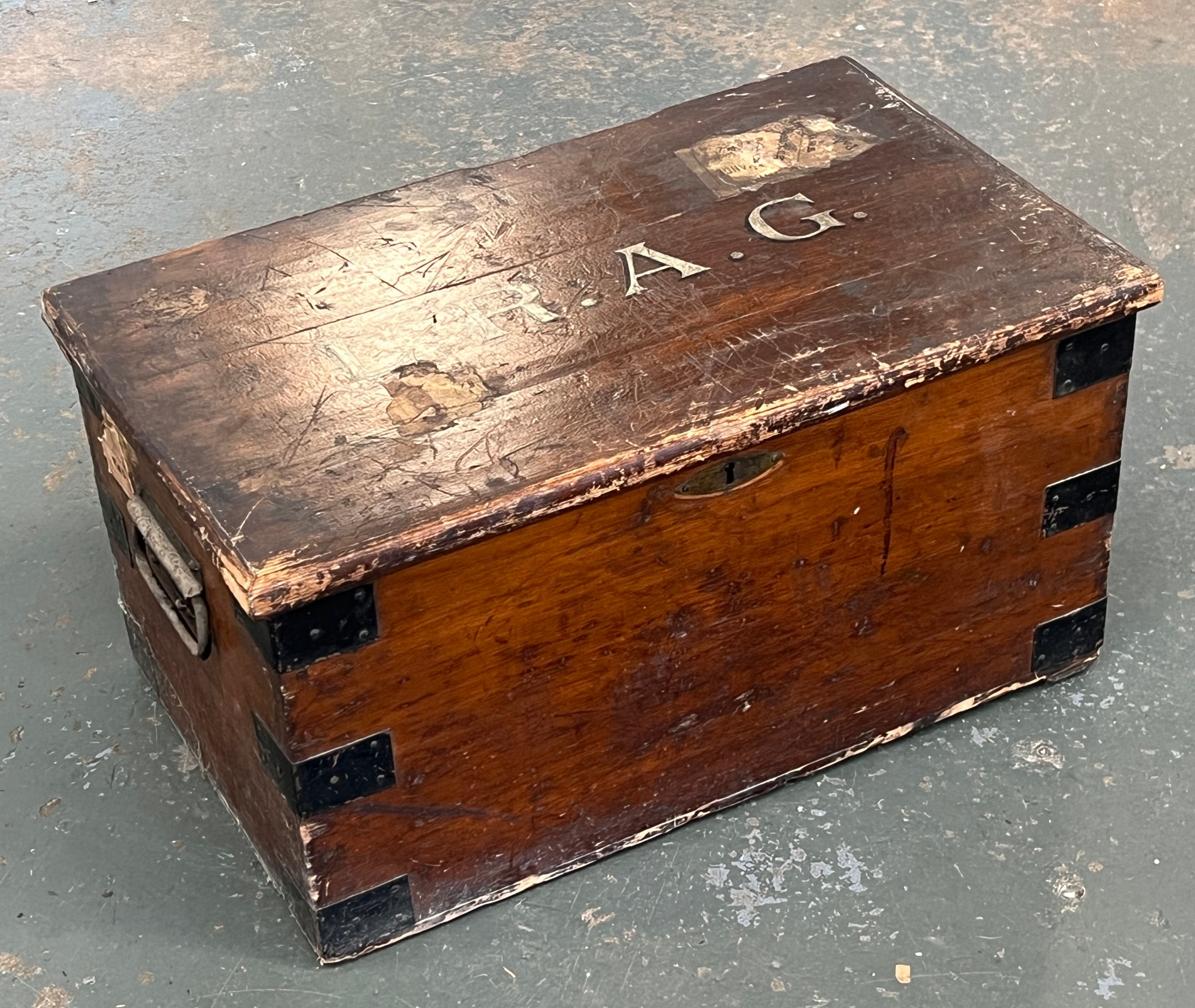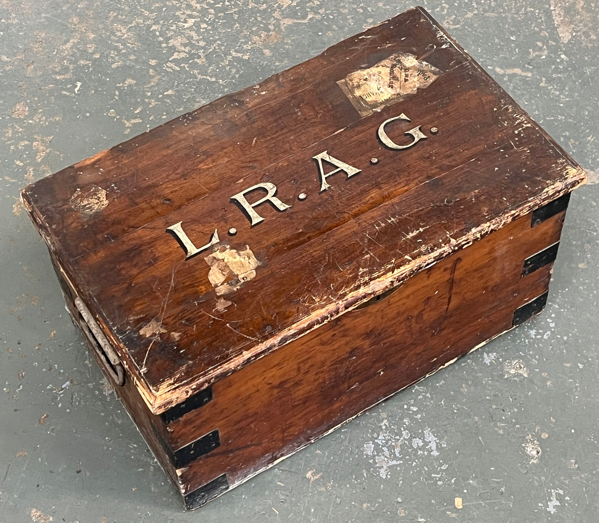 A pine trunk with metal bracing, the top monogrammed LRAG, 64x38.5x33cmH