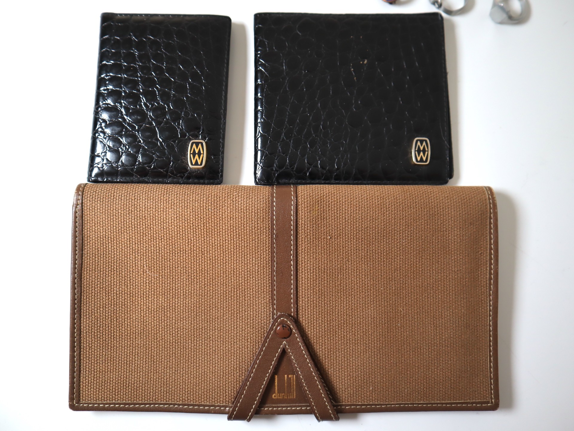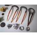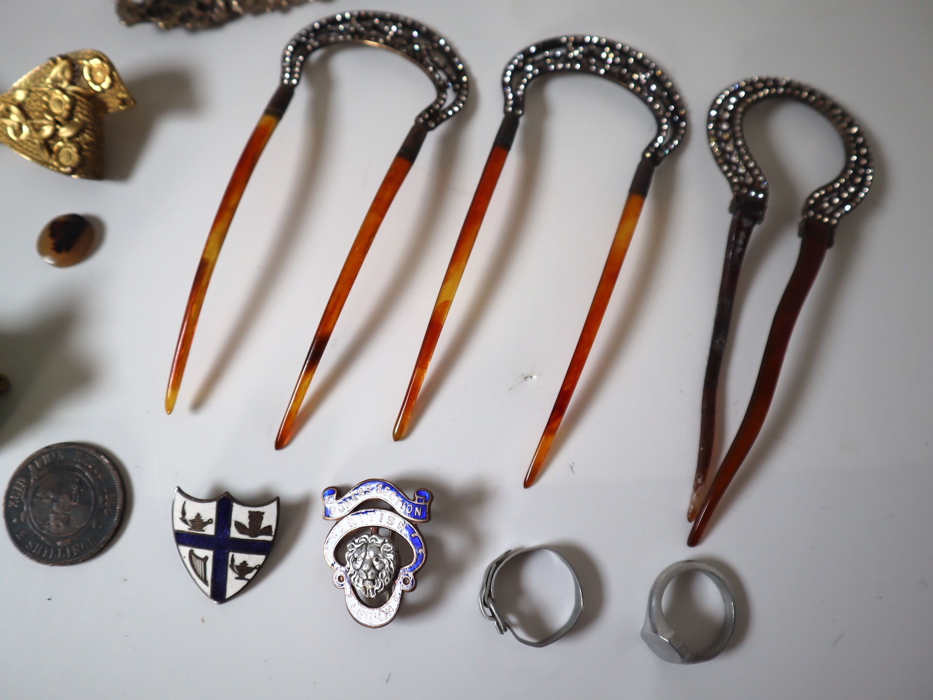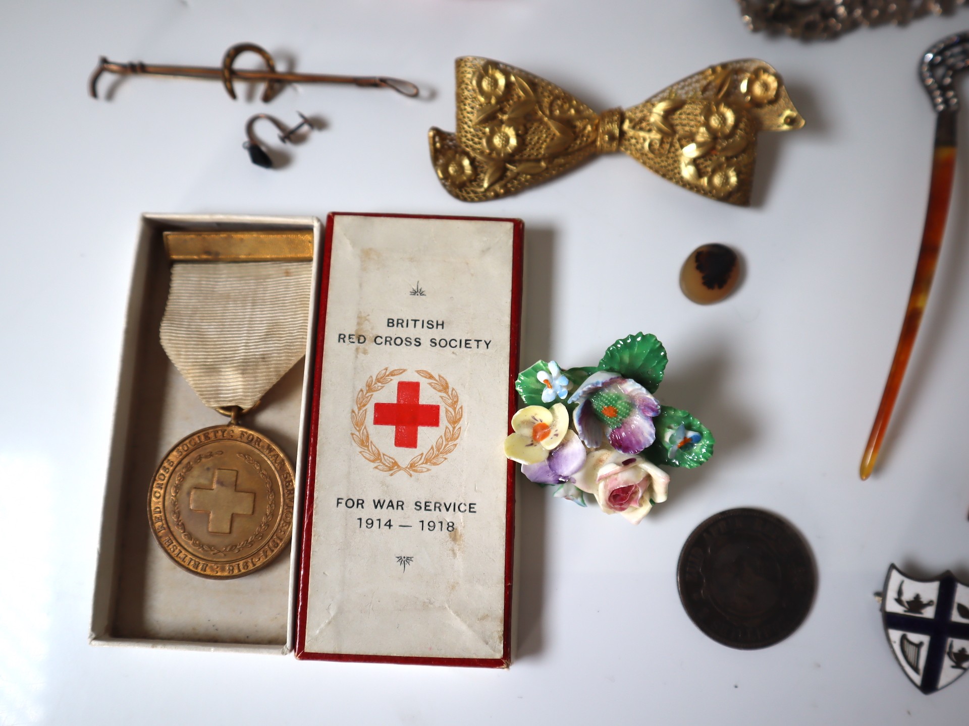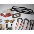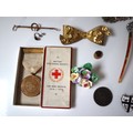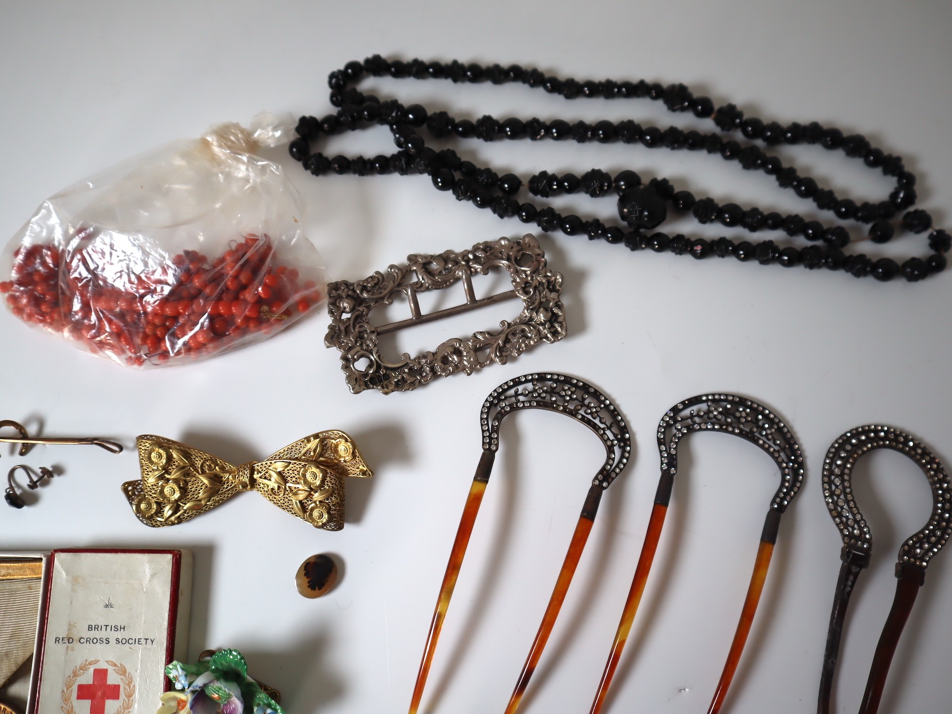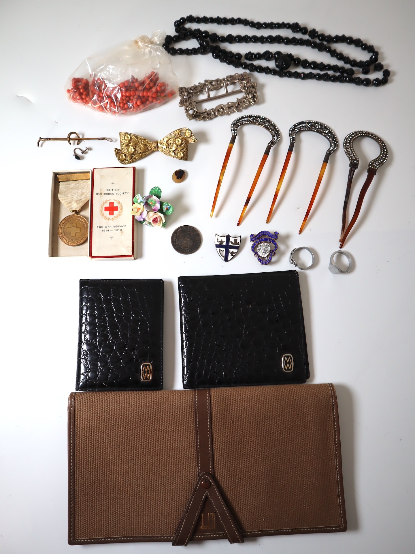 A group of early 20th century jewellery including Sterling Silver belt buckle, Silver 1895 2 Shillings South Africa Republic, Mappin & Webb Leather Wallet and Address Book + Leather & Canvas Dunhill Purse, WW1 Red Cross Service Medal , Hair clips, necklaces, rings etc