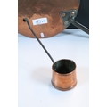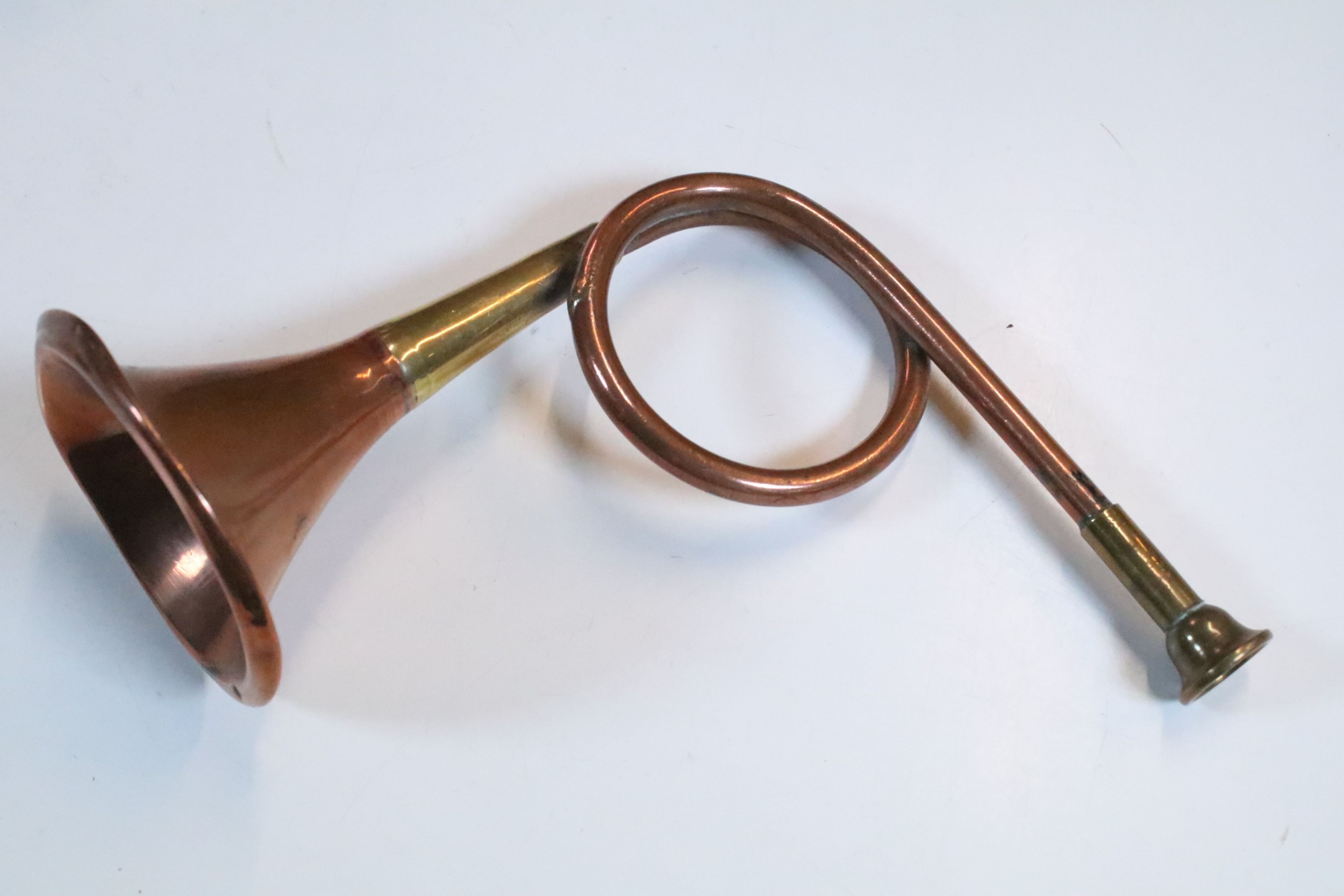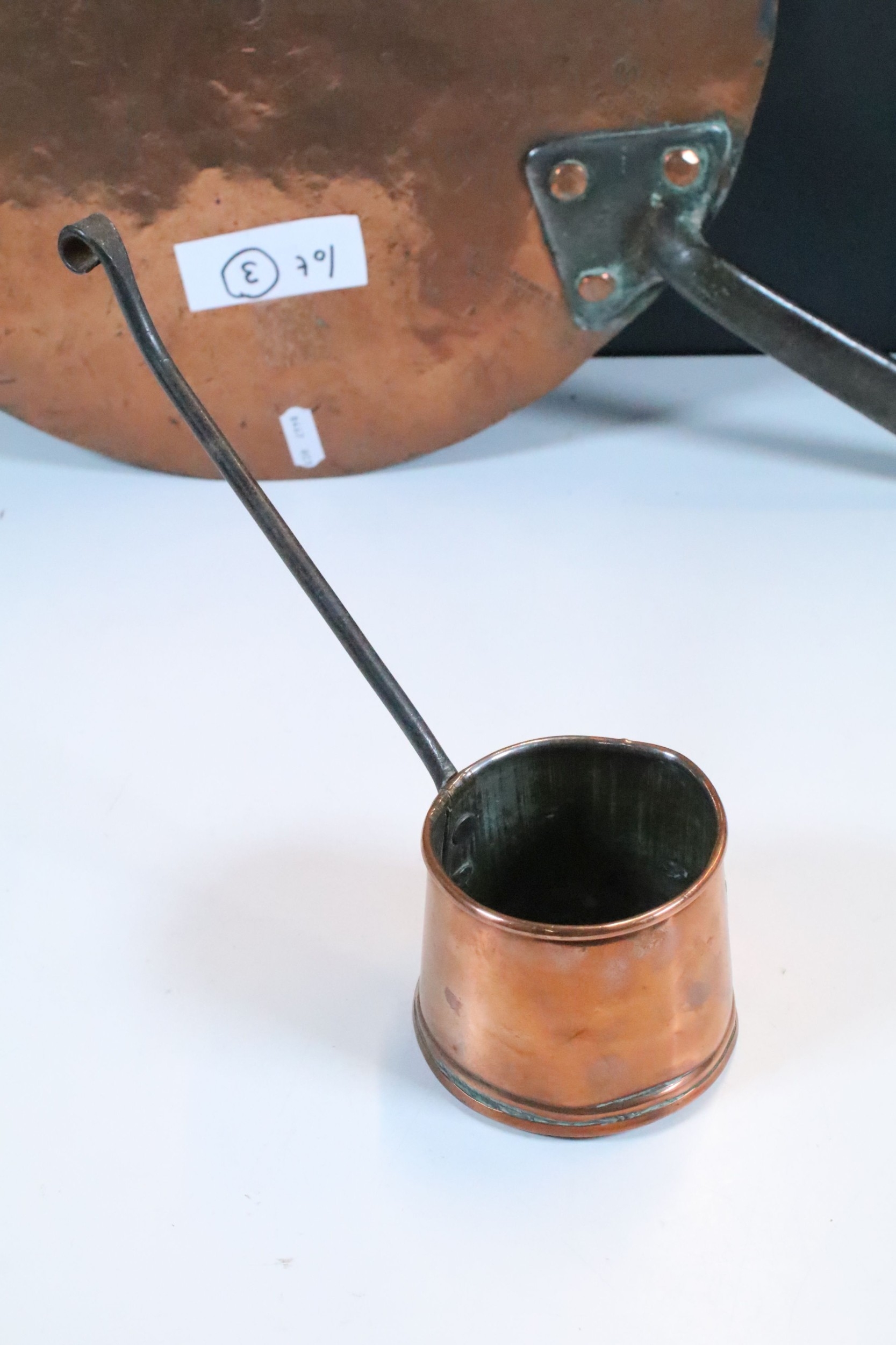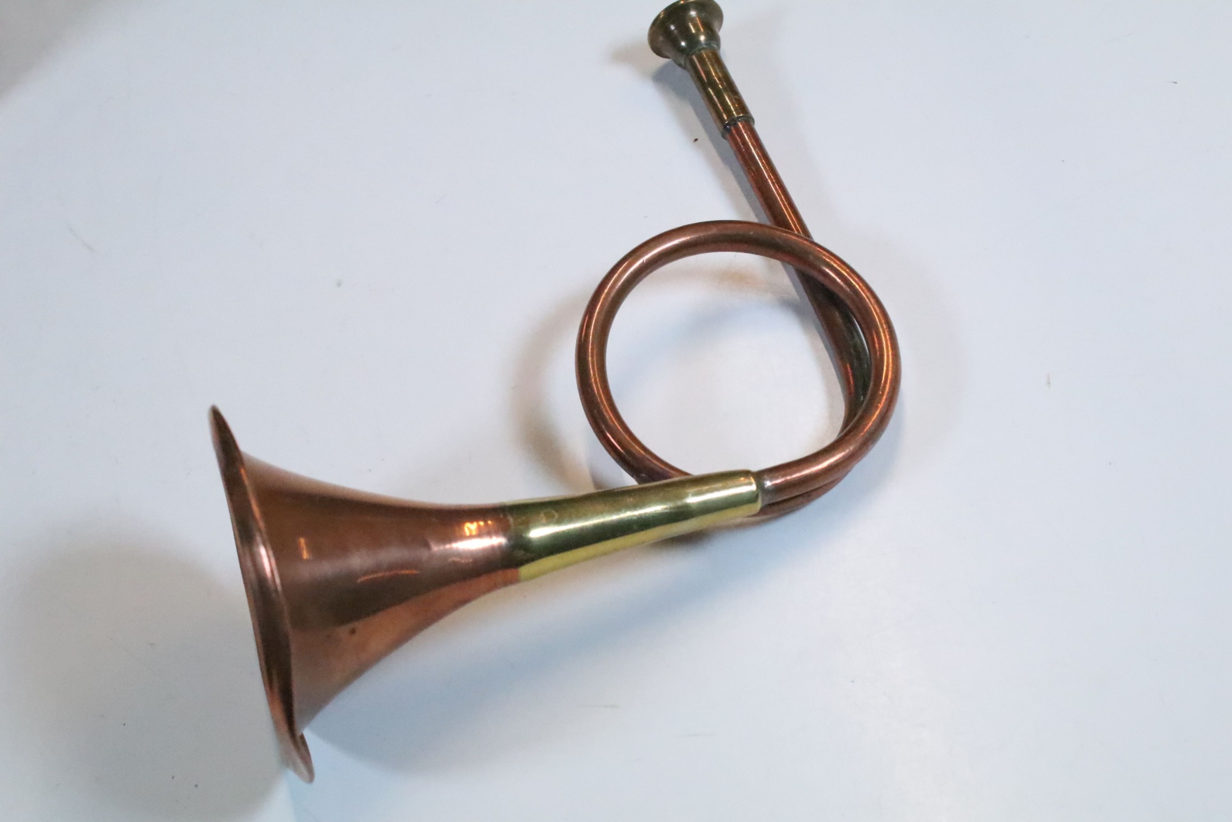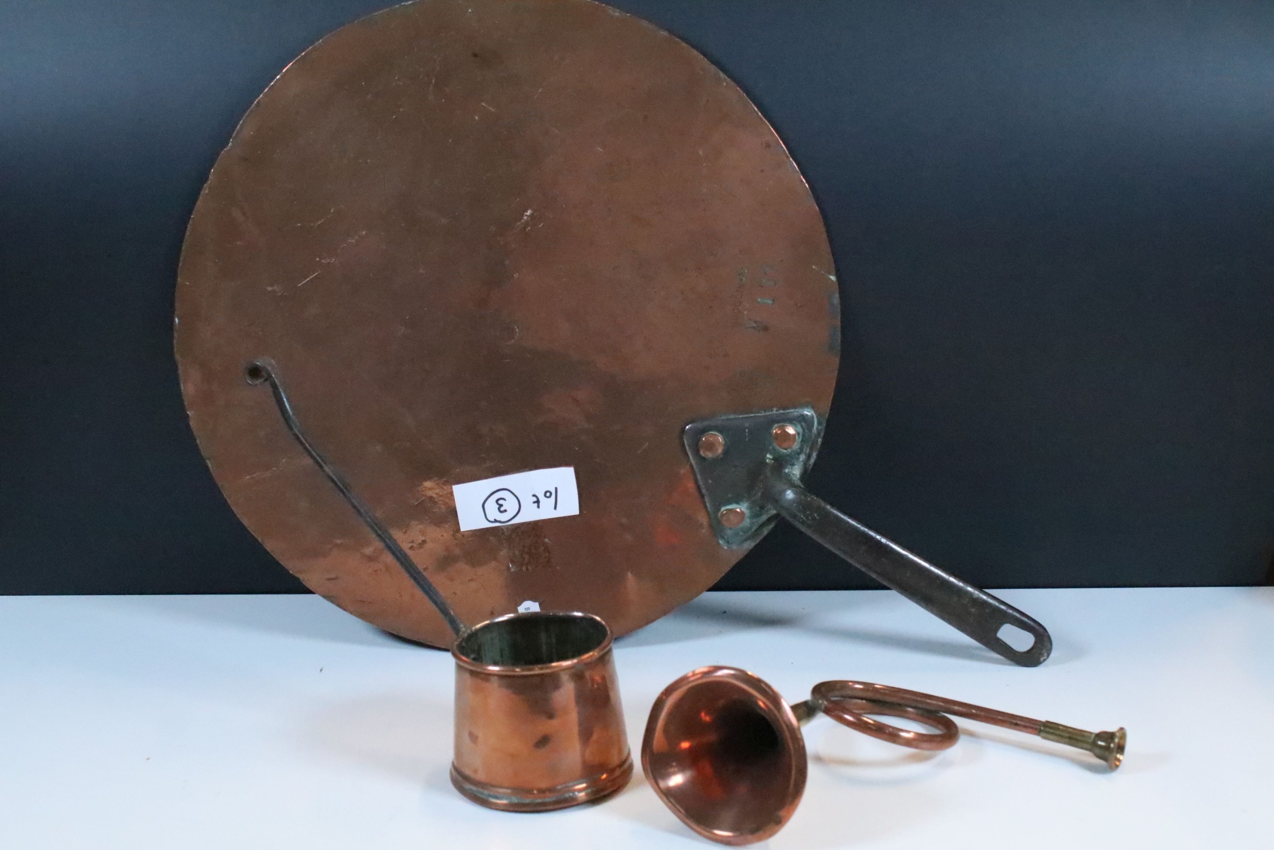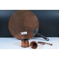 Group of antique copper items to include pan lid, cider ladle and a horn (1 box)