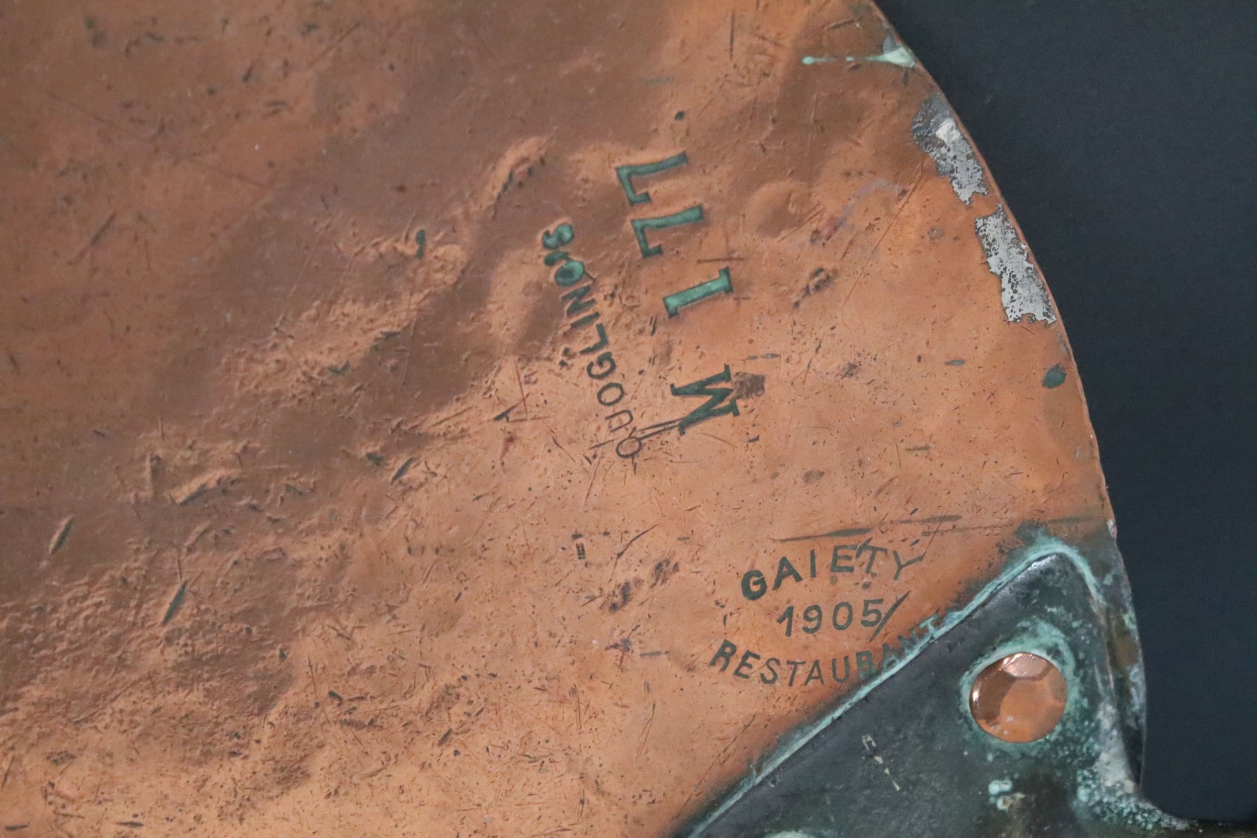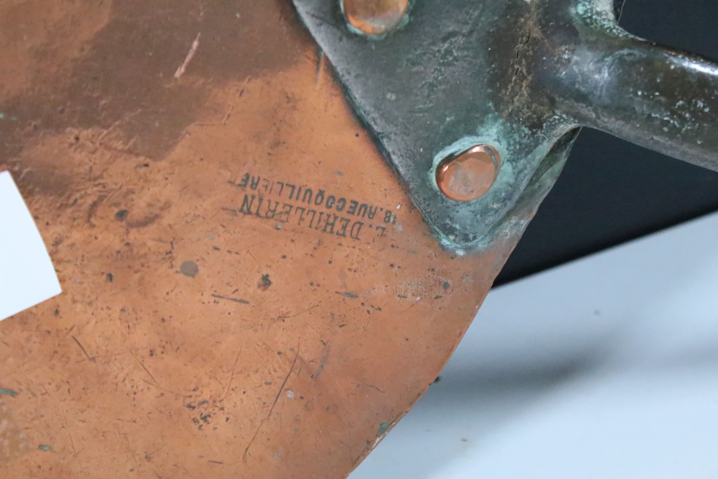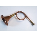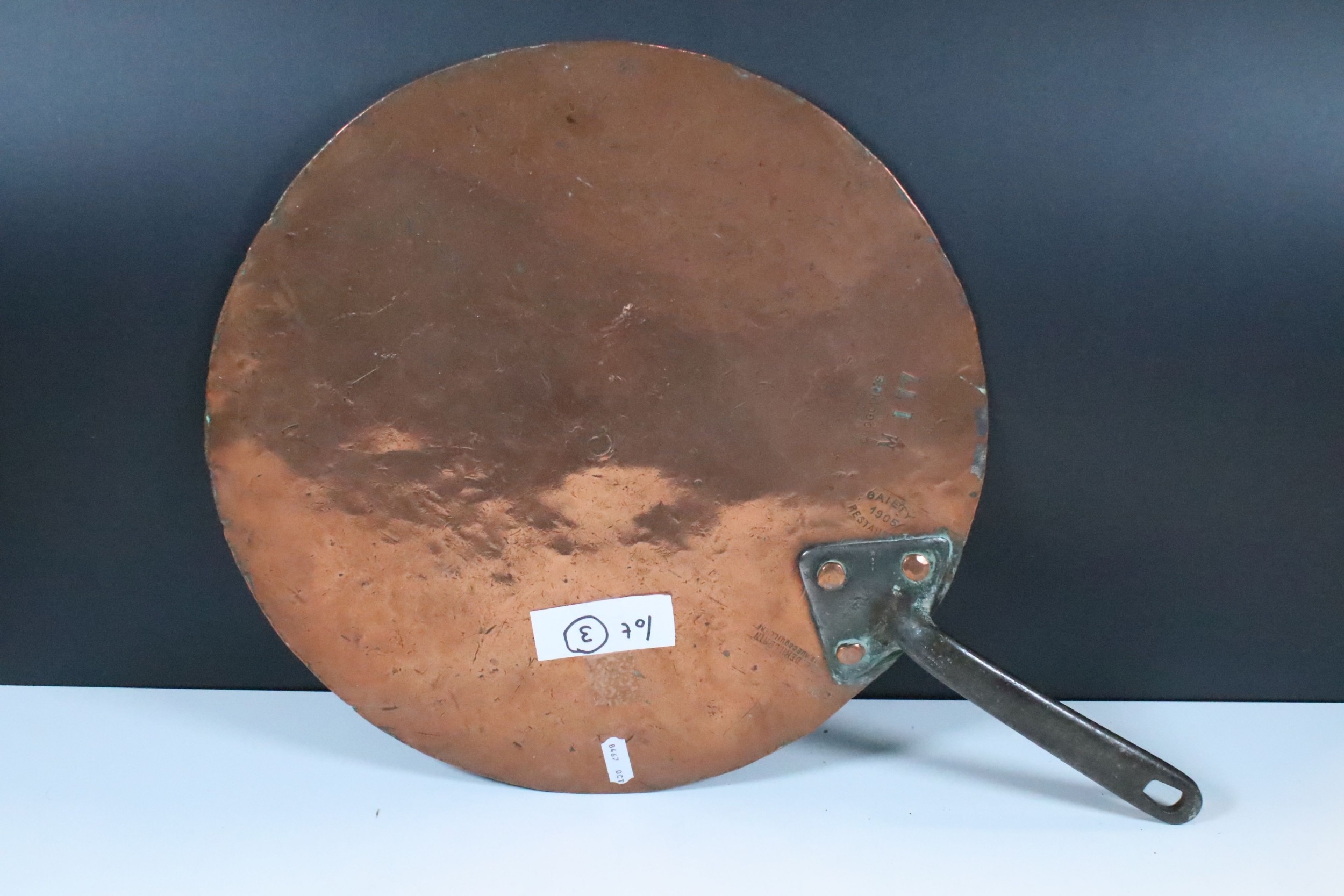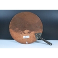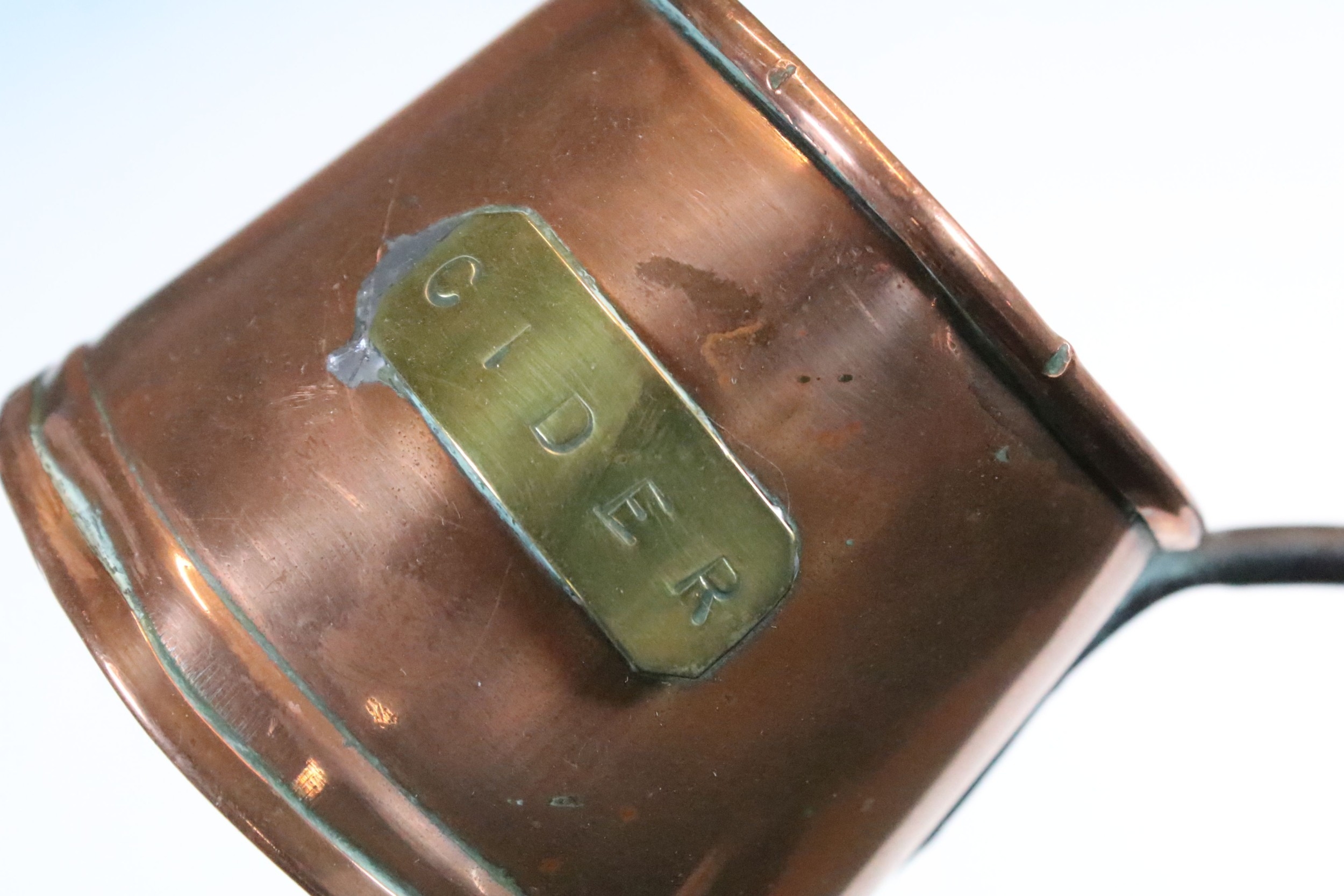 Group of antique copper items to include pan lid, cider ladle and a horn (1 box)