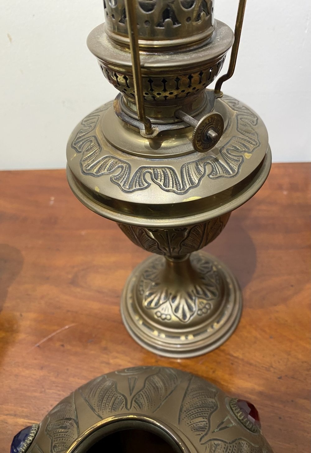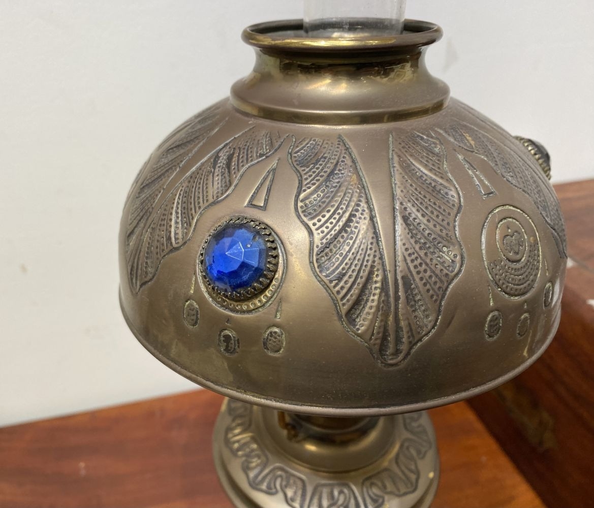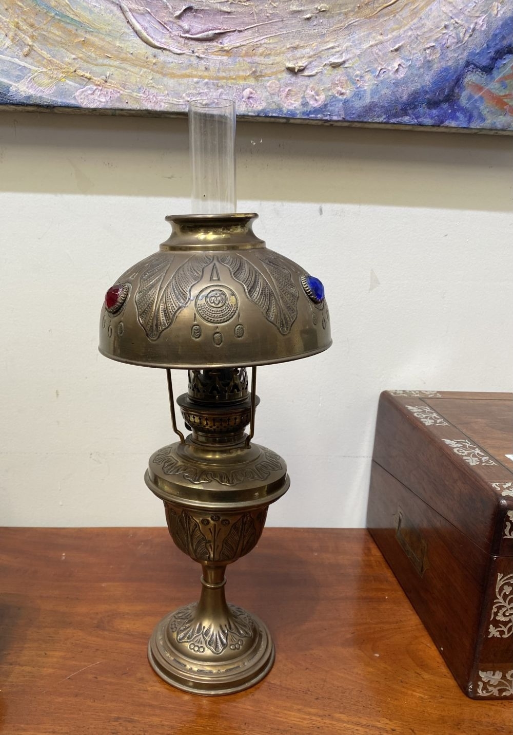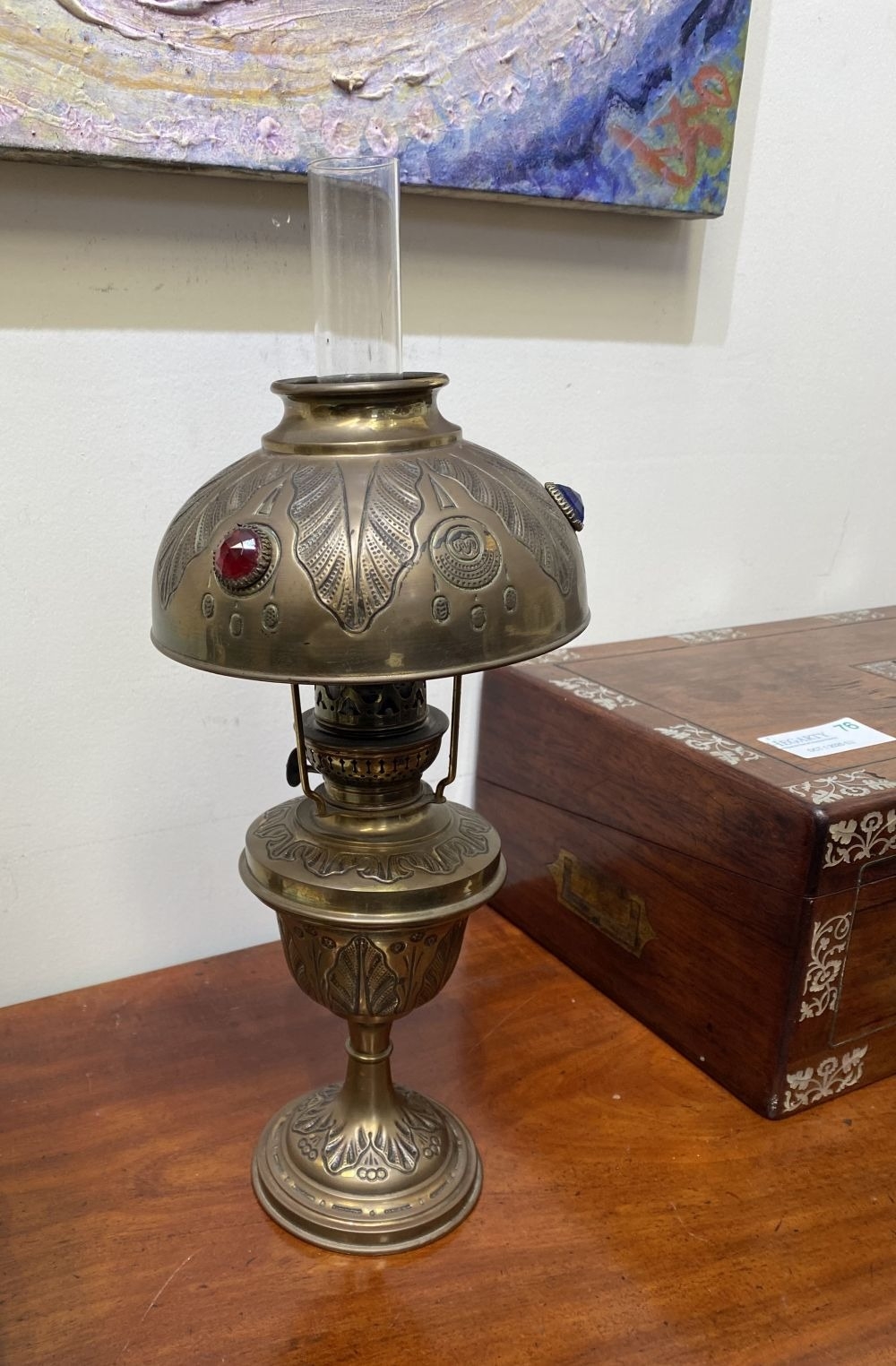 A VICTORIAN FRENCH STYLE BRASS OIL LAMP, the shade with inset coloured glass beads, surrounded by engraved foliate details. The shade sits over clear glass chimney that sits upon brass base/reservoir beneath, which is decorated with conforming scrolling foliate details. Art Nouveau style. Dimensions: 39cm high including chimney approx.