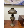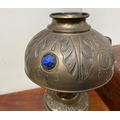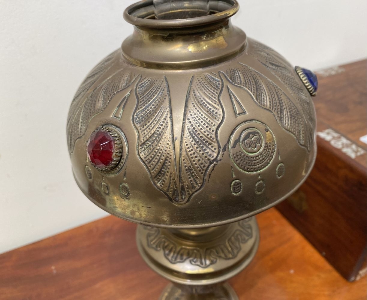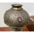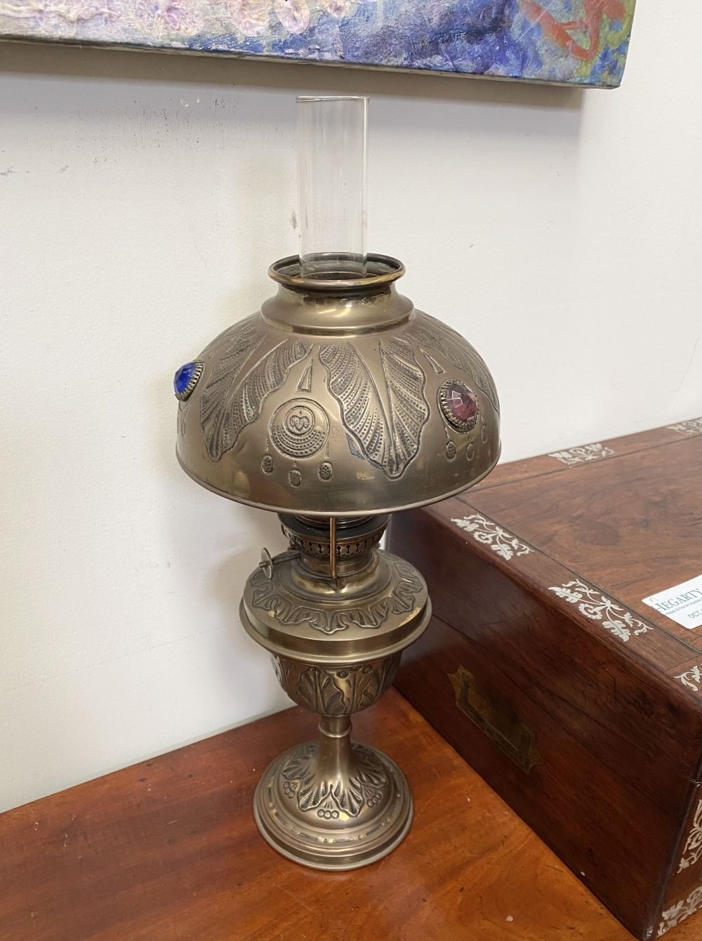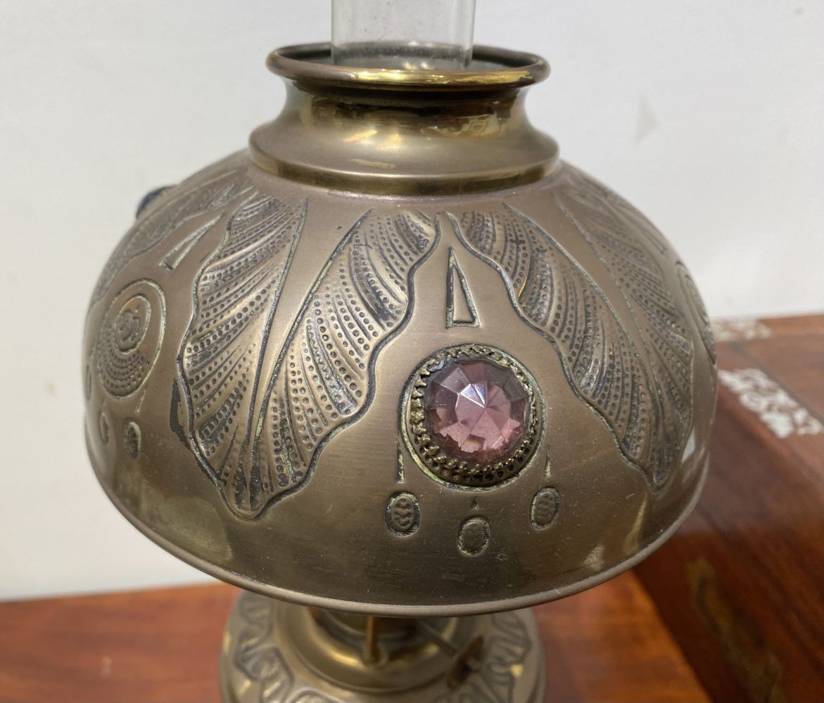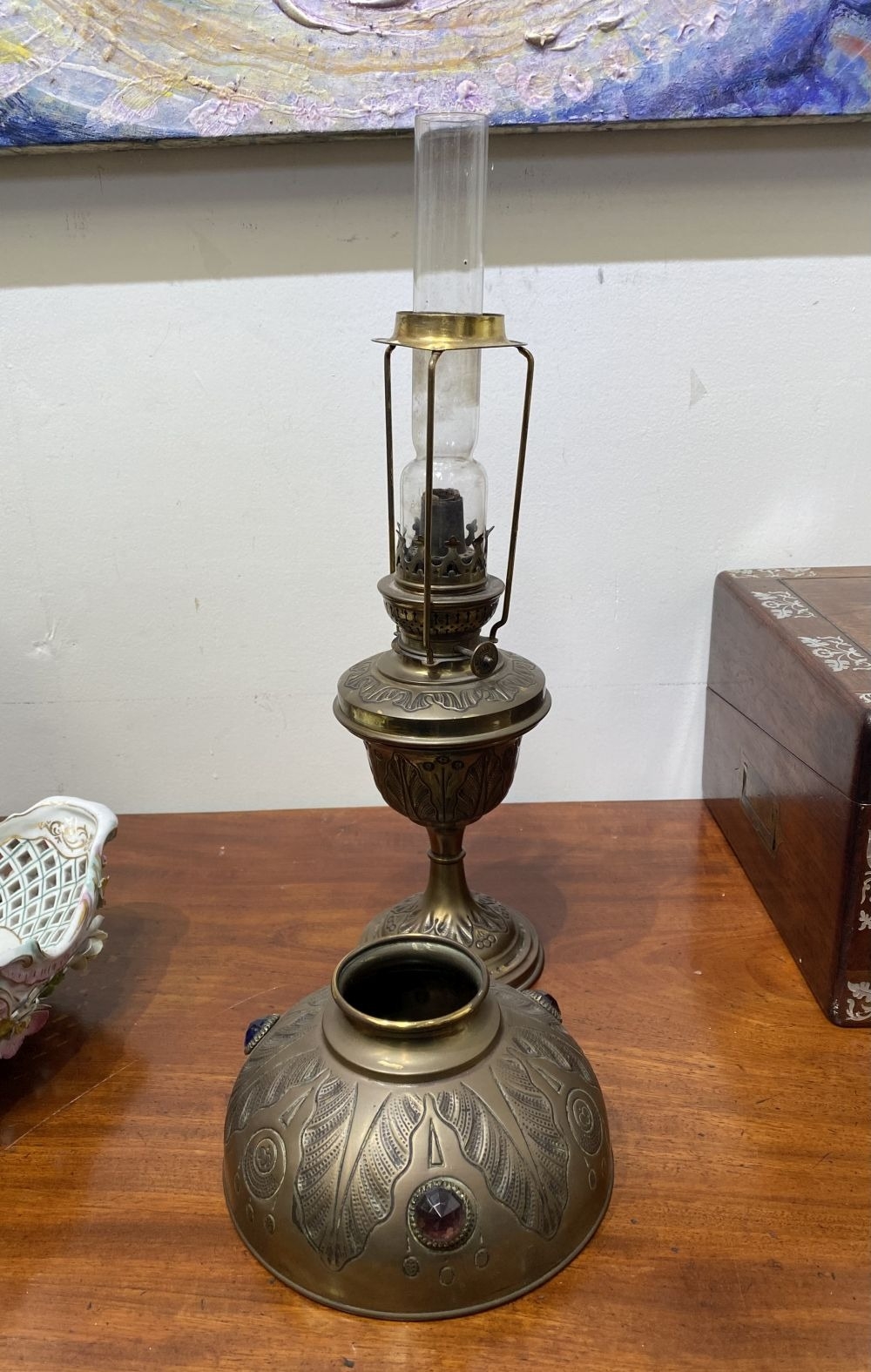 A VICTORIAN FRENCH STYLE BRASS OIL LAMP, the shade with inset coloured glass beads, surrounded by engraved foliate details. The shade sits over clear glass chimney that sits upon brass base/reservoir beneath, which is decorated with conforming scrolling foliate details. Art Nouveau style. Dimensions: 39cm high including chimney approx.