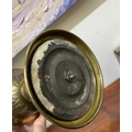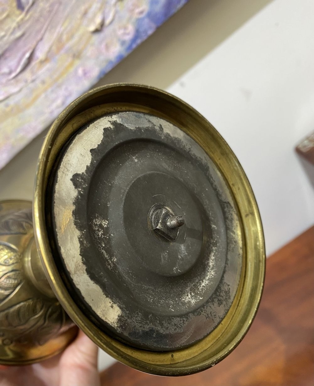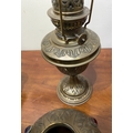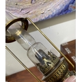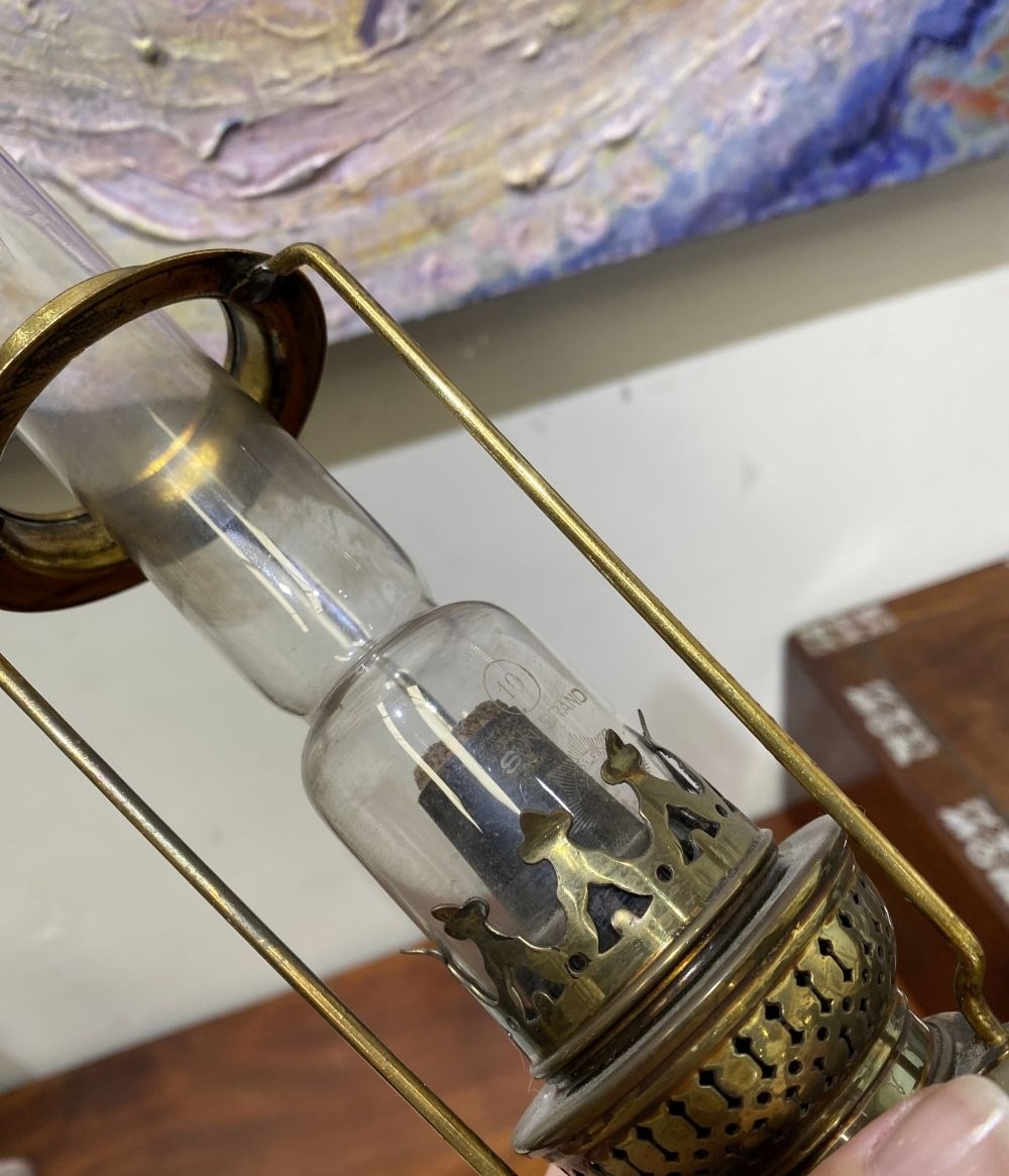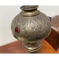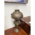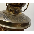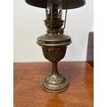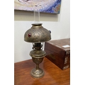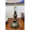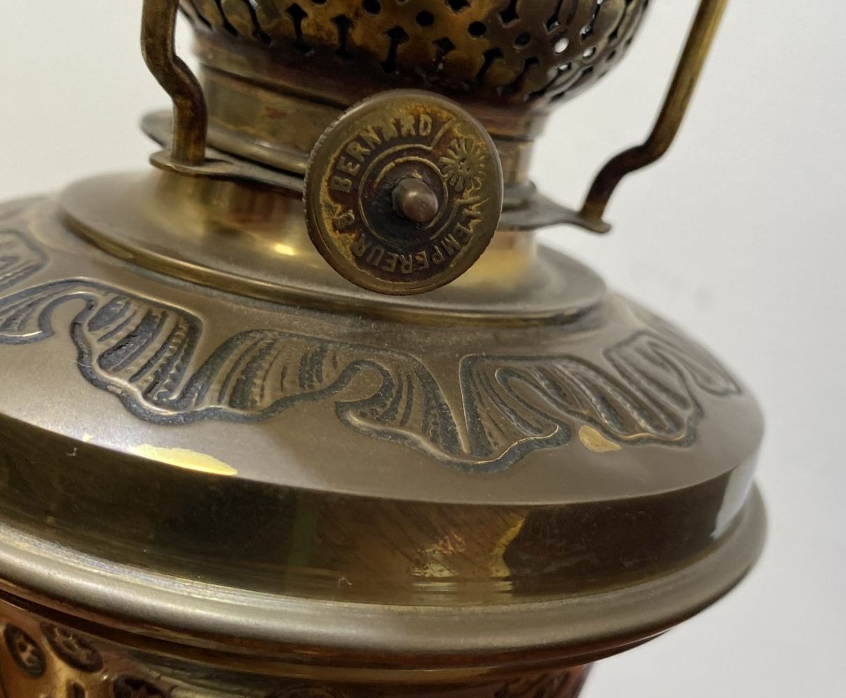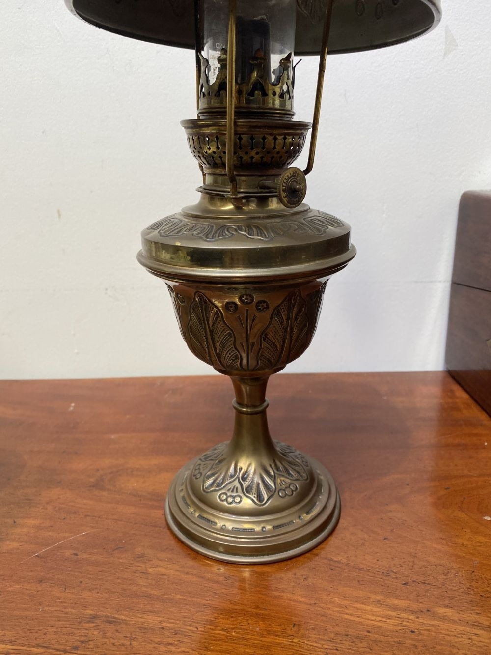 A VICTORIAN FRENCH STYLE BRASS OIL LAMP, the shade with inset coloured glass beads, surrounded by engraved foliate details. The shade sits over clear glass chimney that sits upon brass base/reservoir beneath, which is decorated with conforming scrolling foliate details. Art Nouveau style. Dimensions: 39cm high including chimney approx.