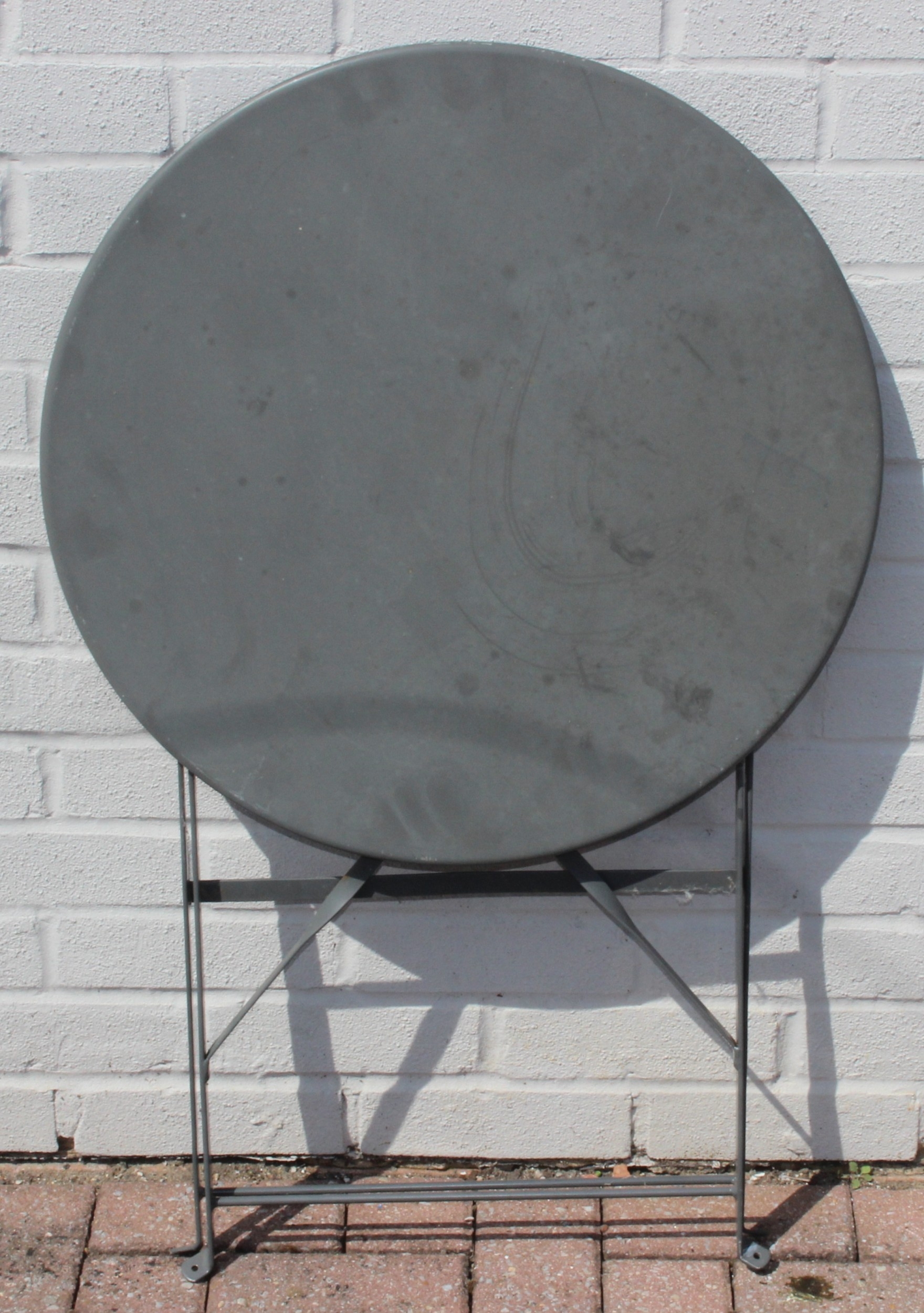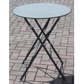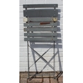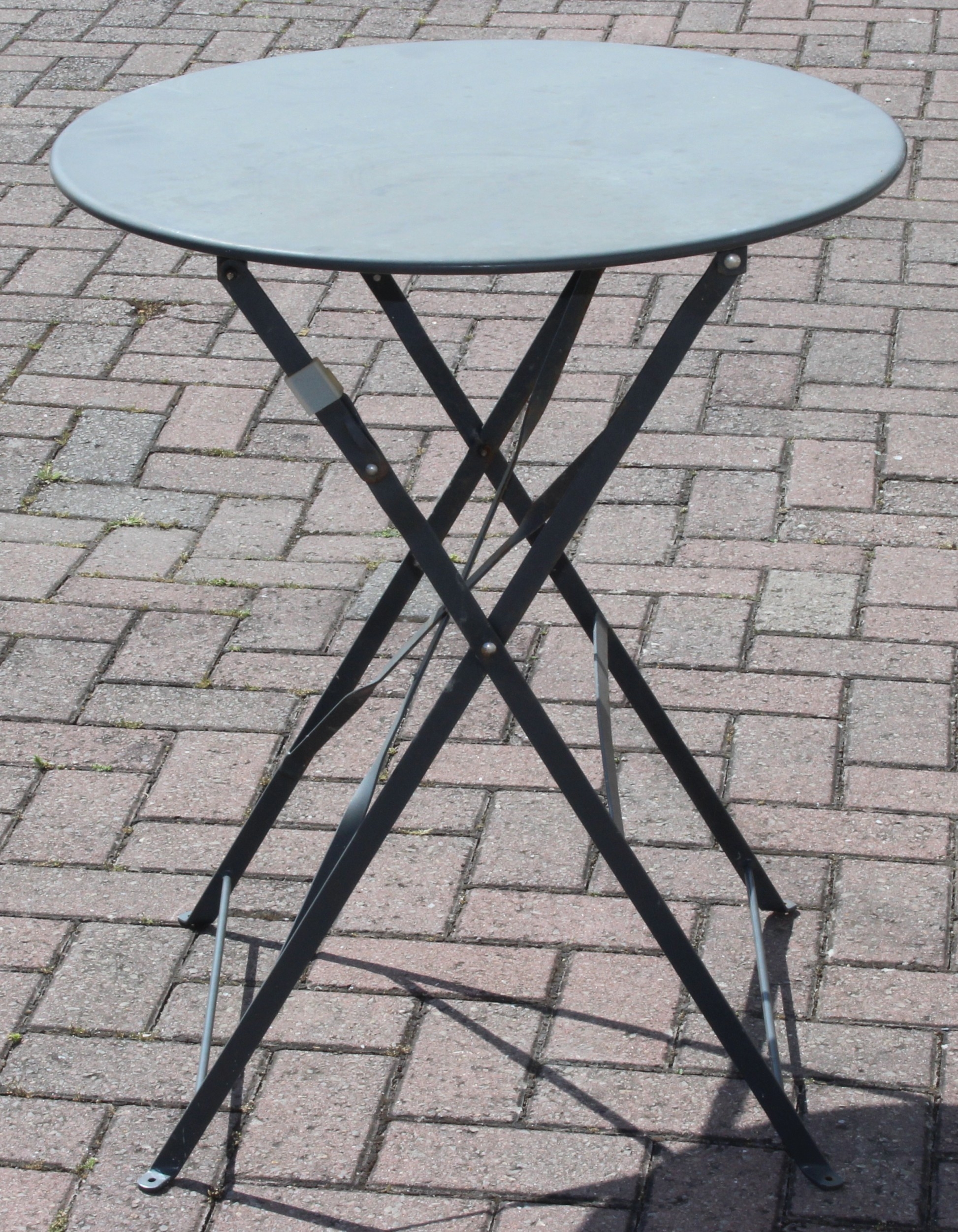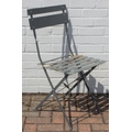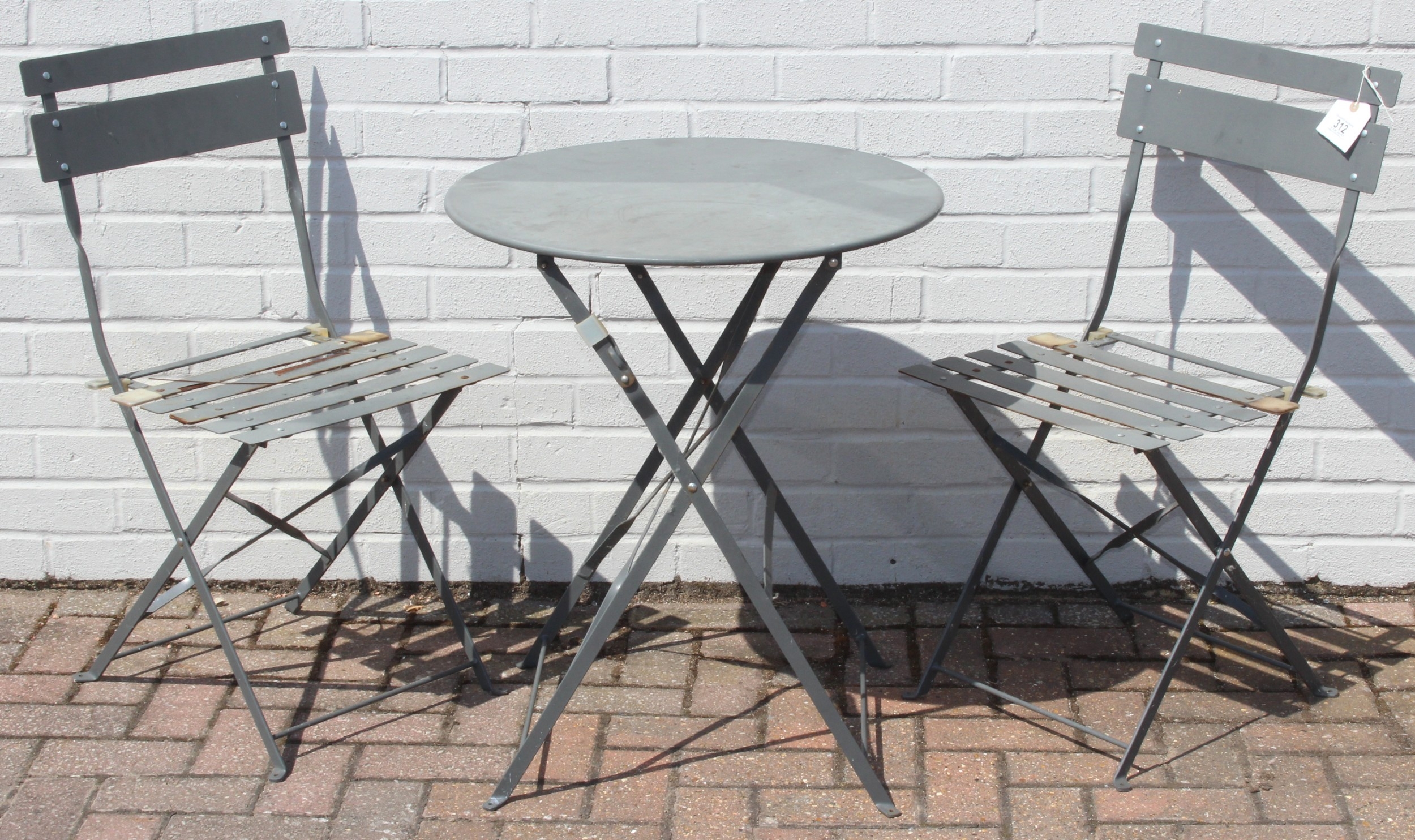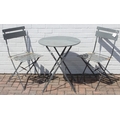 A folding metal bistro table and two folding chairs, the table 60cm in diameter