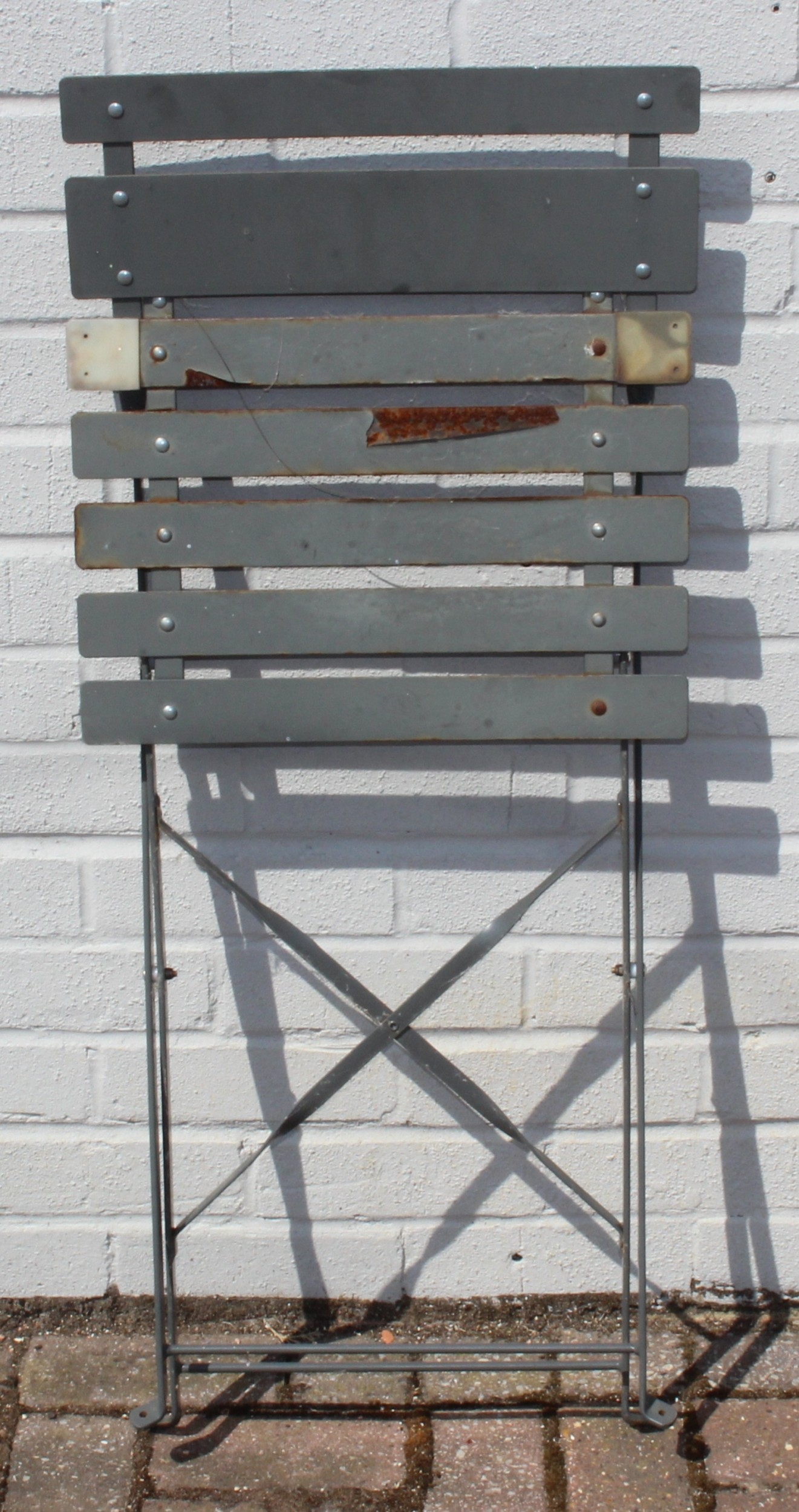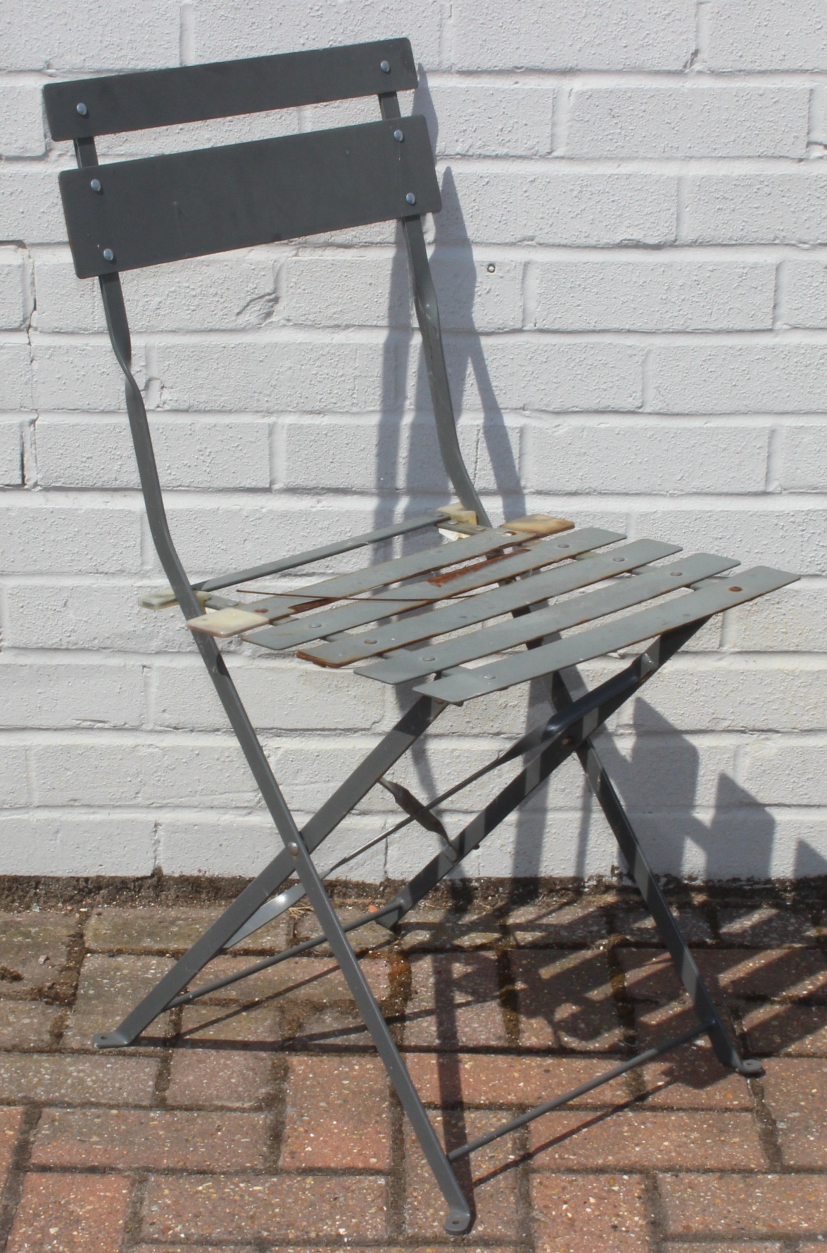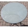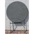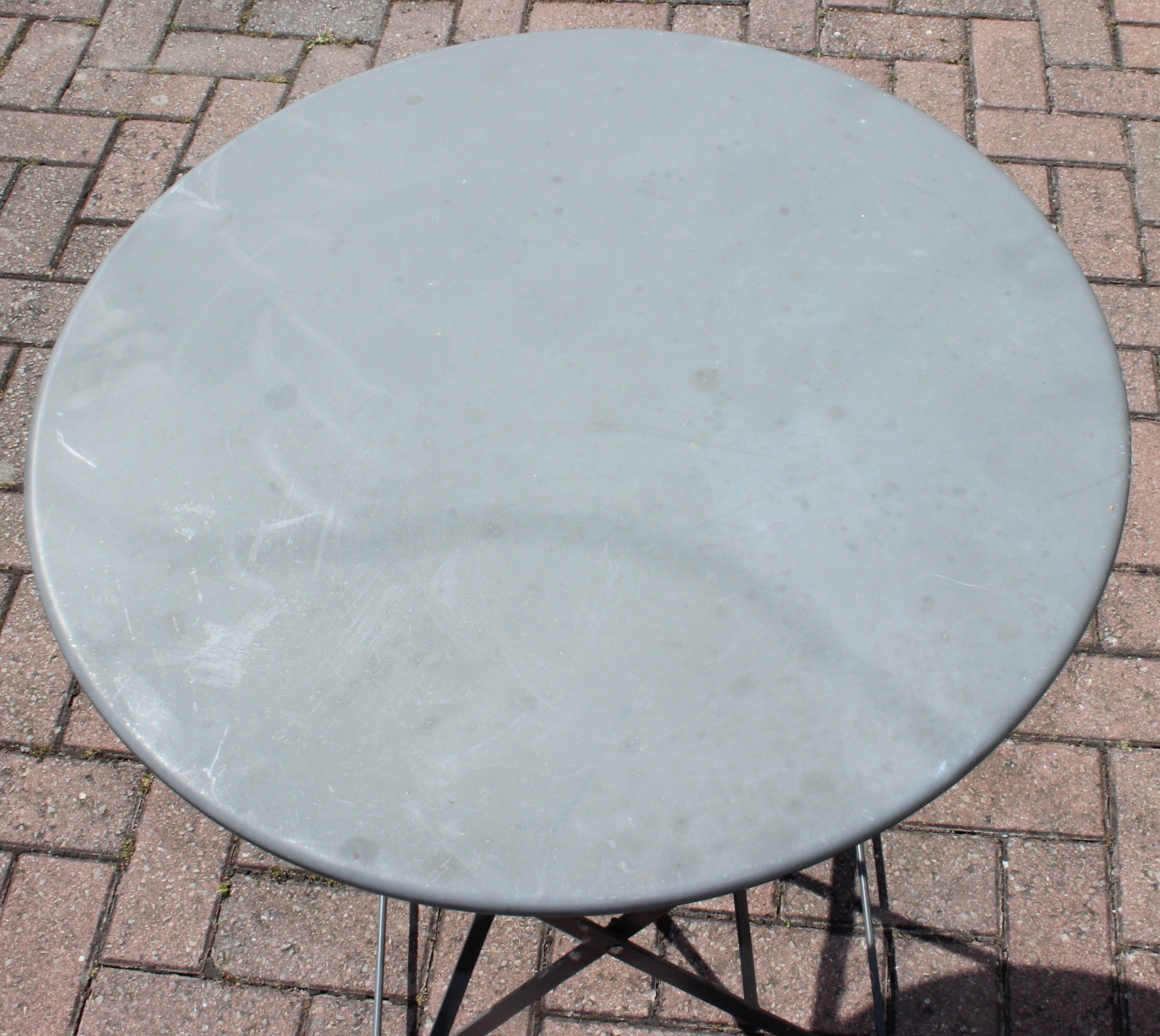 A folding metal bistro table and two folding chairs, the table 60cm in diameter