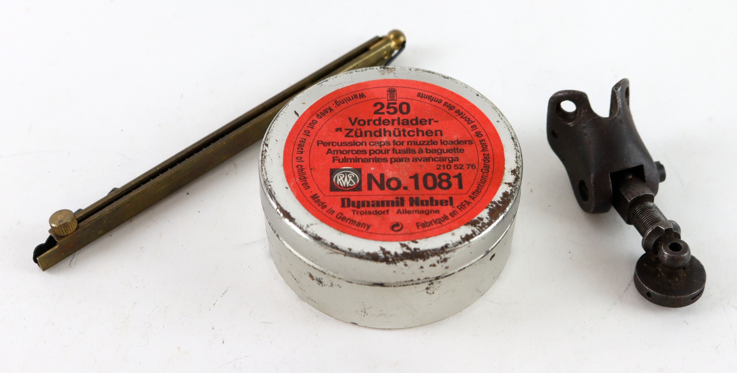 Vintage Gun related items including Parker Hale rifle sight cap dispenser, percussion cap tin etc.