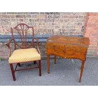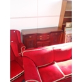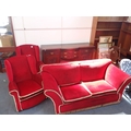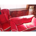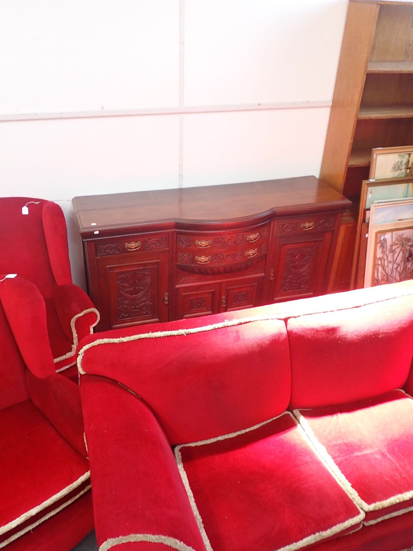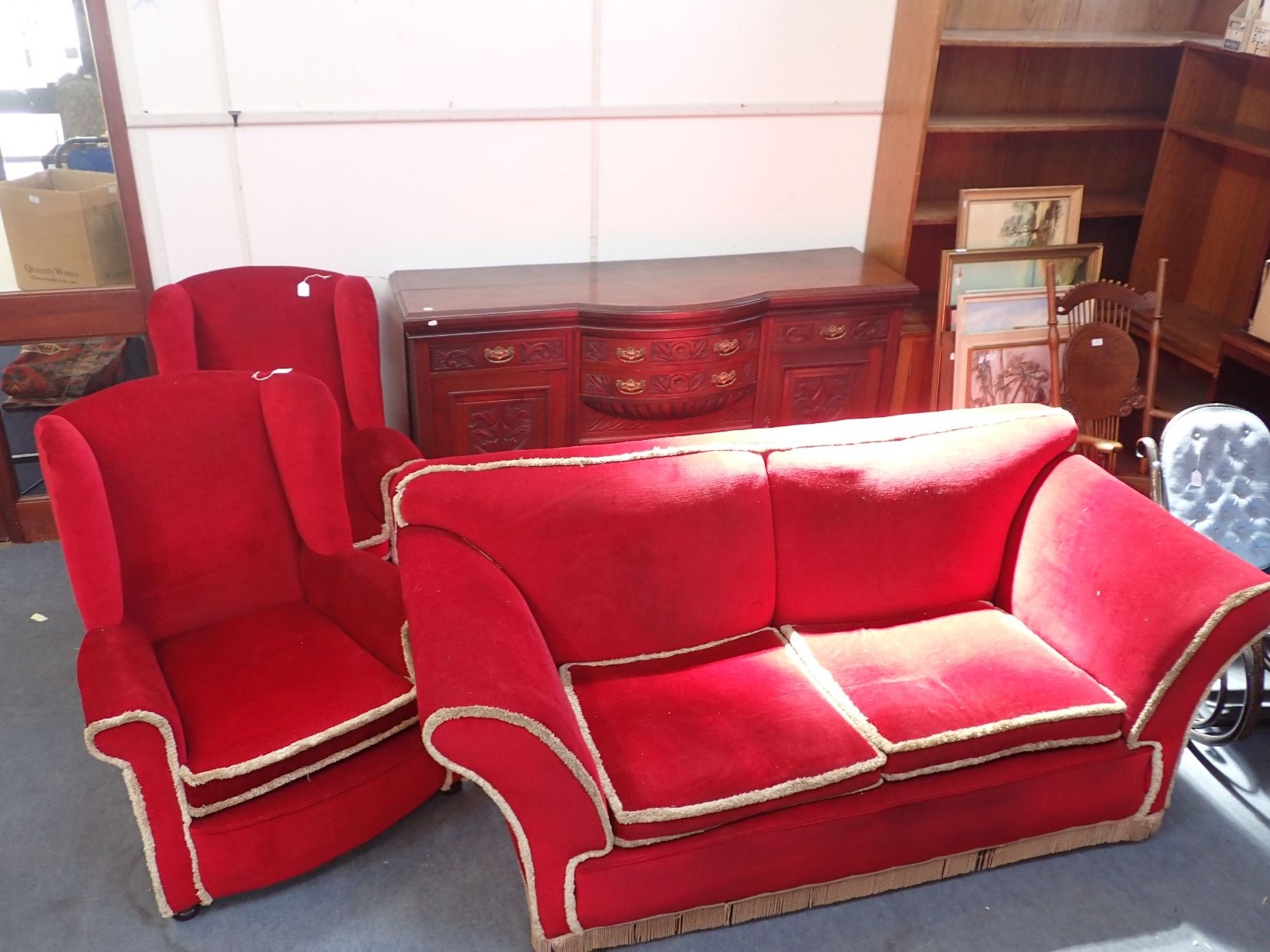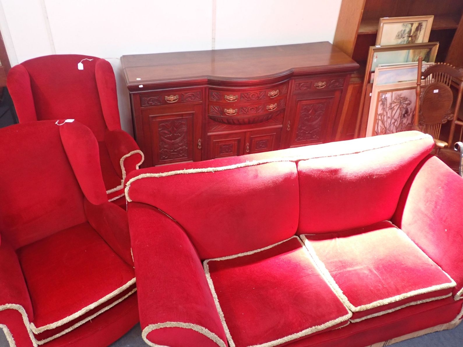 A 1920S SOFA, WITH LOW BACK AND SPLAYED ARMS, ON BUN FEET 198cm wide, with two wing armchairs, and a late Victorian sideboard
