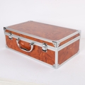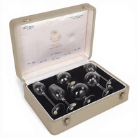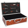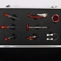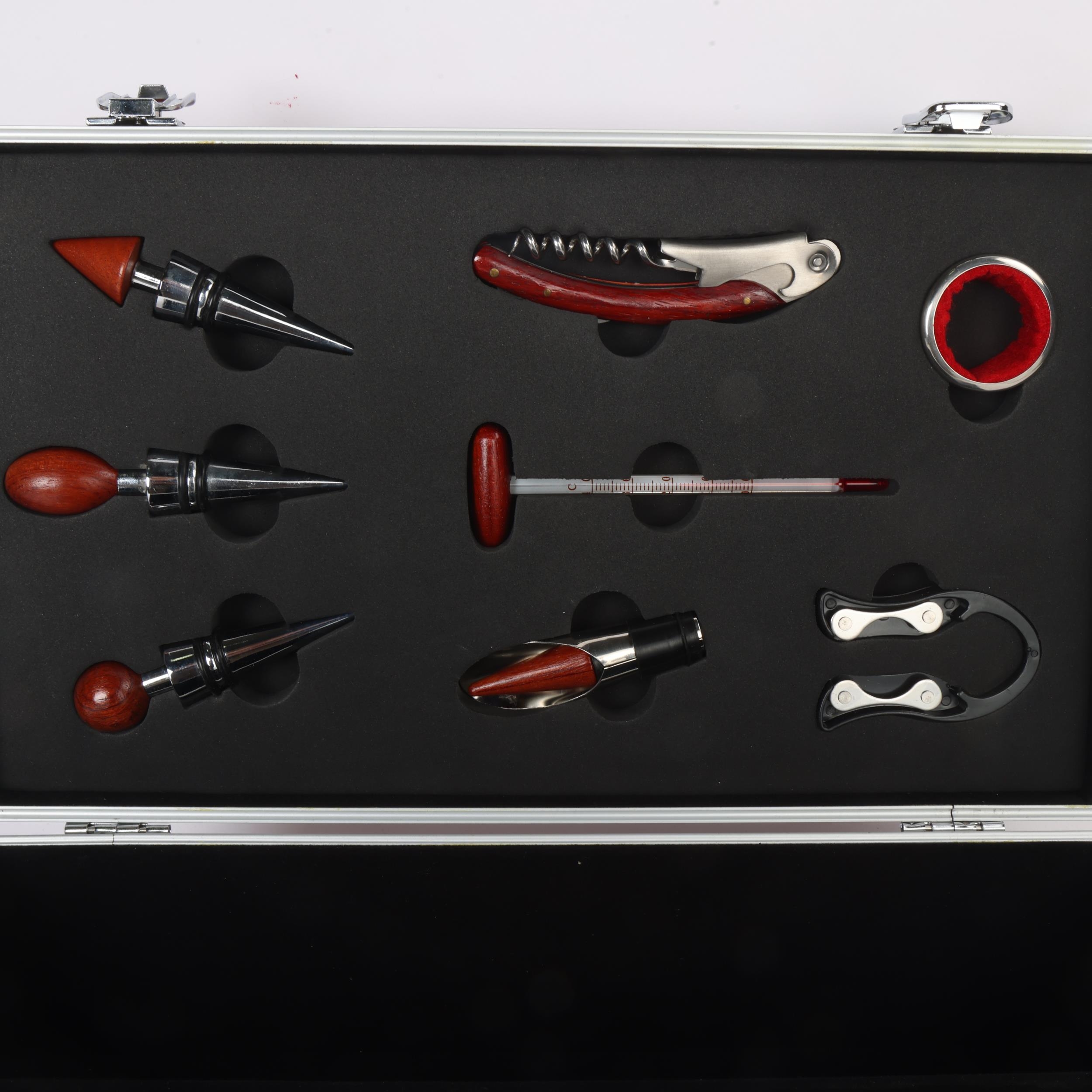 An 8 piece wine accessory set, stainless steel with hardwood handles, in aluminium and faux burr wood fitted case with space for two bottles of wine, in original packaging