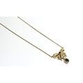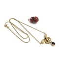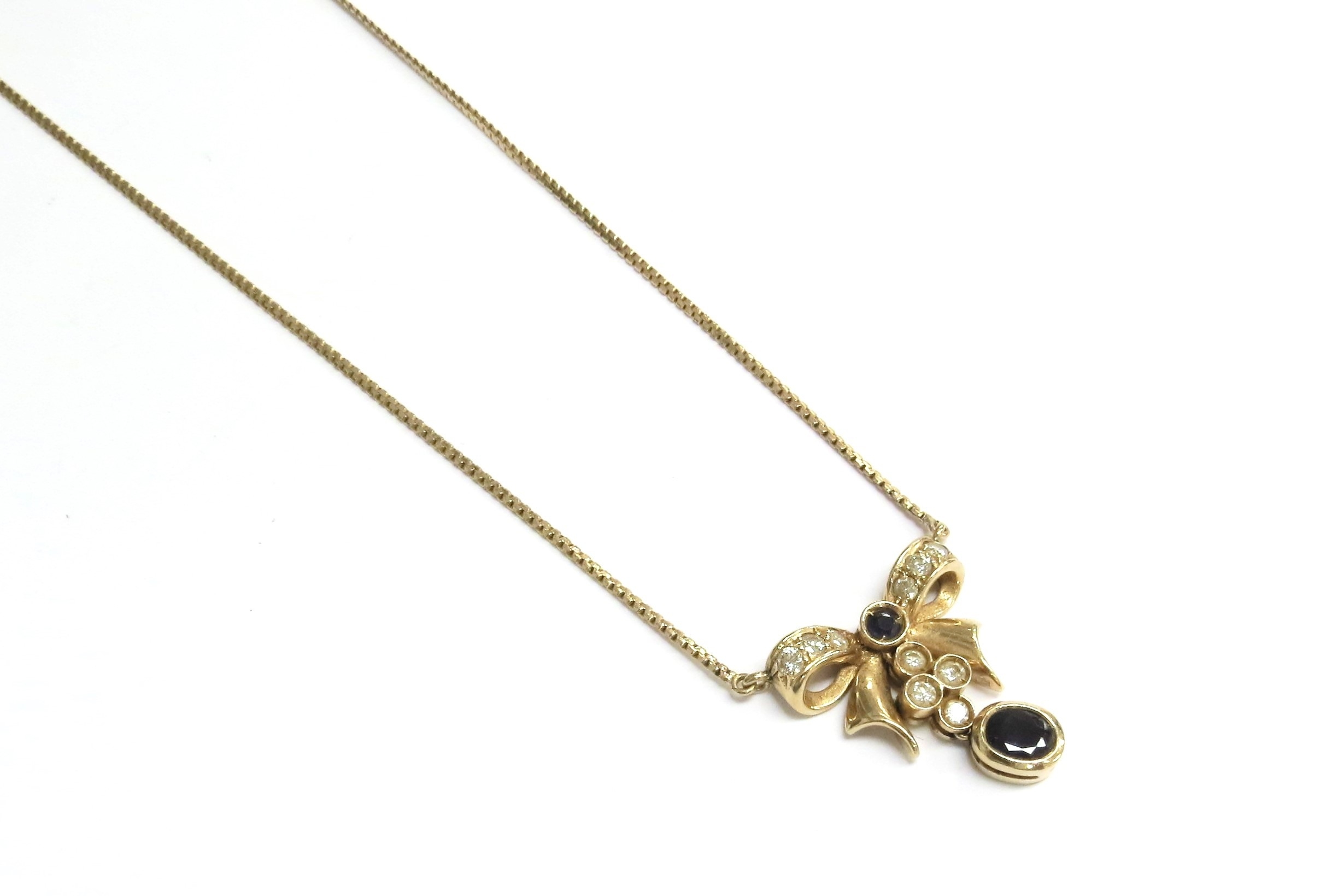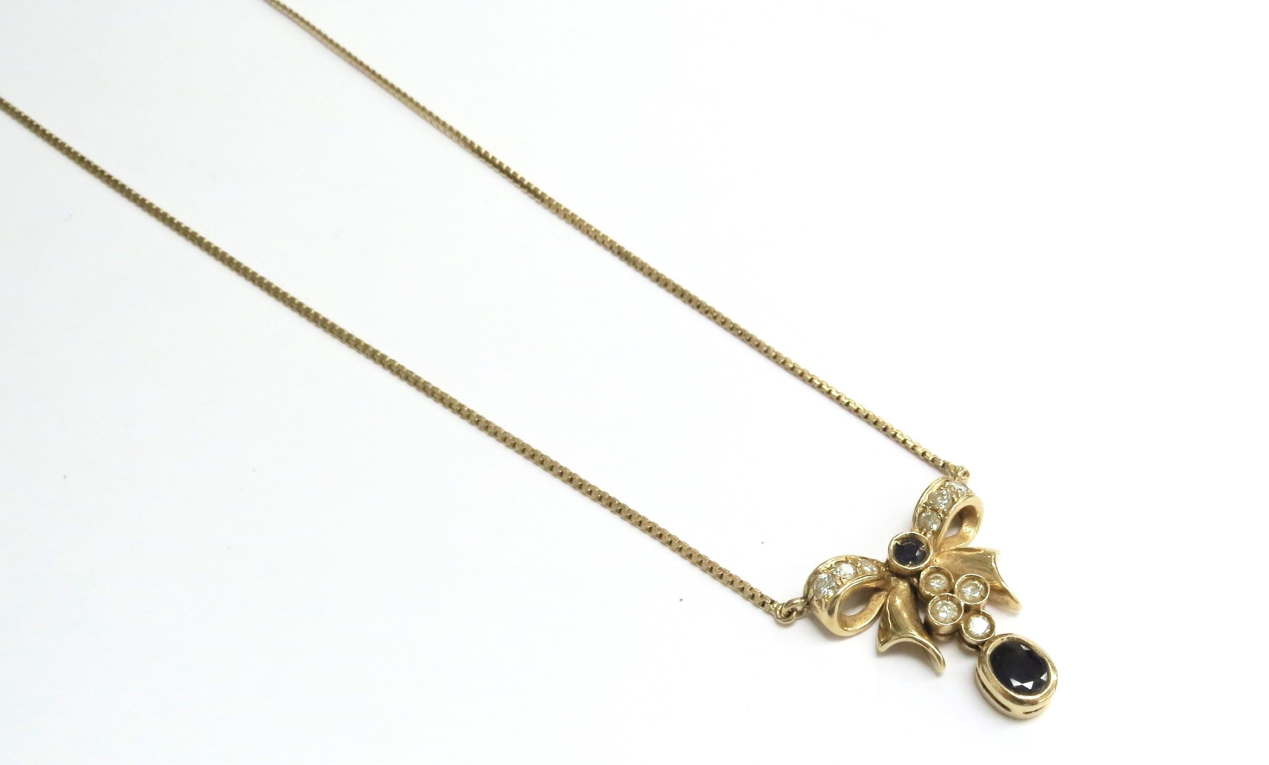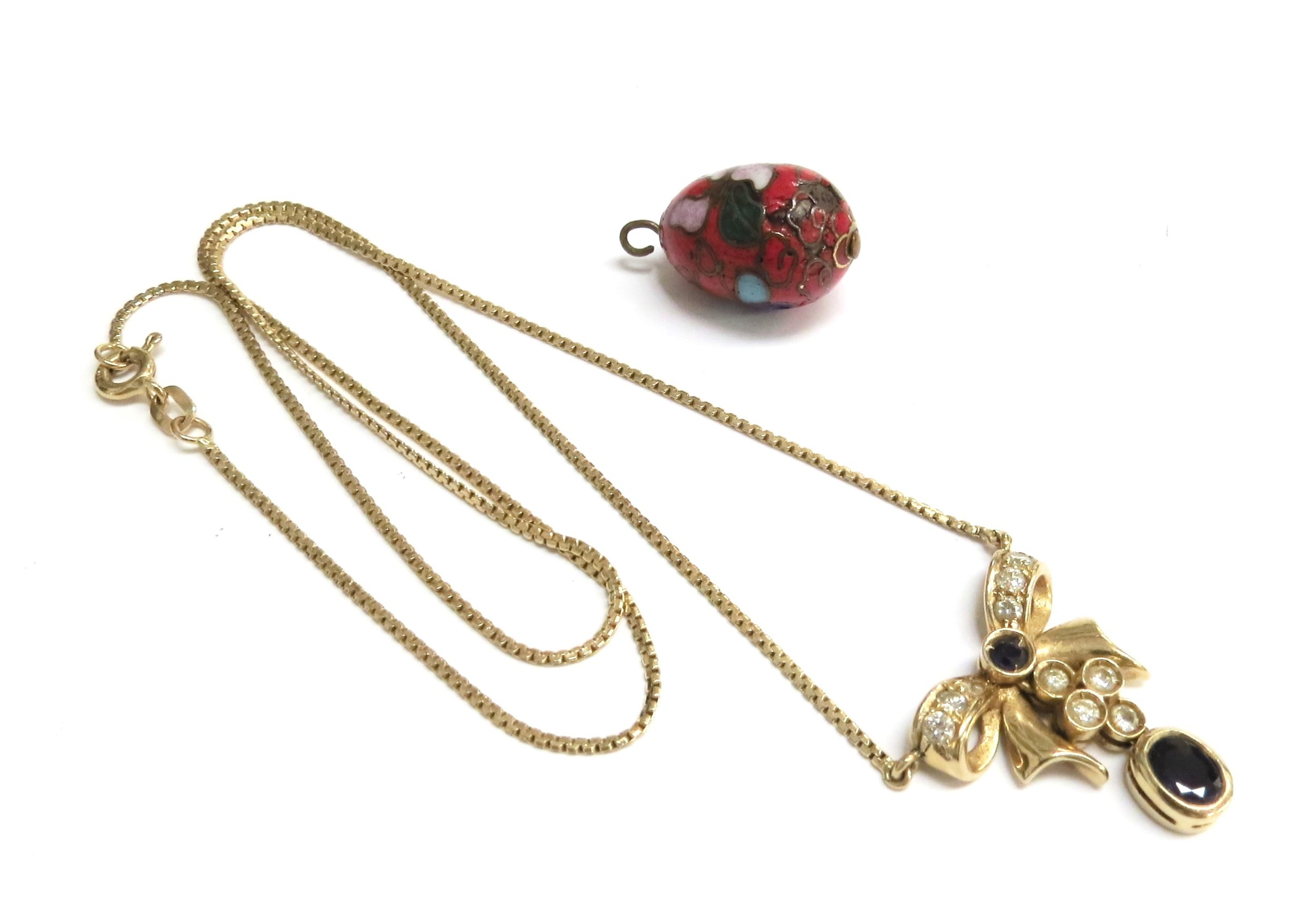 A 14ct gold necklace with a sapphire and diamond bow drop to centre, 42cm long, 5.6g and a cloisonne egg pendant