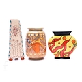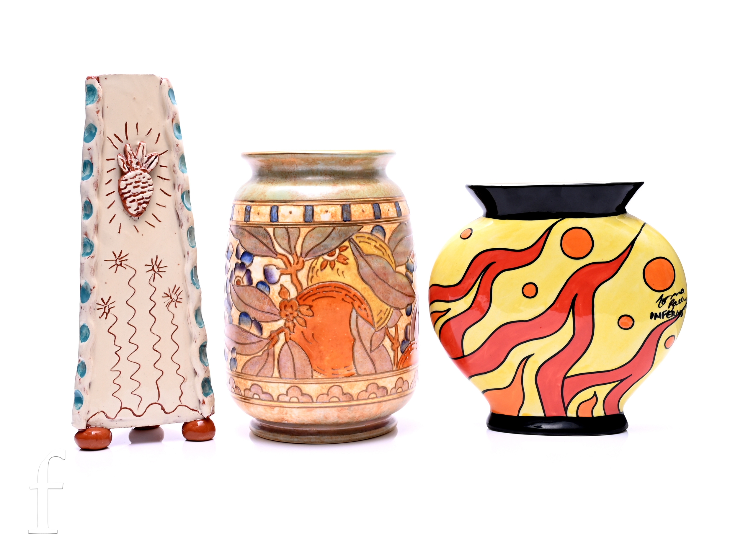 Lorna Bailey for Old Ellgreave Pottery, an Inferno pattern vase, of compressed shouldered form, decorated with red stylised flames over lemon ground, signed to body and printed marks to base, height 16cm, a studio pottery vase by Sarah Monk, tapered triangular form with applied and sgraffito decoration, on three ball feet, height 23cm, and a Bursley Ware vase designed by Charlotte Rhead, tube line decorated with citrus fruit and leaves over orange sponged ivory ground, height 19cm. (3)