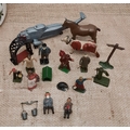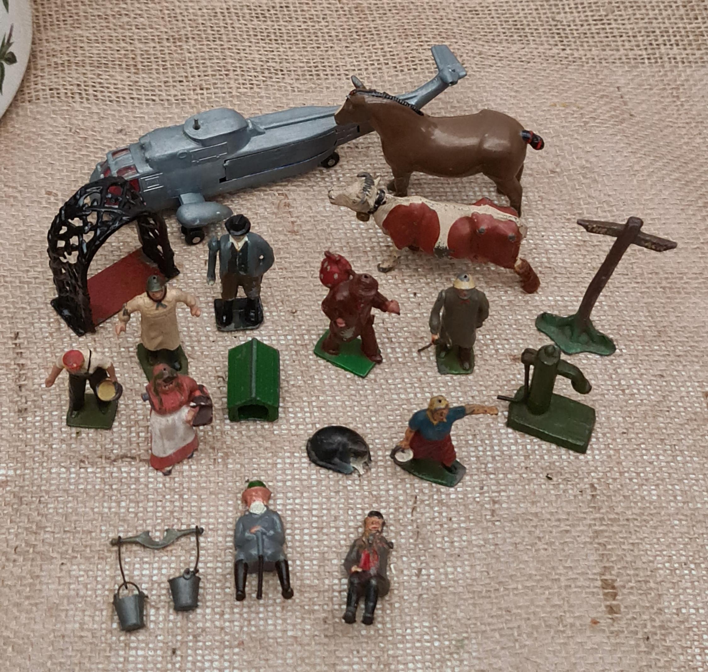 Vintage Die Cast Figures. Includes animals farmer hands, sign posts and equipment. 18 items in total. The largest, a horse, measures 9cm in length. Shipping is available. Please ask for a quote before bidding. Where possible we combine shipping costs. Remember, if you are the highest bidder above reserve on this Lot you have bought the item and are legally responsible for the item. Viewing is recommended in either person or via video link. Contact us to arrange.