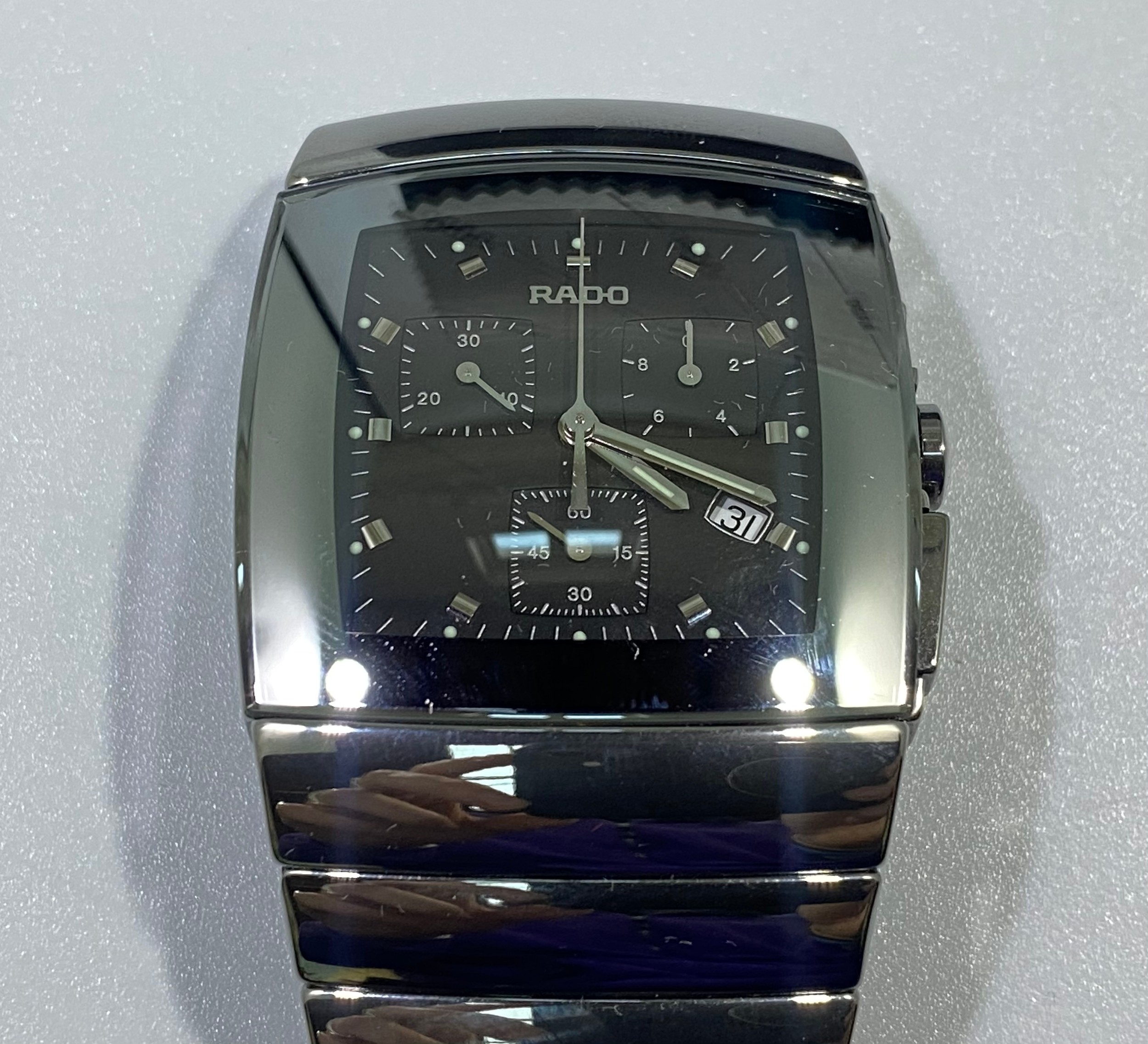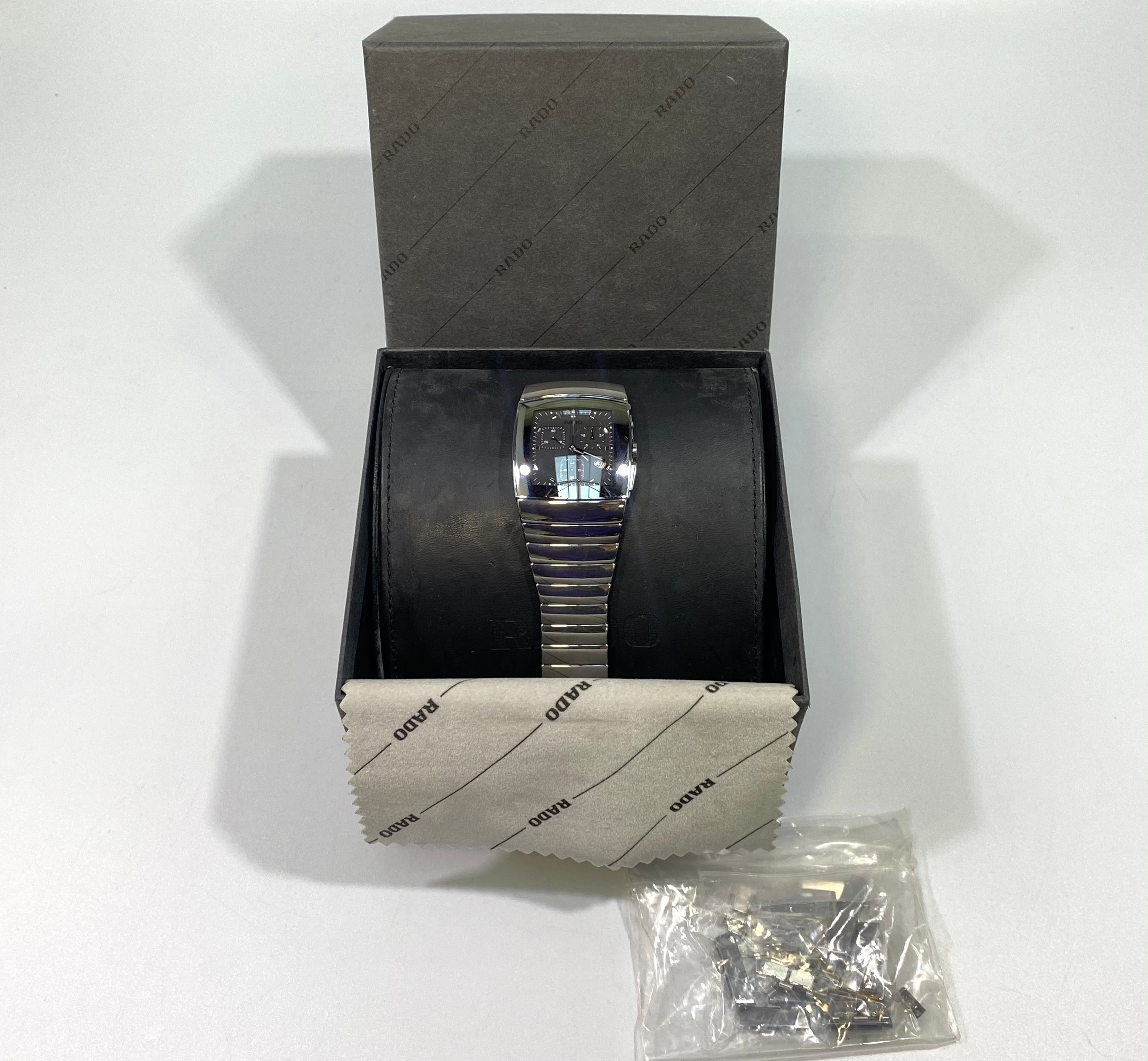 A Rado Diastar quartz chronograph wristwatch, the black enamel dial with batons denoting hours, three subsidiary dials and date aperture at 4 o’clock position, on integral bracelet, with fitted box, outer card box, guarantee and original warranty card and instructions etc.
