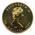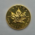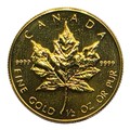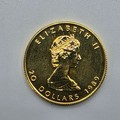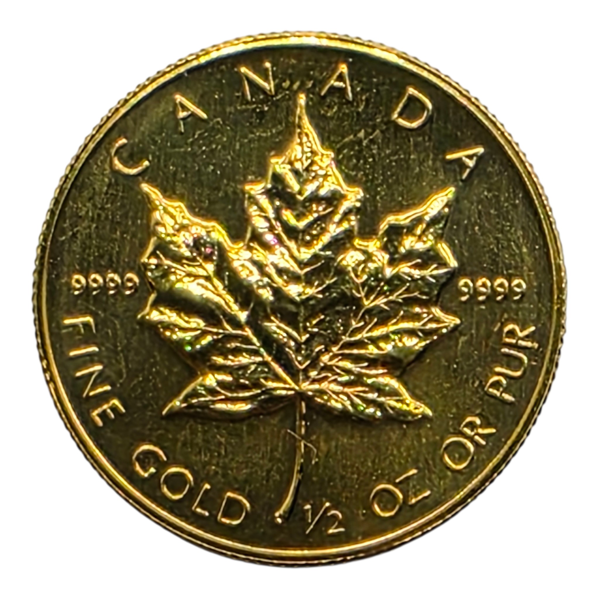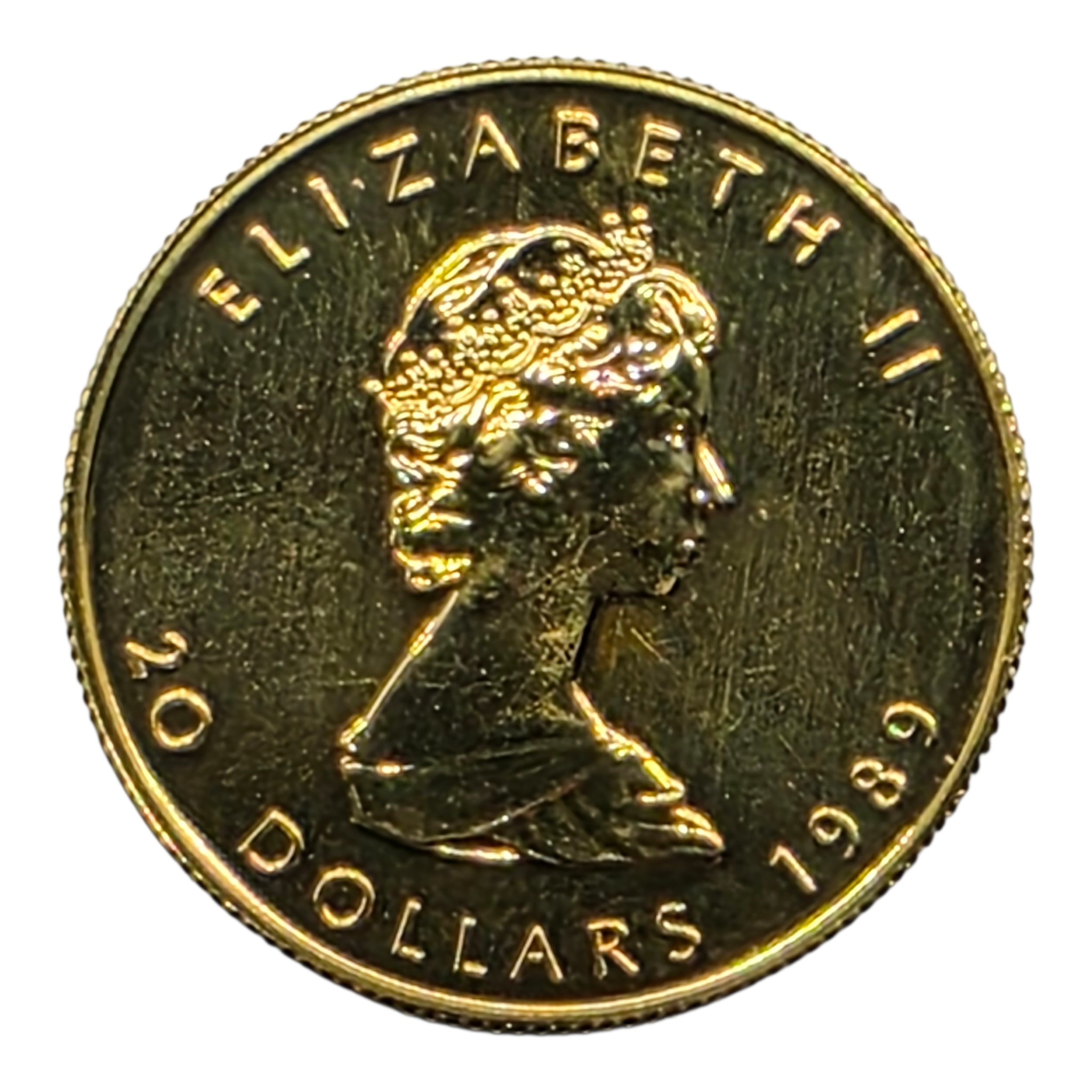 A Canadian Fine half ounce 999.99 24ct gold 20 dollar 1989 Elizabeth II maple leaf coin. 15.5g.