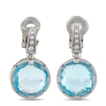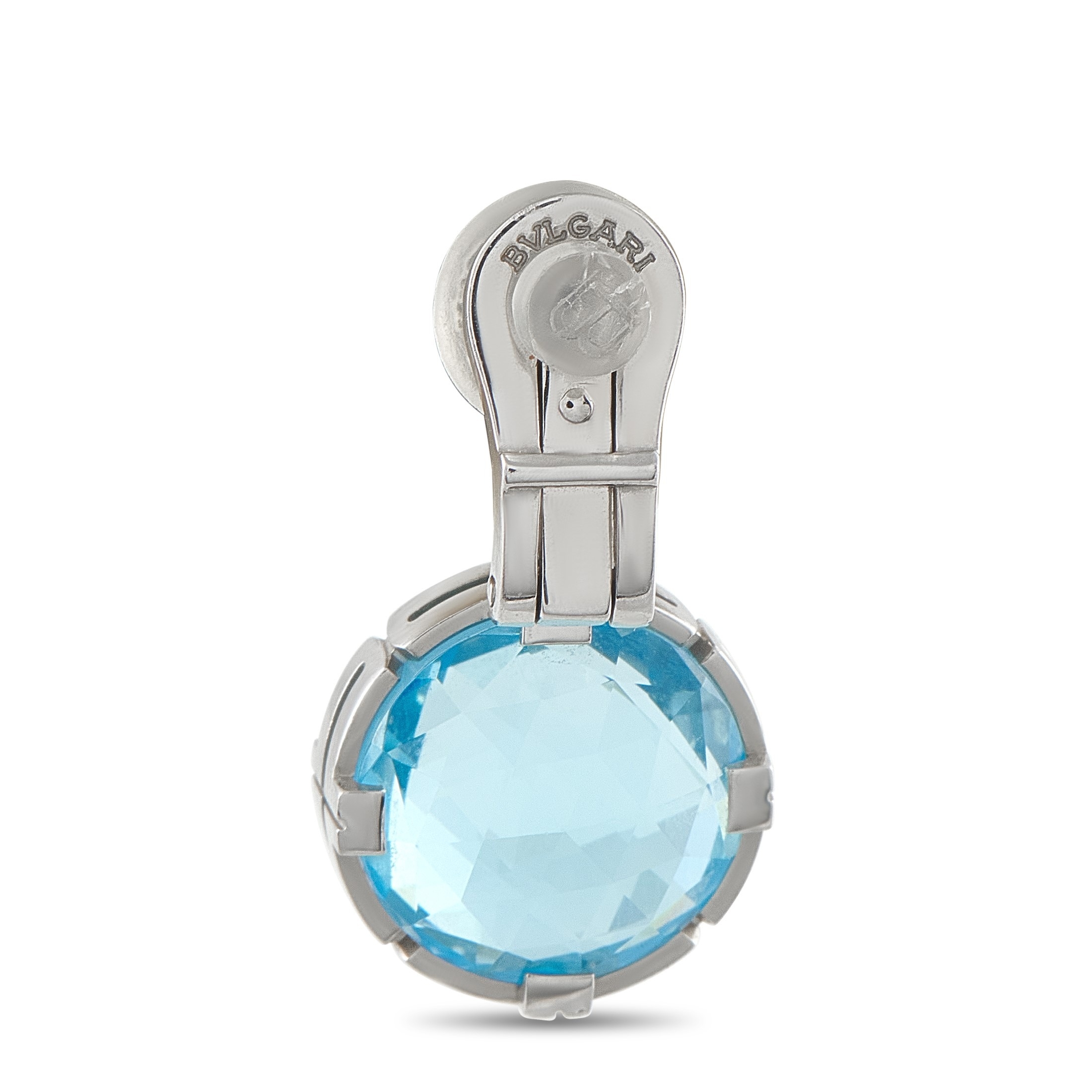 A pair of Bvlgari Parentesi 18K White Gold Diamond and Topaz Clip-On Earrings. Translucent blue Topaz gemstones, 18K White Gold settings. Each earring measures 1.0inches long by 0.57inches wide and includes clip on closure. Good Condition and includes a gift box. Total weight: 15.4 grams. *This item is held at Cadmore USA Office in Pennsylvania, USA and will be shipped from there. Buyers will be responsible for direct shipping payments.*