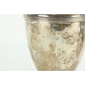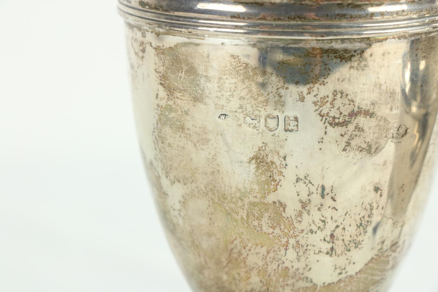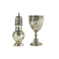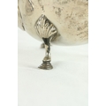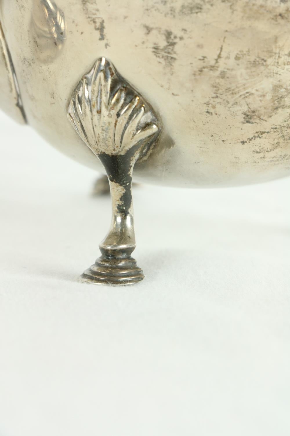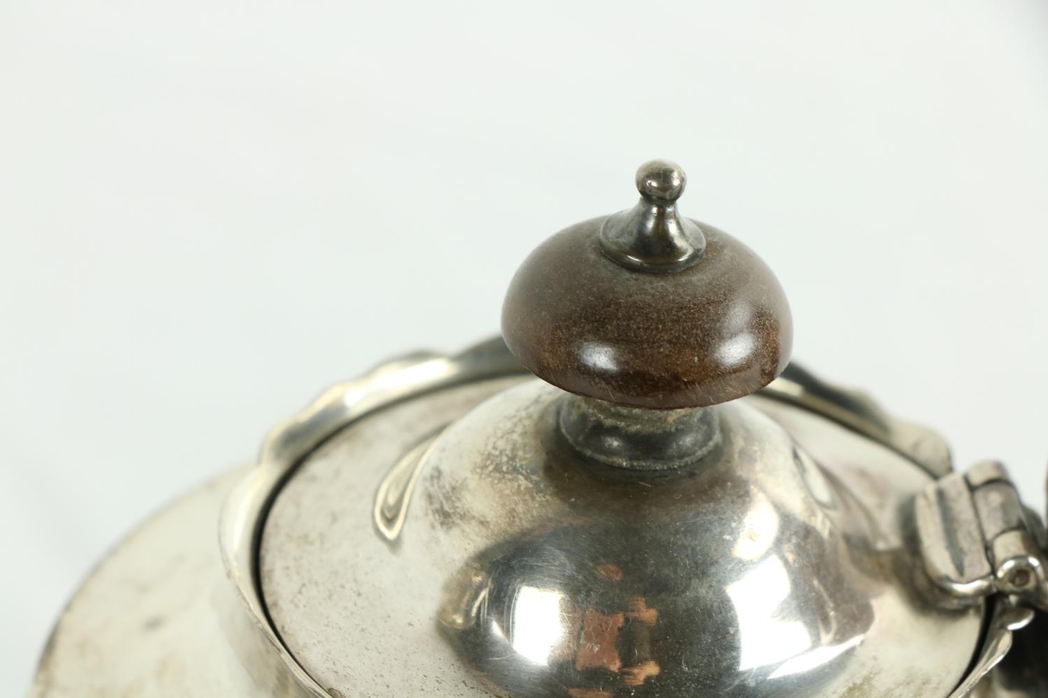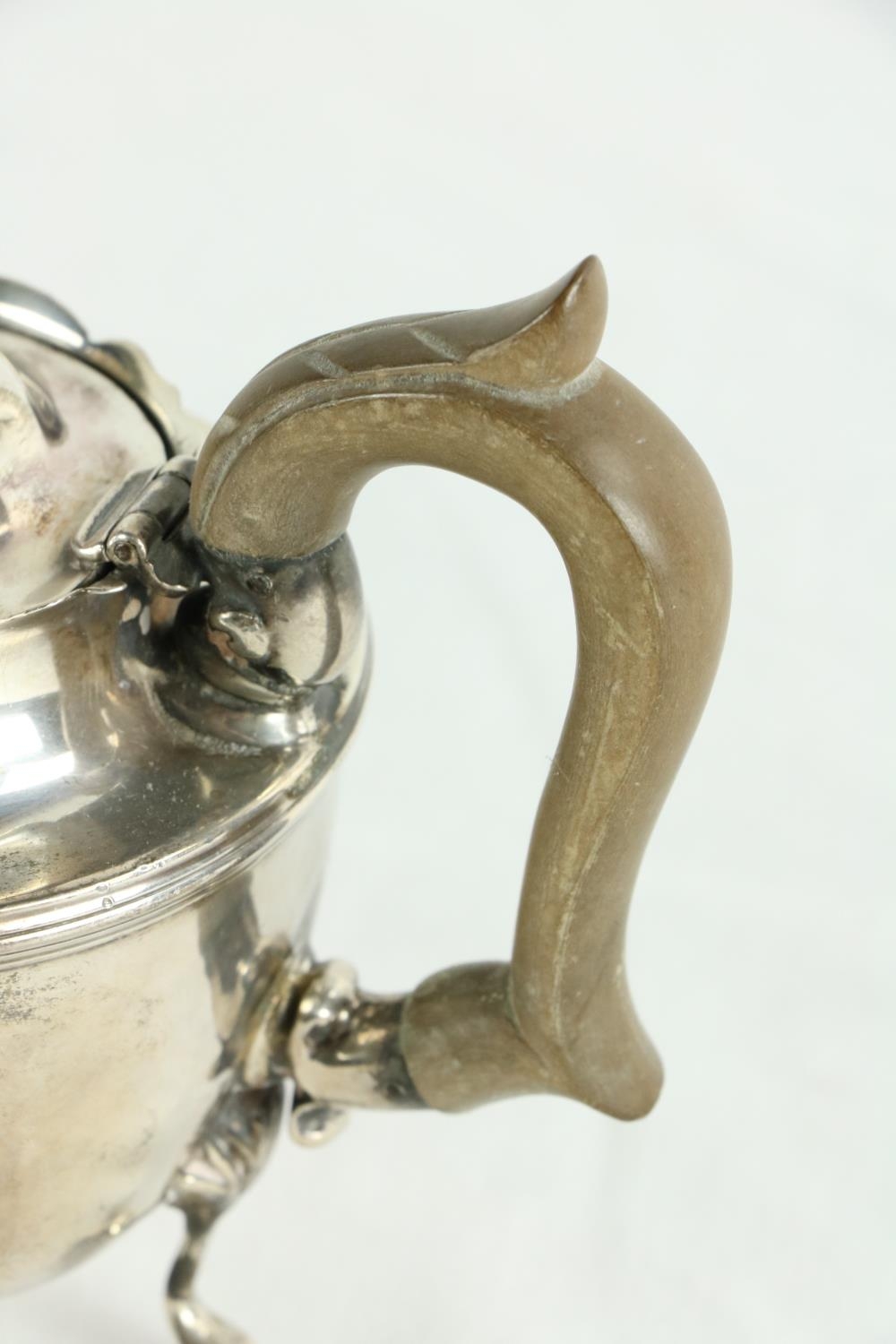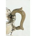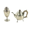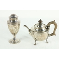 A silver vase shaped Castor Sugar Shaker, London 1904 by W. Comyns & Sons, 6" (15cms), 125 grams; together with a small silver Teapot on three shell feet and wooden handle, 298 grams overall. (2)