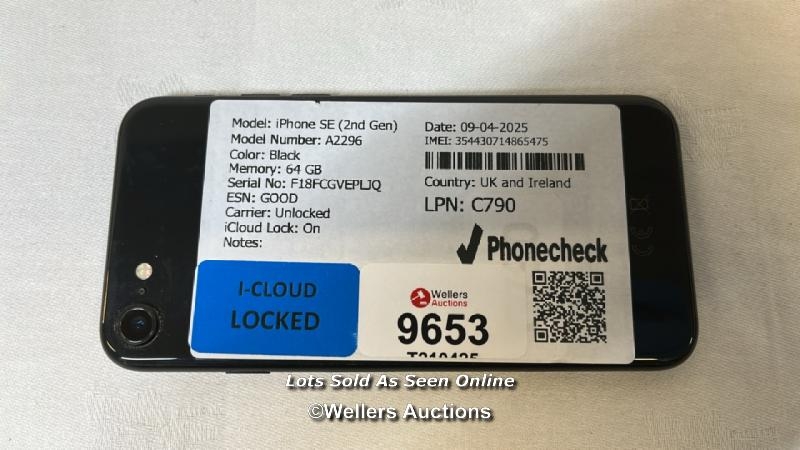 IPHONE SE(2ND GEN) A2296/ BLACK/64GB/ IMEI-354430714865475 (I-CLOUD LOCKED)