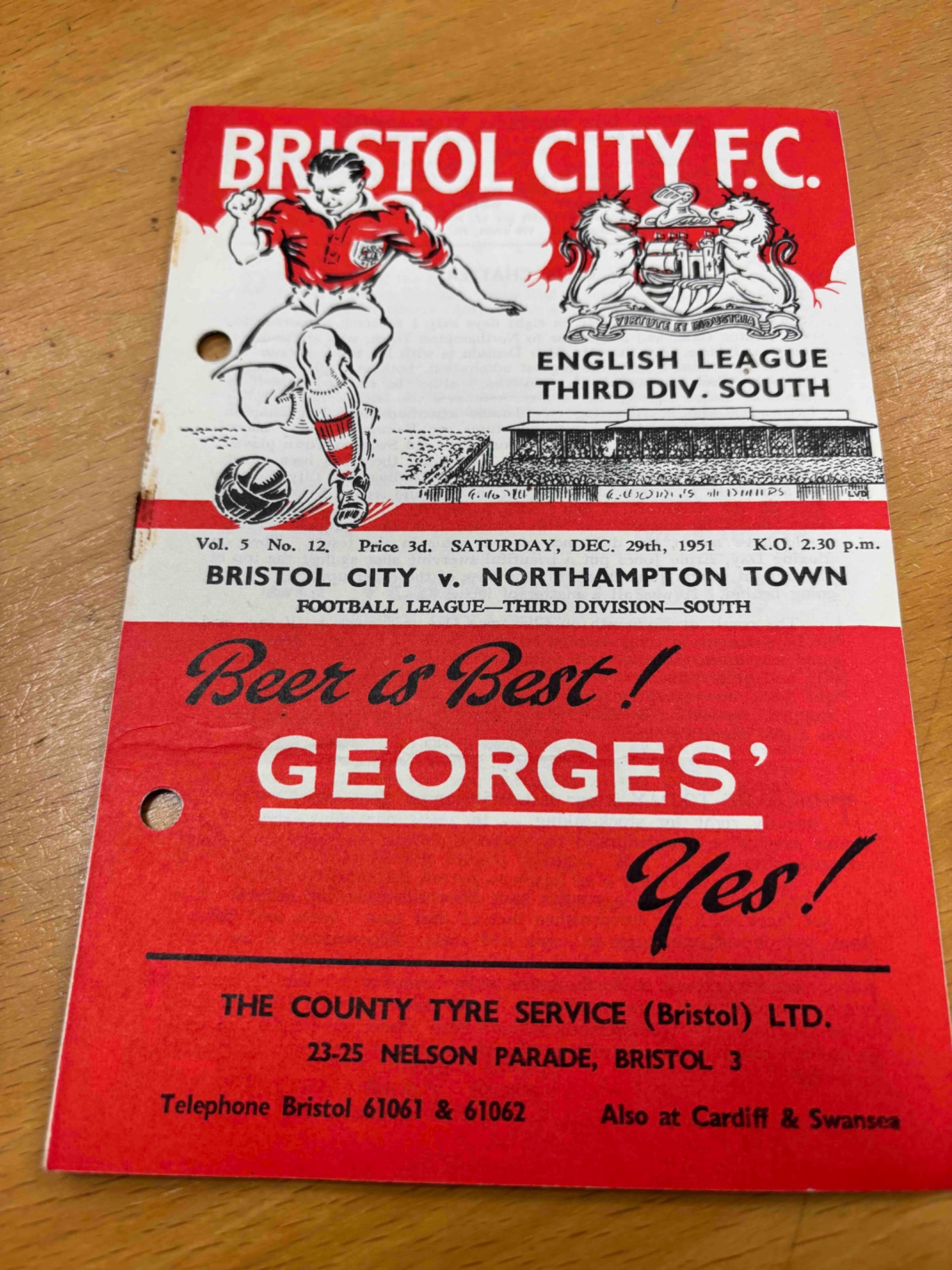 1951/52 Bristol City v Northampton Town. PH, clean inside.