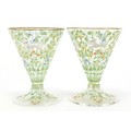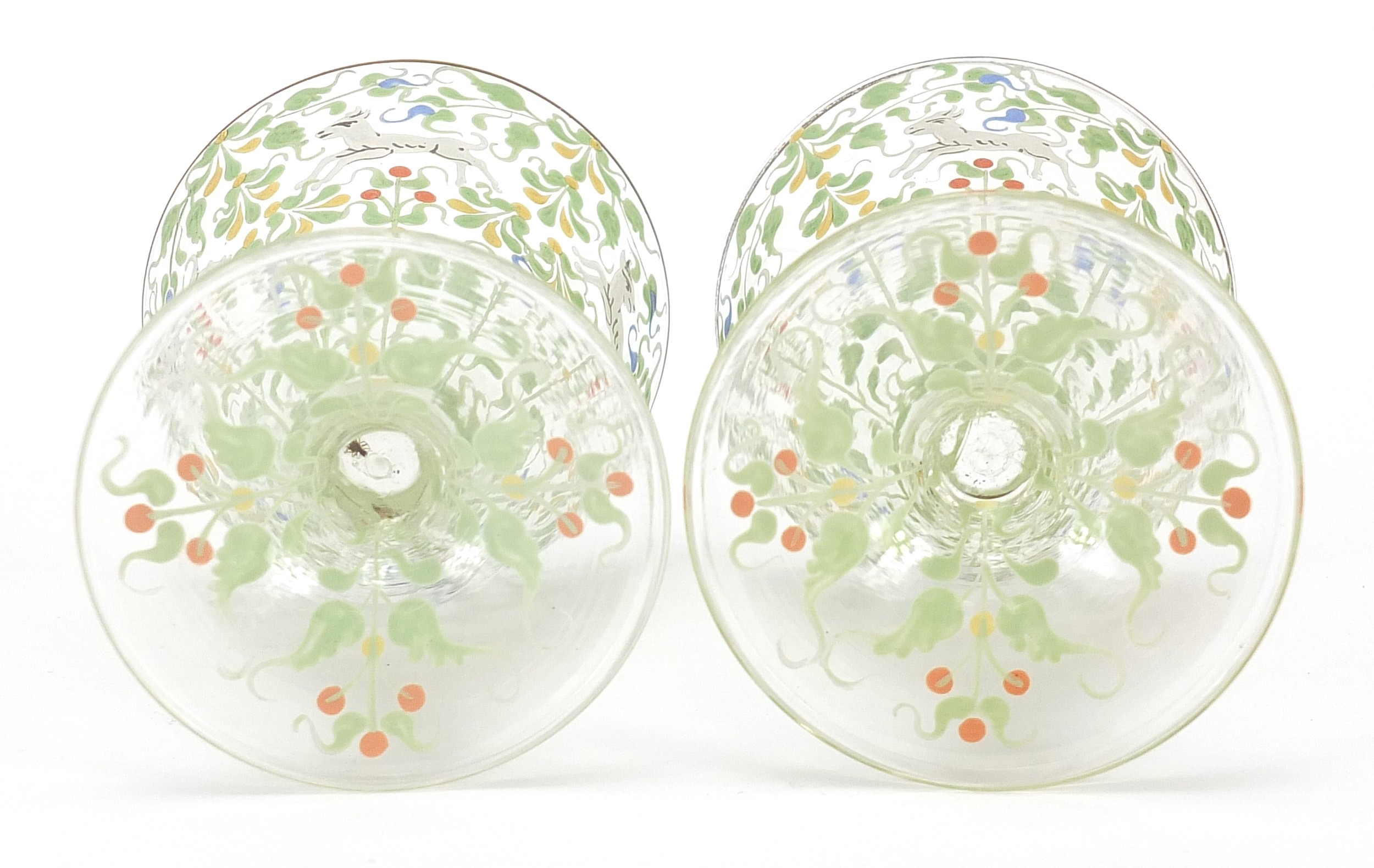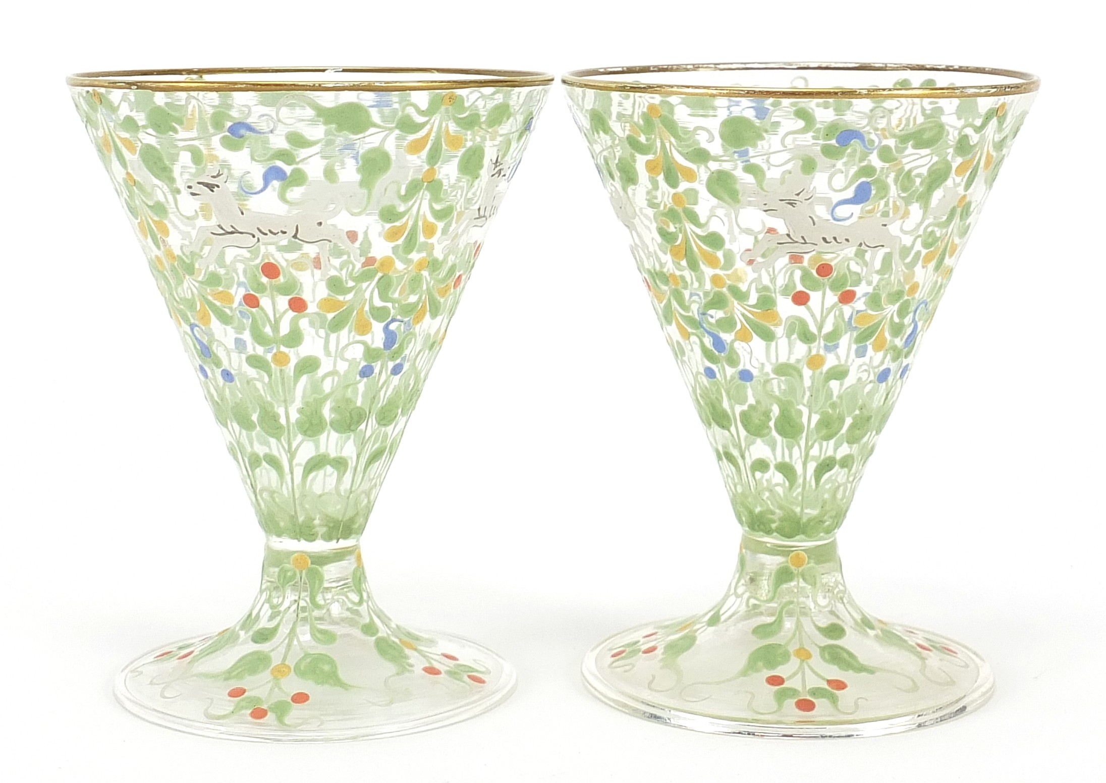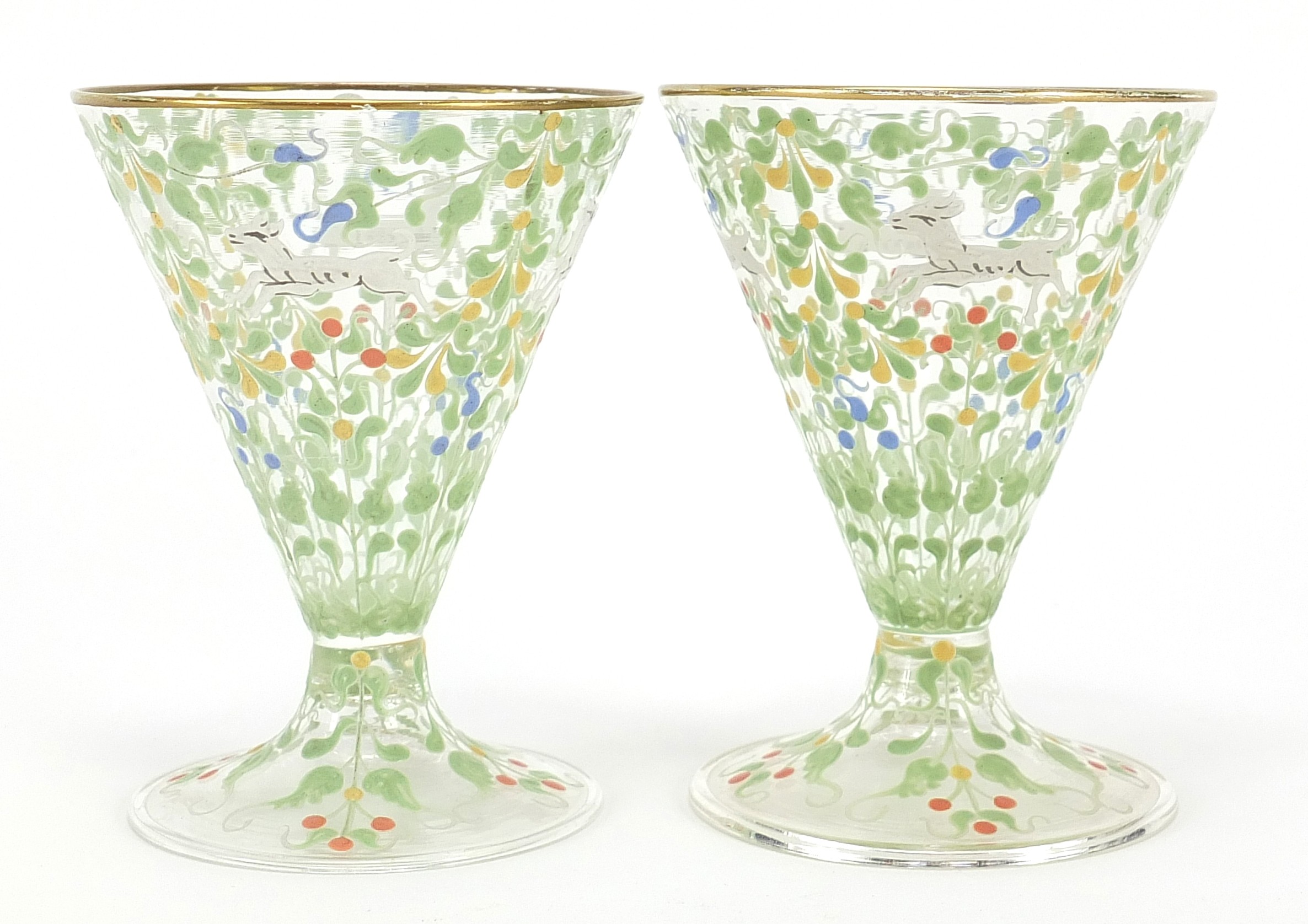 Pair of Bohemian cocktail glasses in the manner of Moser, each enamelled with wild animals amongst flowers, each 9cm high