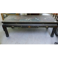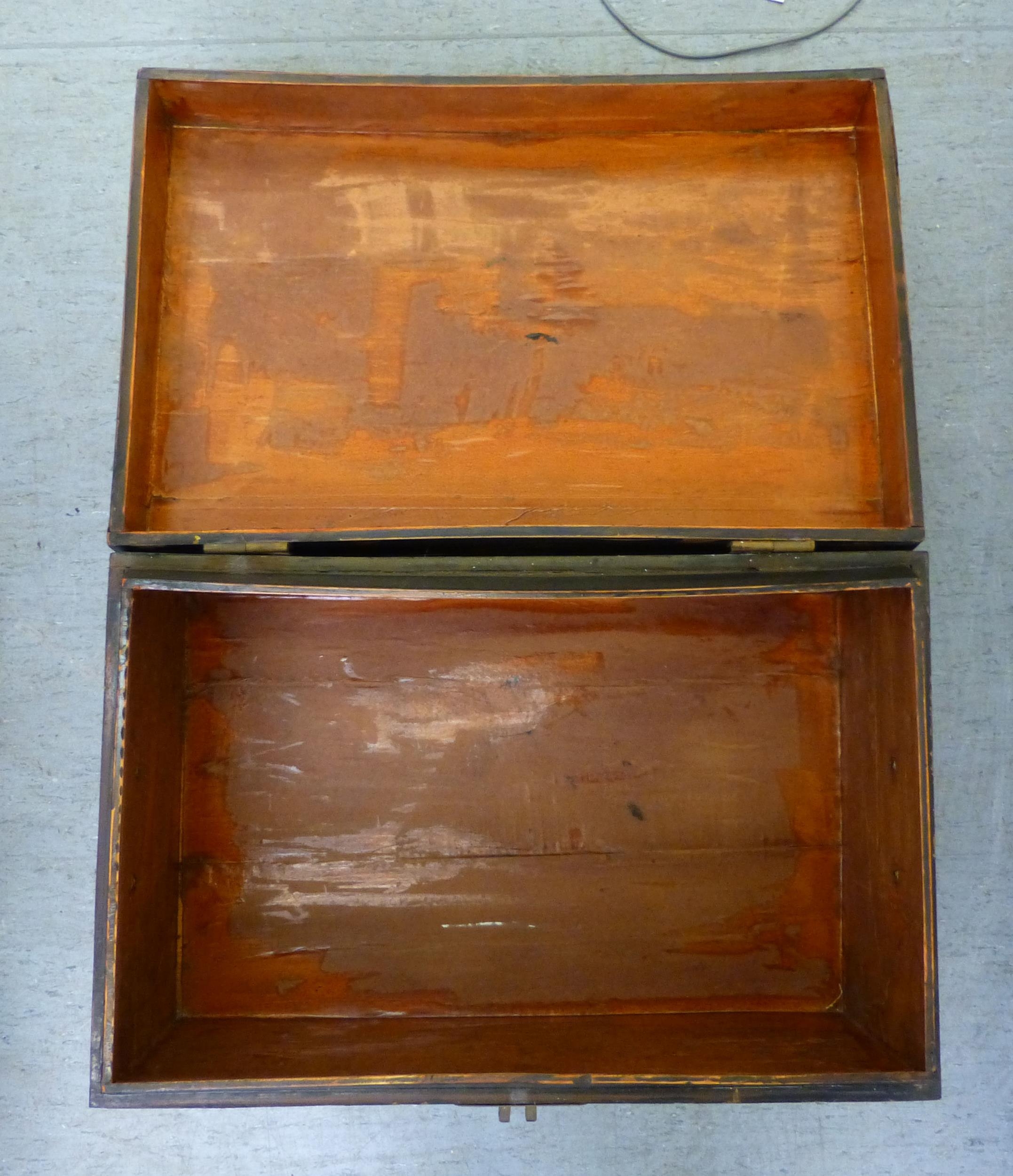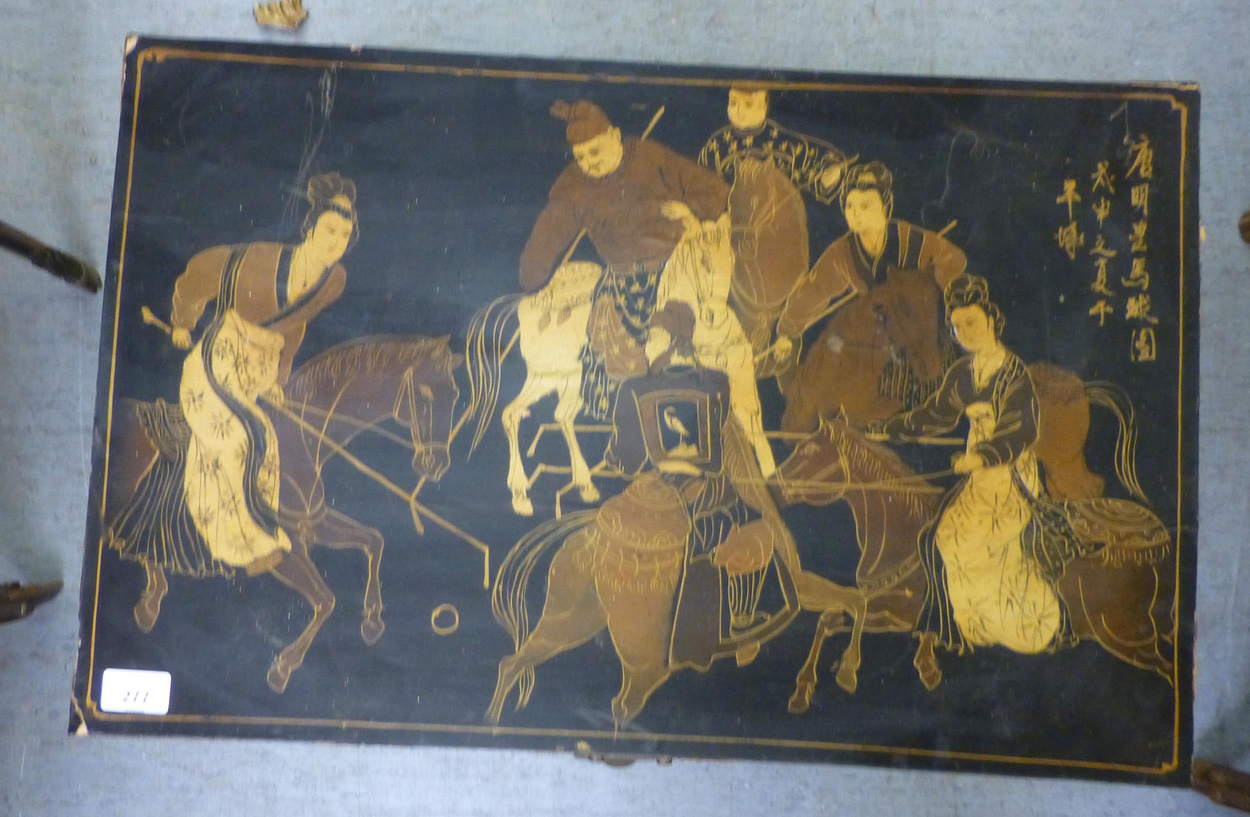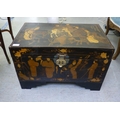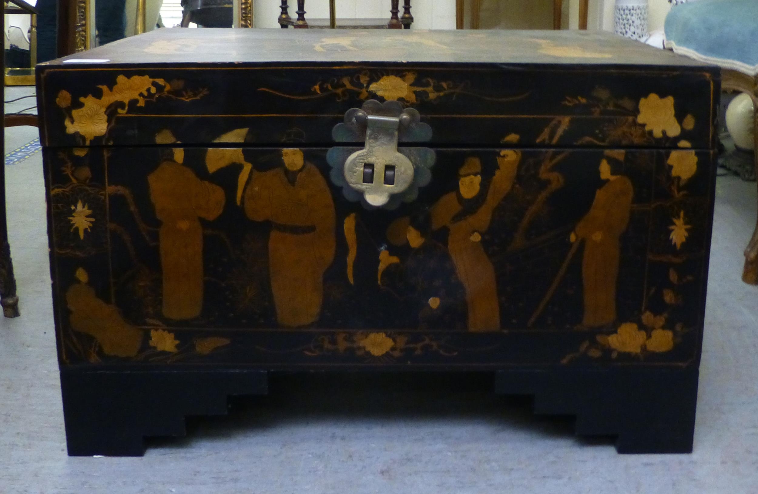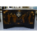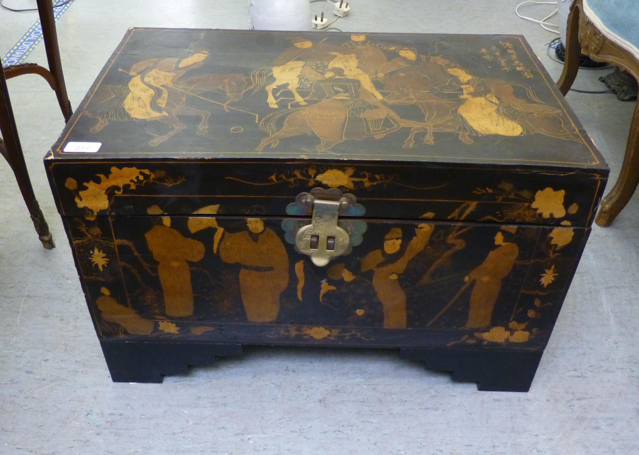 A modern chinoiserie design black lacquered chest, decorated with figures on horseback 15.5"h 25"w